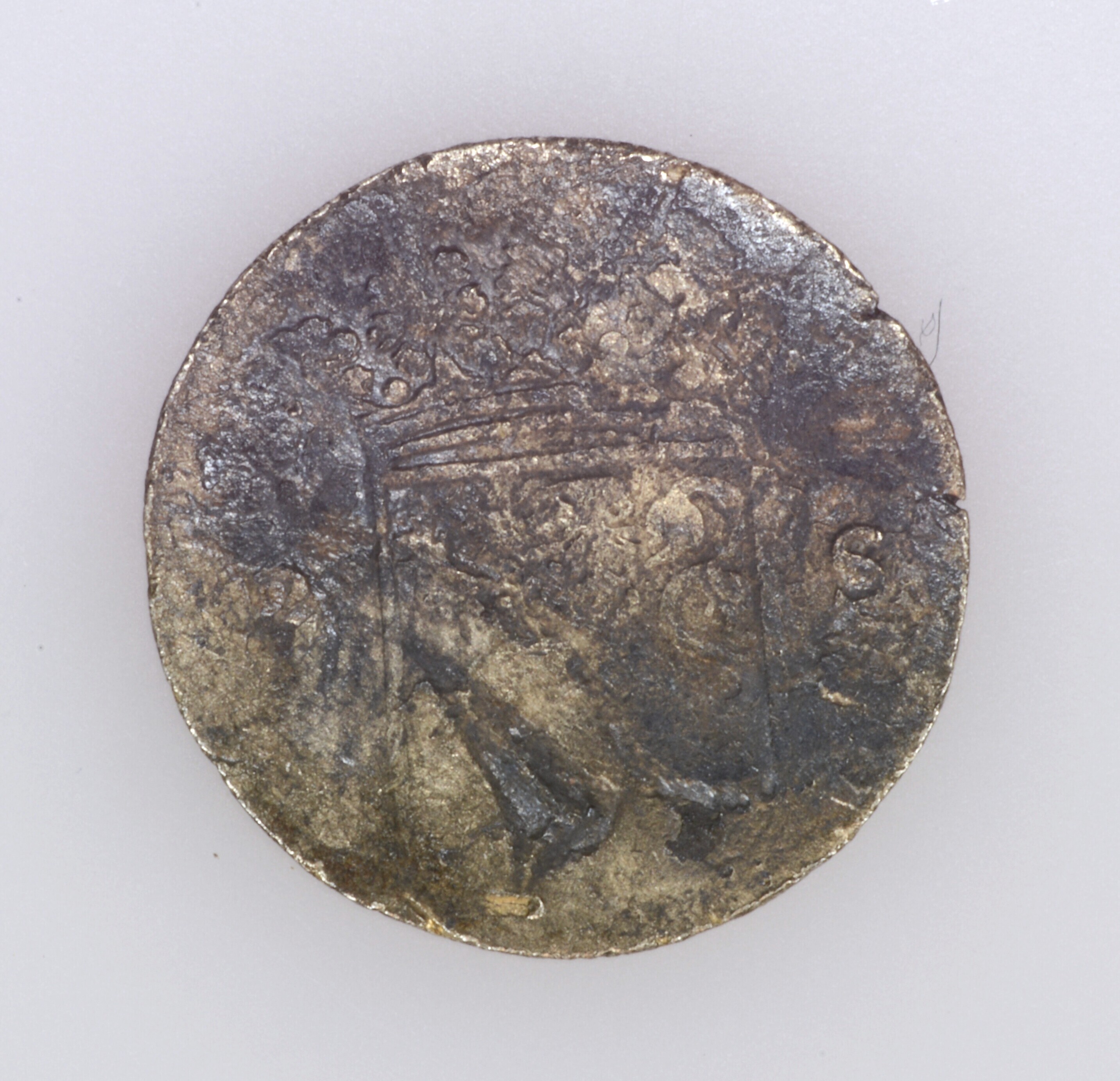 Dubbele stuiver Holland; vz.: H(O)L (LA)N (DIA) in drie regels met hieronder het jaartal (1)69(?); kz.: gekroond wapen met Hollandse leeuw tussen 2 en S