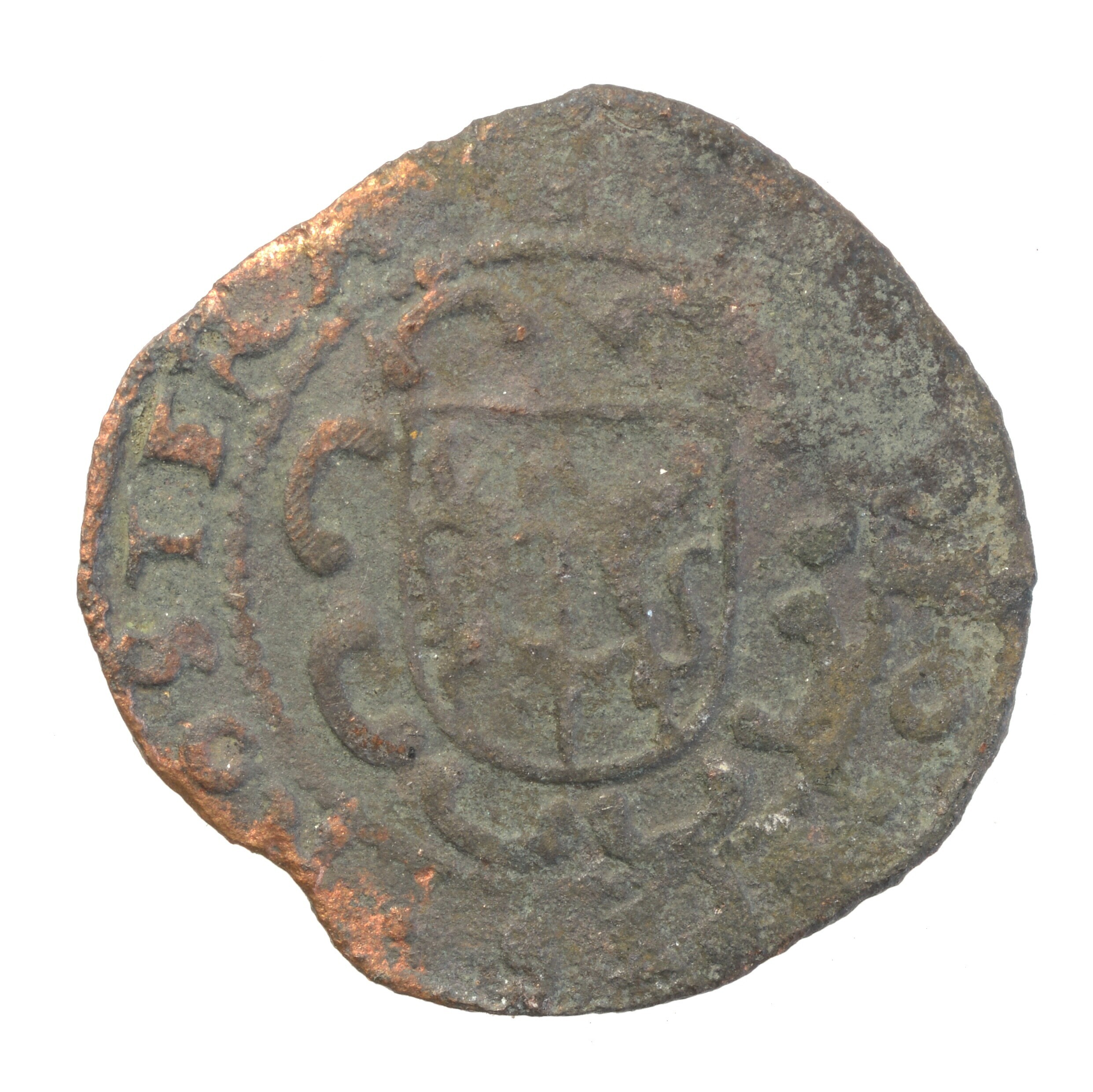 Duit; Gelderland Provincie (1581-1795); vz.: Een tulpkrans met daarin de tekst DVC GEL in twee regels en daaronder het jaartal 163(?); kz.: Wapen van Gelderland welke wordt omgeven door een veelbogige versiering. Tekst: f IN. DEO. SPES. NOSTRA.; gewicht: 1.48 gram