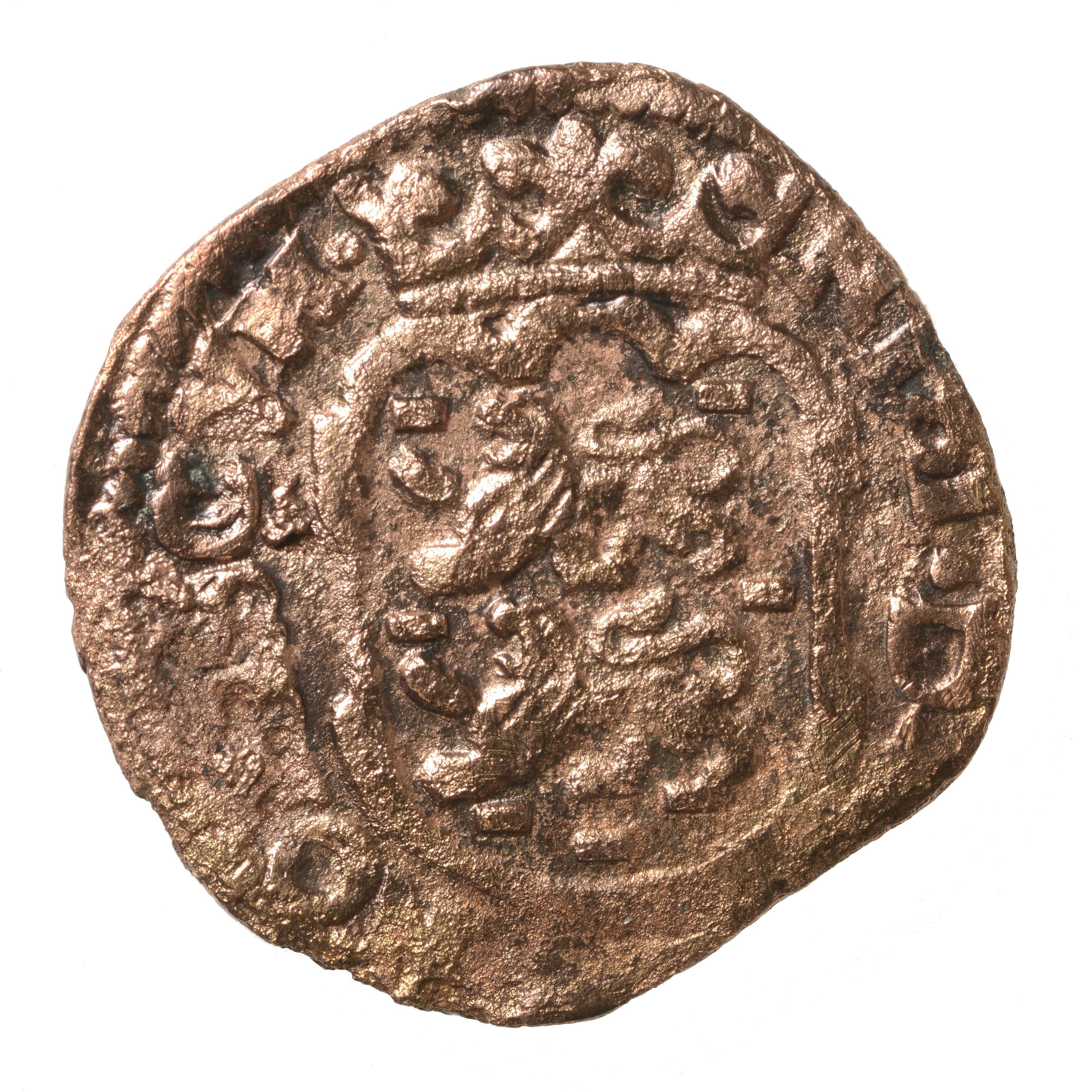 Duit; Friesland Provincie (1581-1795); vz.: een tulpkrans met daarin de tekst FRI SIA in twee regels, daaronder het jaartal 1653; kz.: gekroond wapen van Friesland met twee gaande leeuwen boven elkaar en randtekst .NISI. DNS. NOBISCVM; gewicht: 2.38 gram