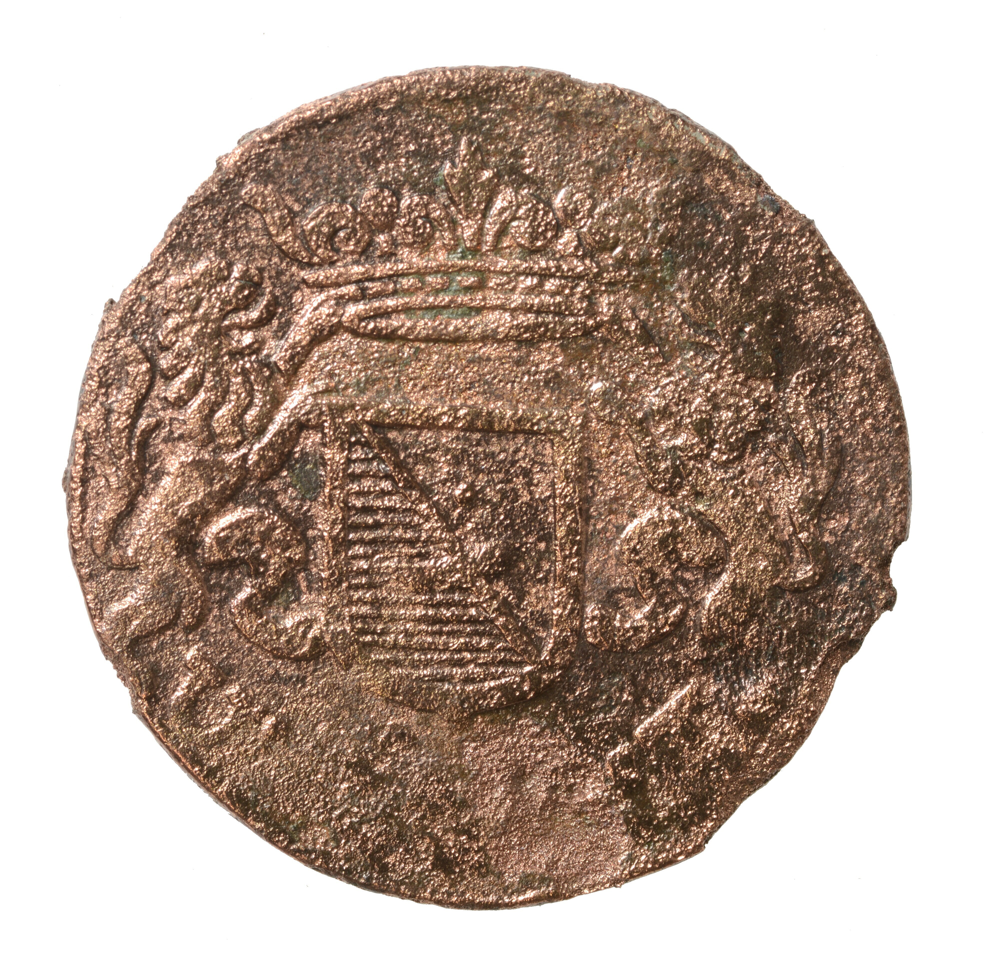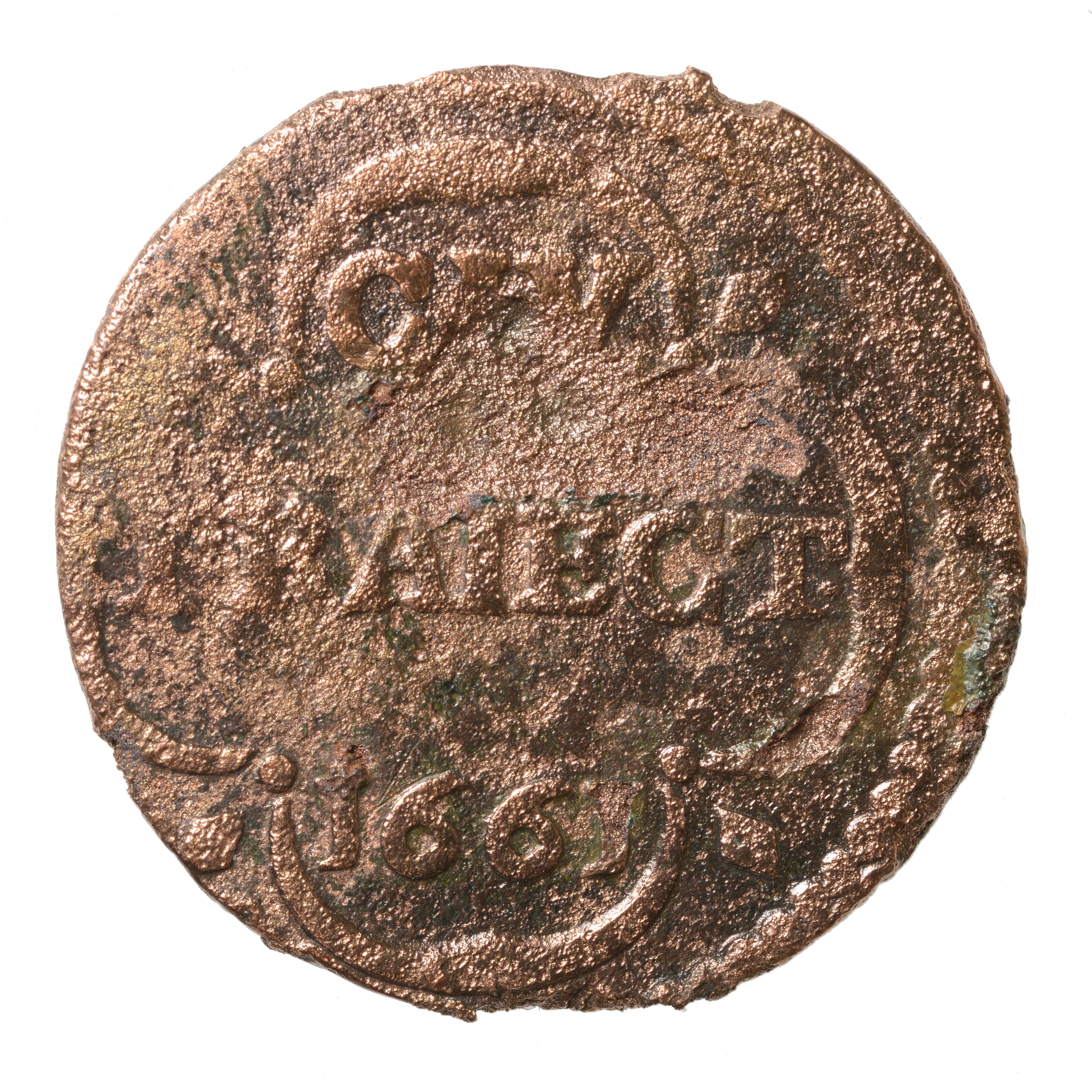 Duit; Utrecht Stad (1581-1795); vz.: een versiering van vier bogen (vierpas) met daarin de tekst CIV TRAIECT in 2 regels en daaronder het jaartal 1661; kz.: Het stadswapen van Utrecht aan weerszijden vastgehouden door leeuwen. De lelie boven het wapen is komen te vervallen maar er staat wel een kroon boven. In het kwartier linksonder ...