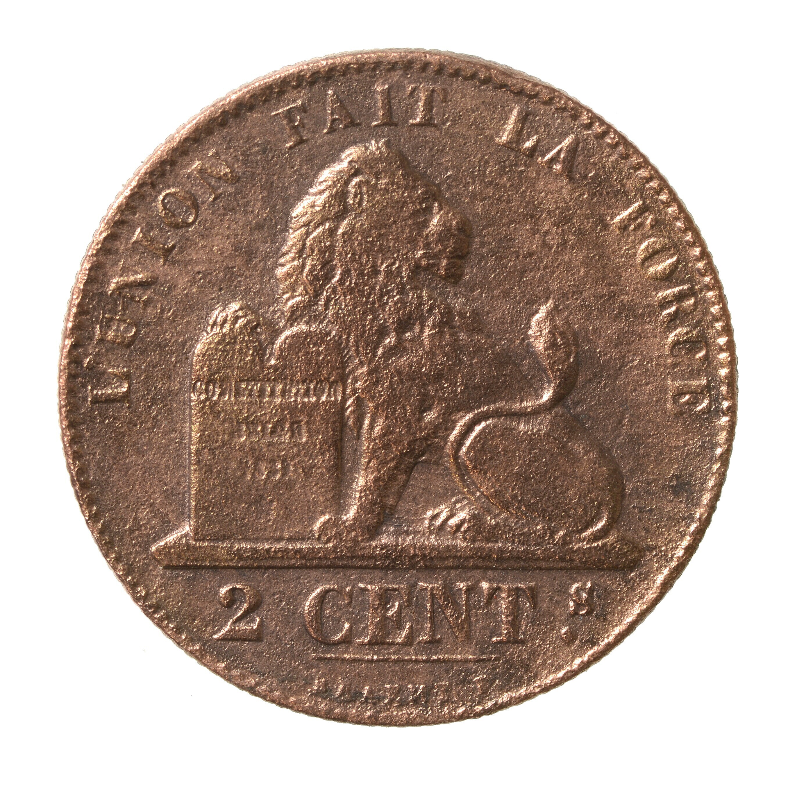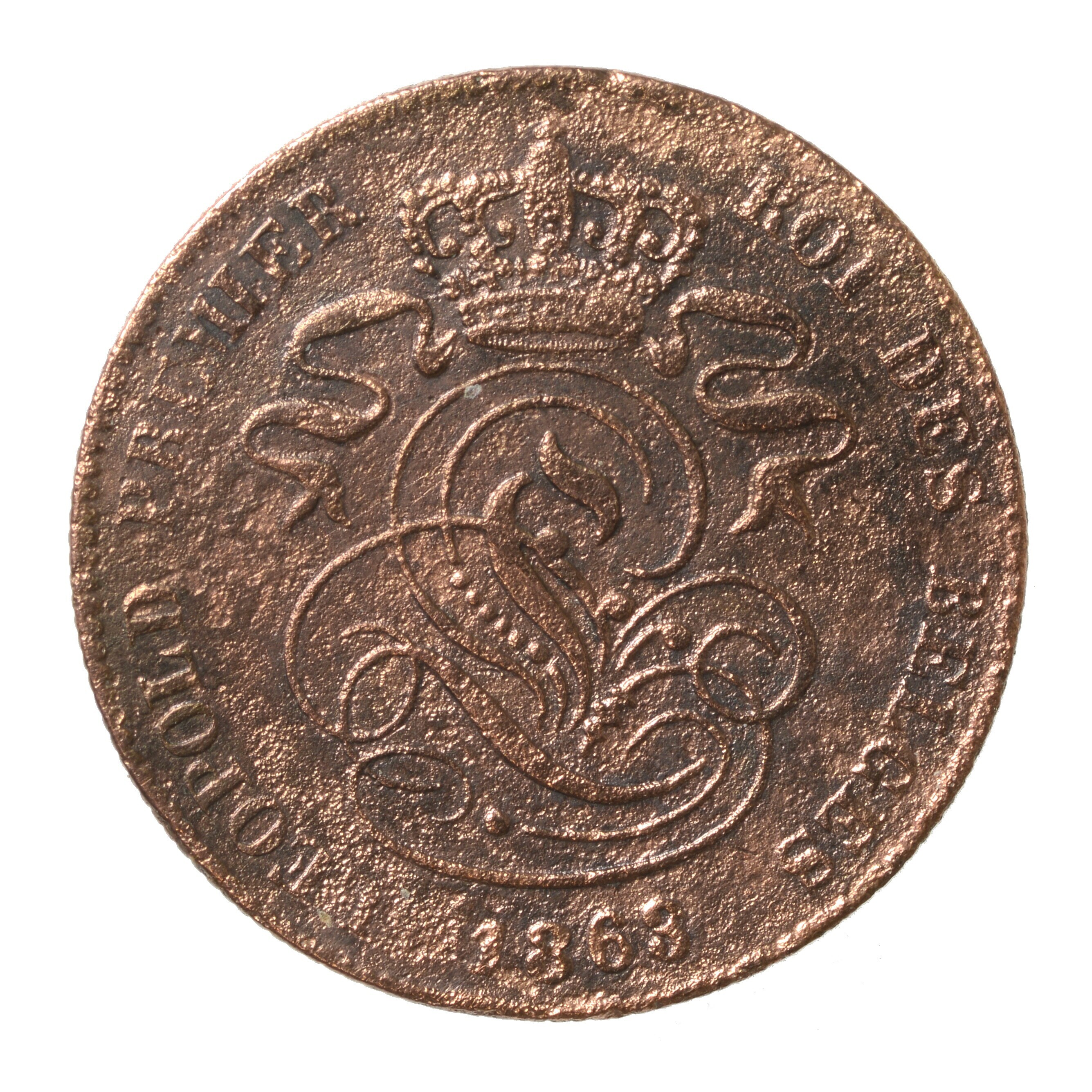 Twee centimes; Koninkrijk België (1830-heden); Leopold I (1831-1865); vz.: gekroond wapen met omschrift LEOPOLD PREMIER ROI DES BELGES en het jaartal 1863; kz.: zittende leeuw met randtekst 2 CENTs. L'UNION FAIT LA FORCE; gewicht: 3.90 gram
