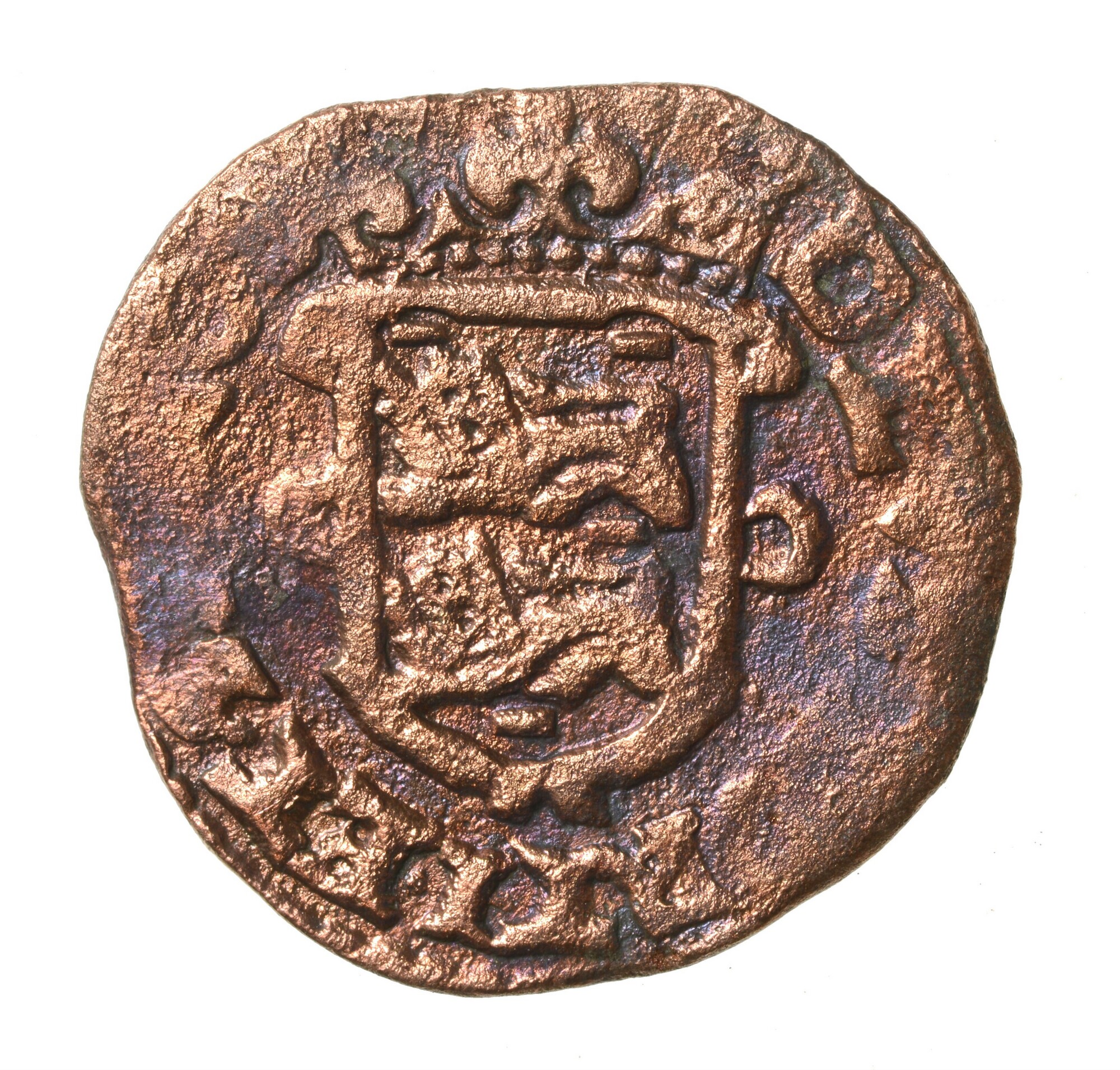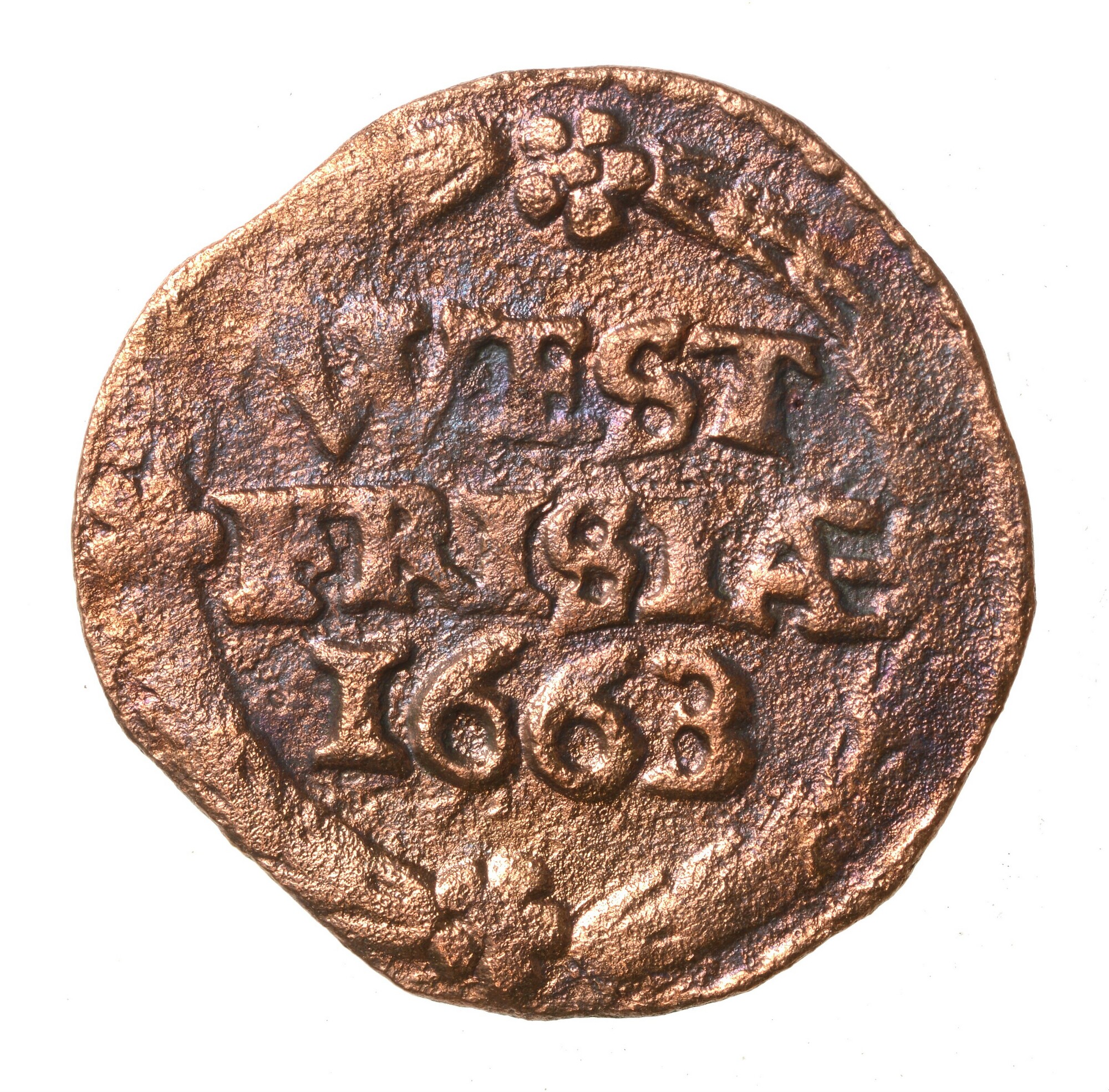 Duit; West-Friesland; vz.: Een tulpkrans met daarin de tekst WEST FRISIAE in twee regels, daaronder het jaartal 1663; kz.: Gekroond wapenschild met het wapen van West-Friesland. De leeuwen hebben hun kop 'en face' gericht en randtekst DEVS. FORTI. ET. SP. NOS; gewicht: 1.59 gram