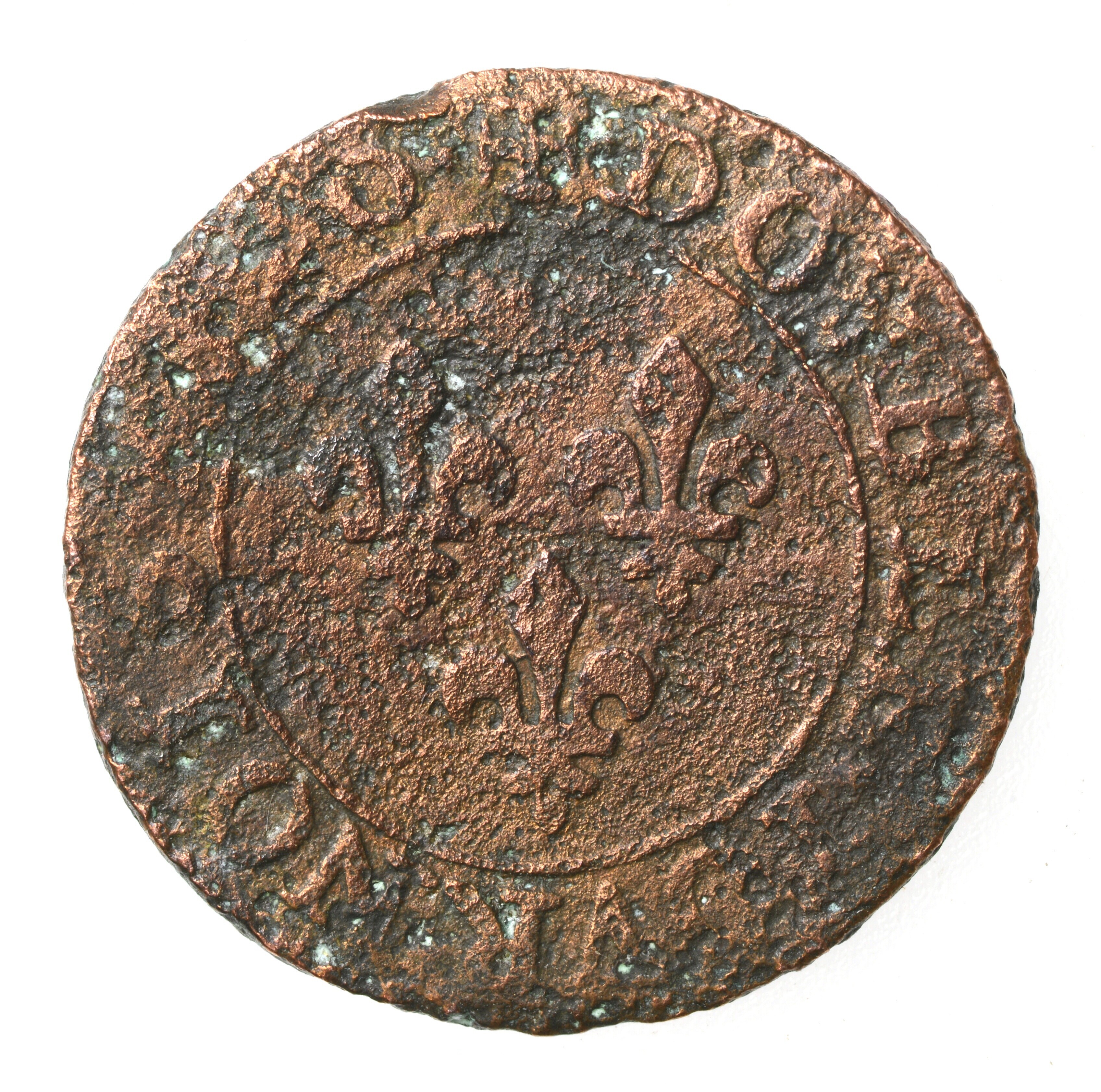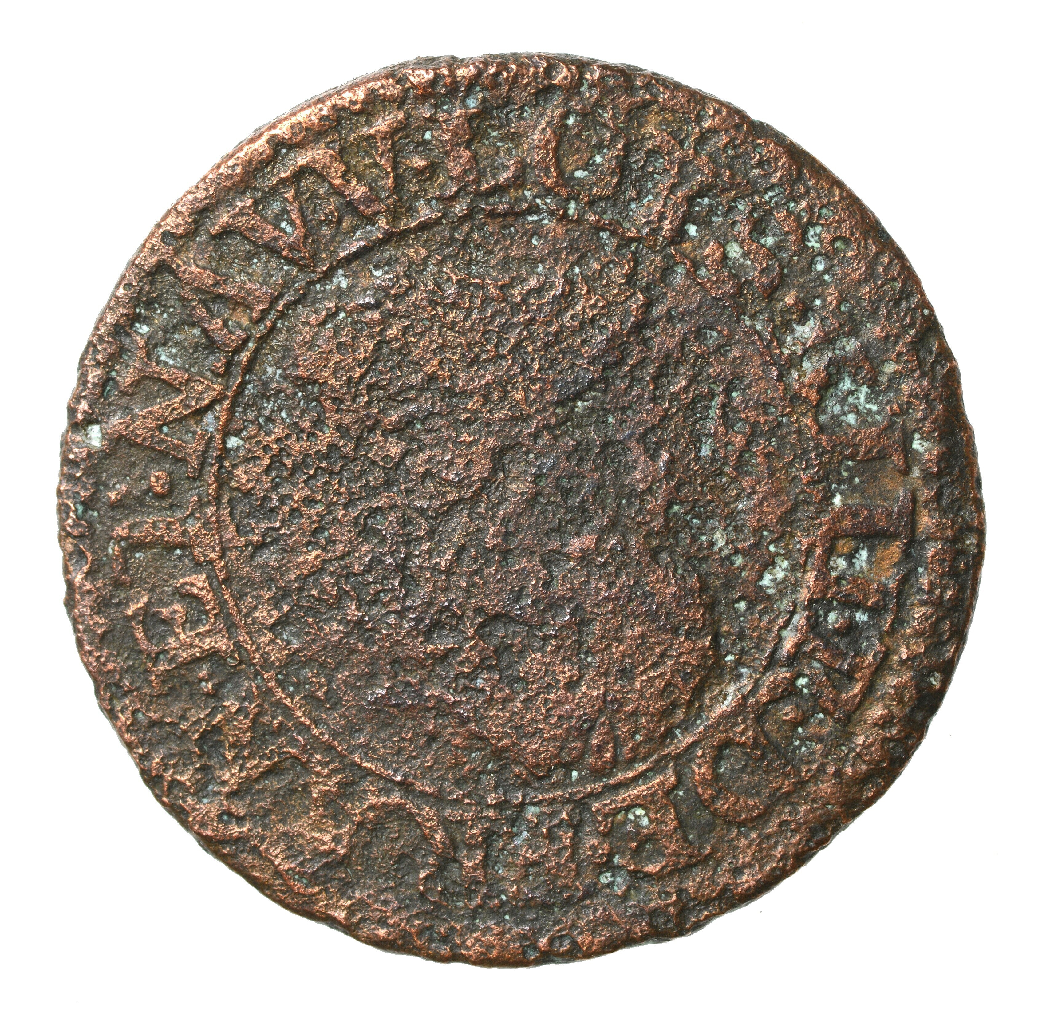 Double Tournois; Koninkrijk Frankrijk (987-1792); Lodewijk XIII (1610-1643); vz.: drie Franse lelies en randtekst DOVBLE TOURNOIS en jaartal 1638?; kz.: buste en randtekst LOYS XIII R DE FRAN ET NAVV; gewicht: 2.70 gram