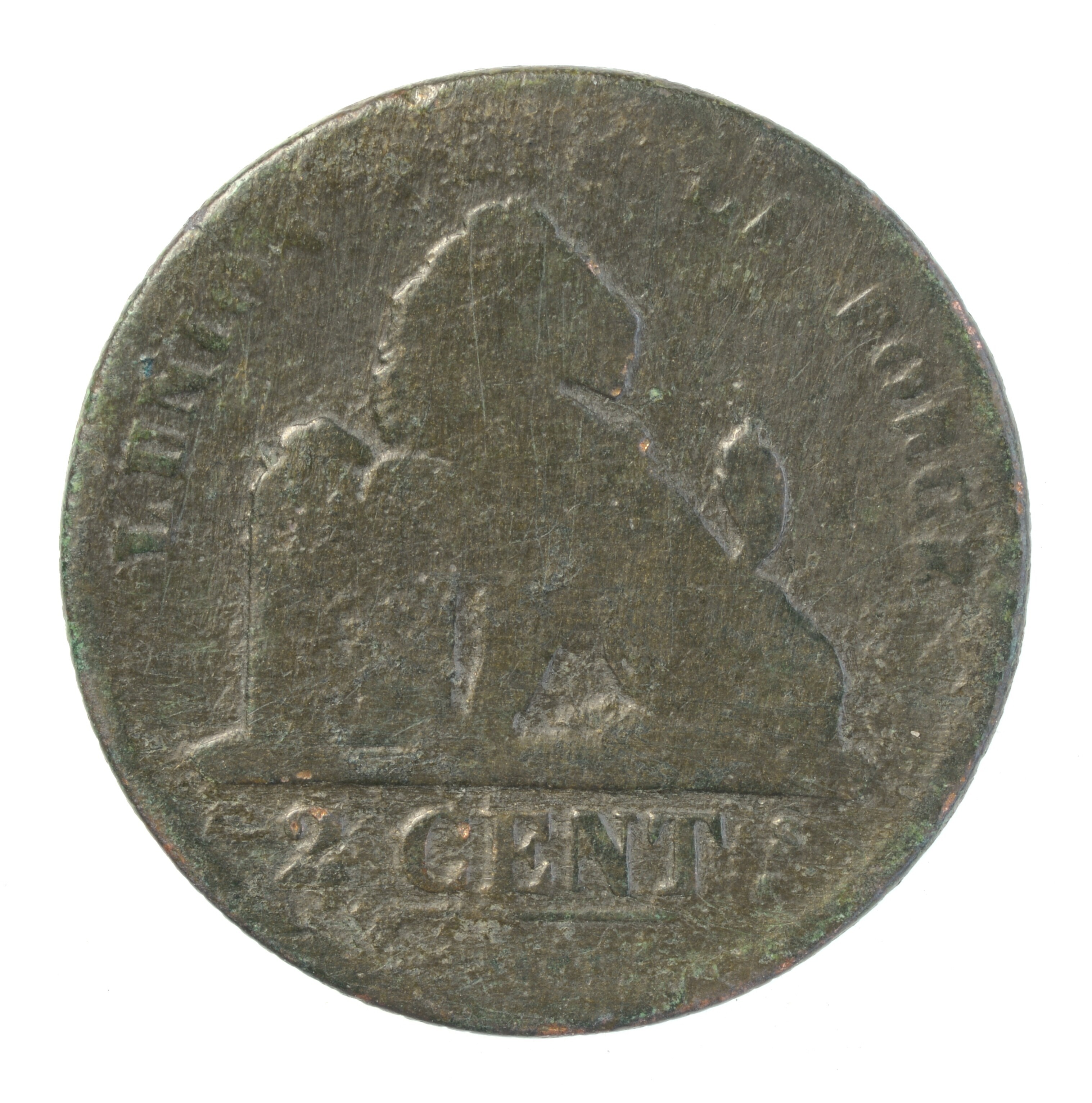 Twee centimes; Koninkrijk België (1830-heden); Leopold I (1831-1865); vz.: zittende leeuw met daaronder 2 cent en het omschrift L UNION FAIT LA FORCE; kz.: gekroond wapen met omschrift LEOPOLD PREMIER ROI DES BELGES en het jaartal 1835; gewicht: 3.45 gram