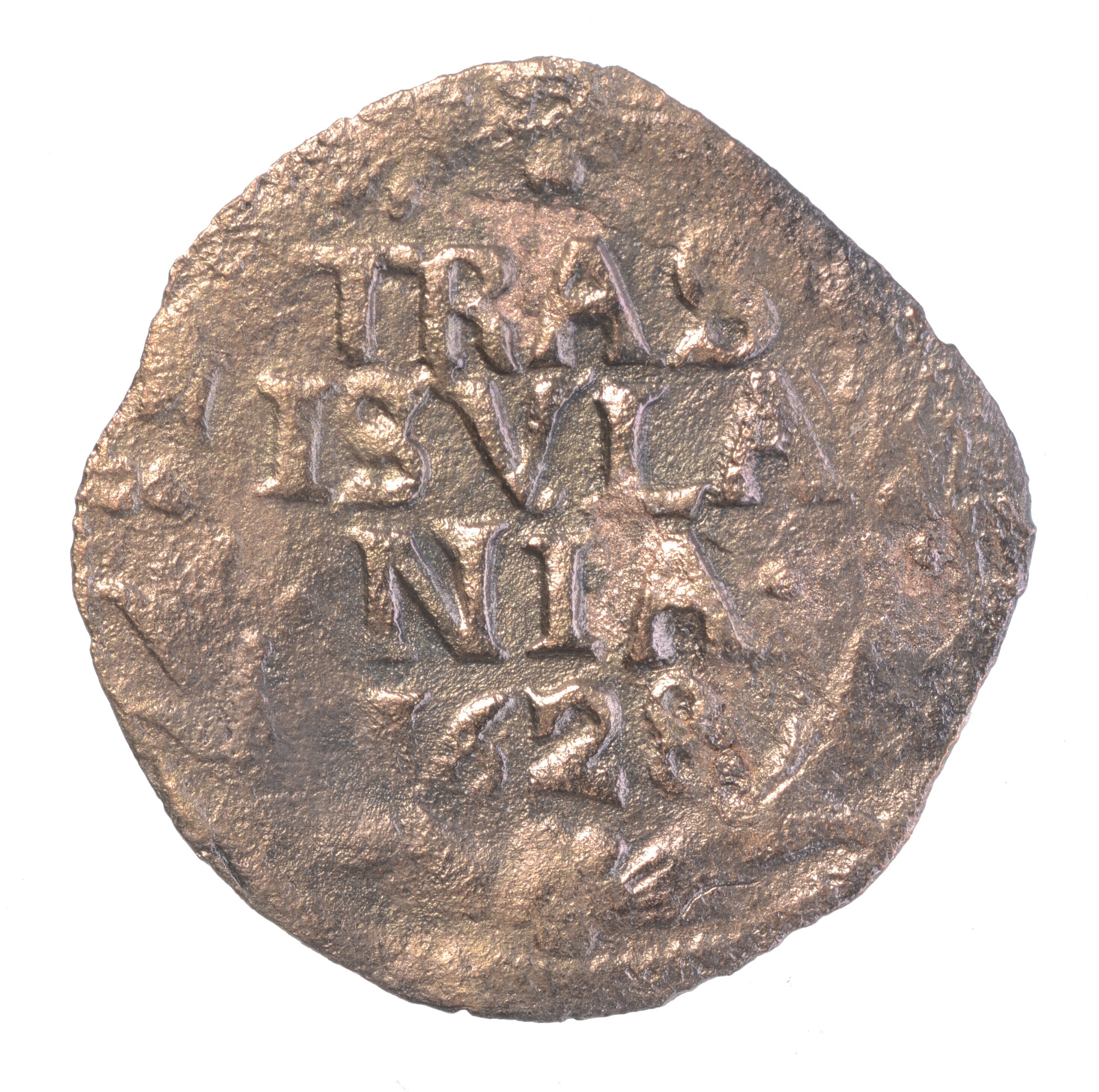 Duit; Overijssel Provincie (1581-1795); vz.: de tekst TRAS ISVLA .NIA. in drie regels met daaronder het jaartal 1628; kz.: Gekroond wapen van Overijssel met klauwende leeuw naar links. Op de achtergrond een golvende lijn wat de rivier de IJssel moet voorstellen, langs het wapen loopt een tulpkrans; gewicht: 1.05 gram