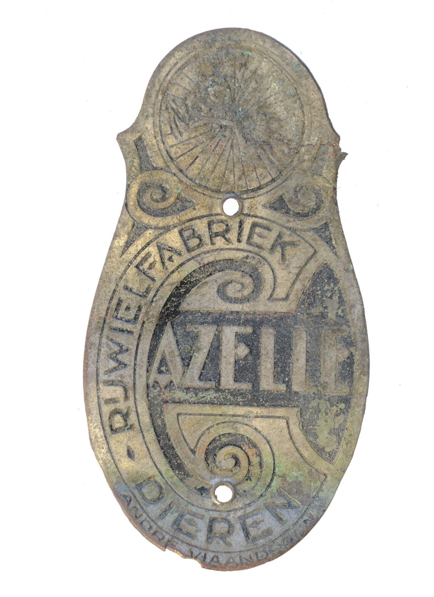 Merkplaat; ovaalvormige plaat met twee gaten en de tekst RIJWIELFABRIEK GAZELLE - DIEREN - ANDRE VLAANDEREN