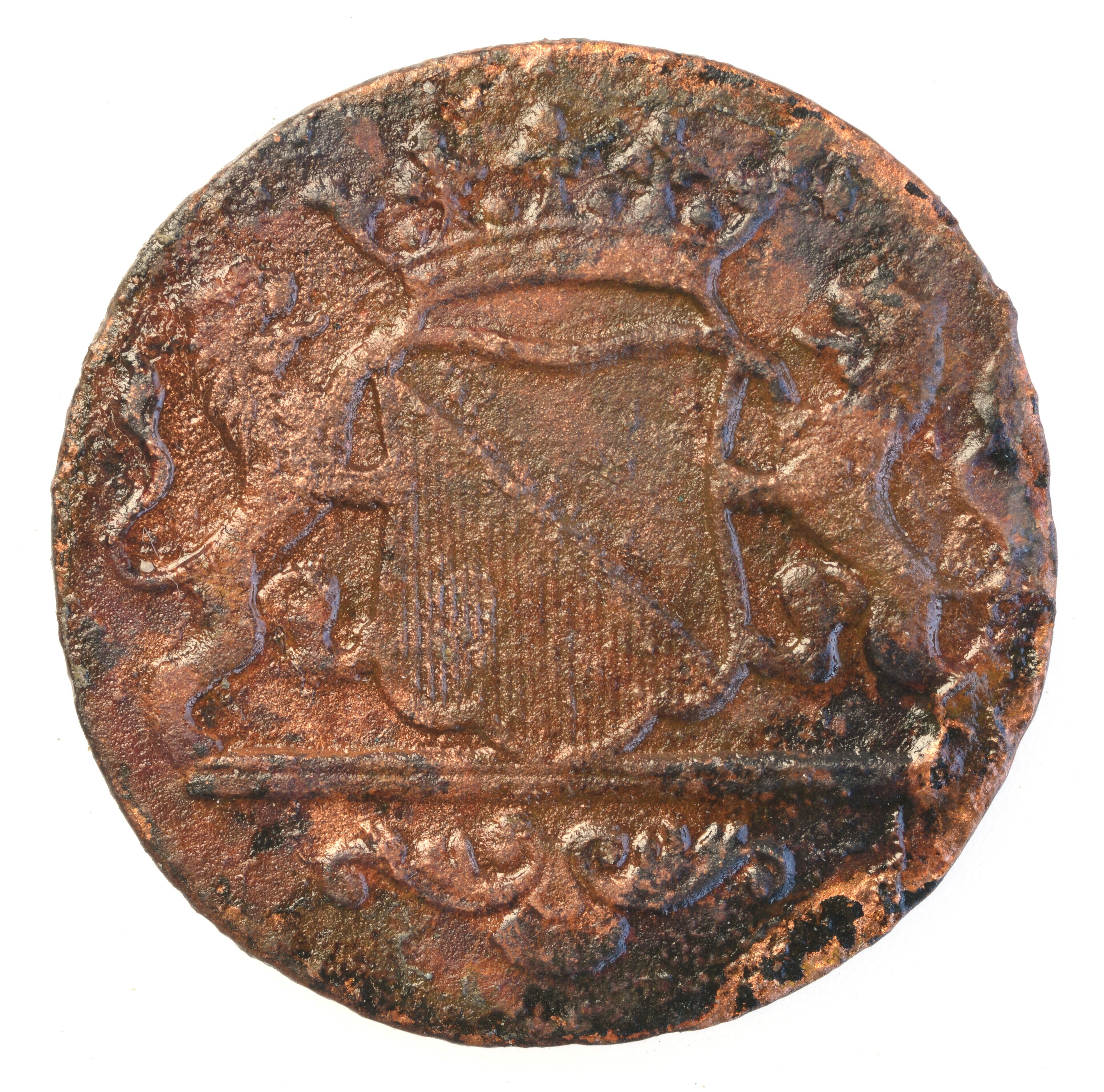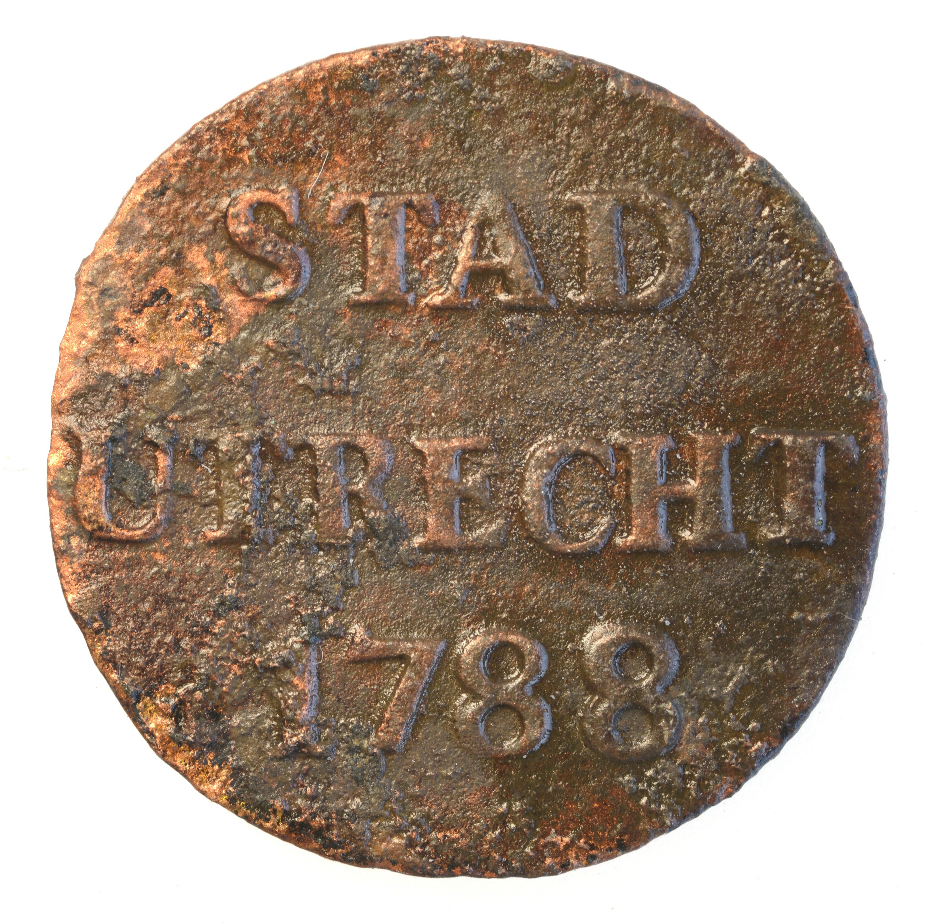 Duit; Stad Utrecht (1581-1795); vz.: STAD UTRECHT met daaronder jaartal 1788; kz.: Stadswapen van Utrecht met kroon, het wapen en de kroon worden vastgehouden door twee leeuwen. Onder het wapen loopt een dubbele streep met daaronder een versiering met grote schelp. In het kwartier linksonder een fijne arcering van verticale lijnen; gewicht: 2.22 gram