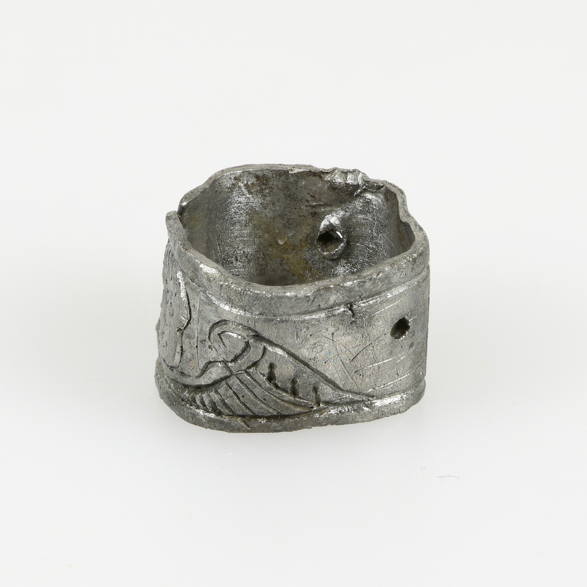 Mesheftbeslag; twee bevestigingsgaten; ingegraveerd engelenhoofd- en vleugel