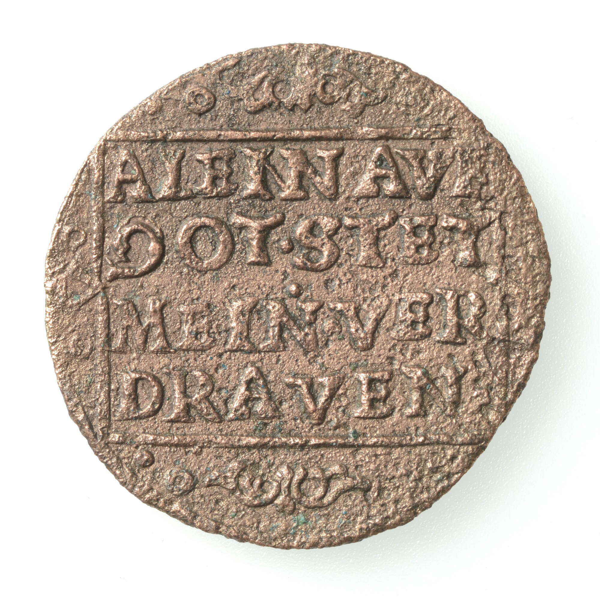 Rekenpenning Neurenberg; vz.: binnen versierd rechthoekig kader de tekst ALEIN AUF GOT STET MEIN VERDRAVEN; kz.: binnen cirkel twee naar elkaar gerichte figuren (man en vrouw houden elkaars hand vast) met staf met de letters H(links) en S (rechts); gewicht: 3.61 gram