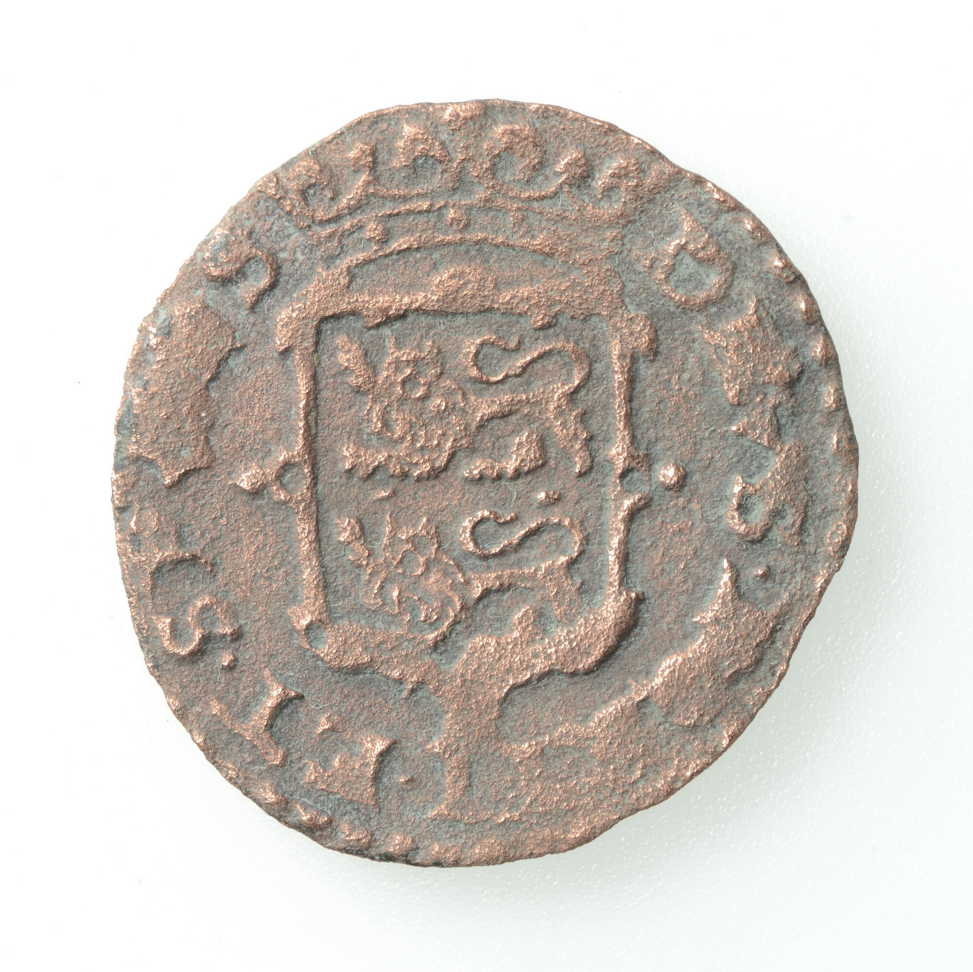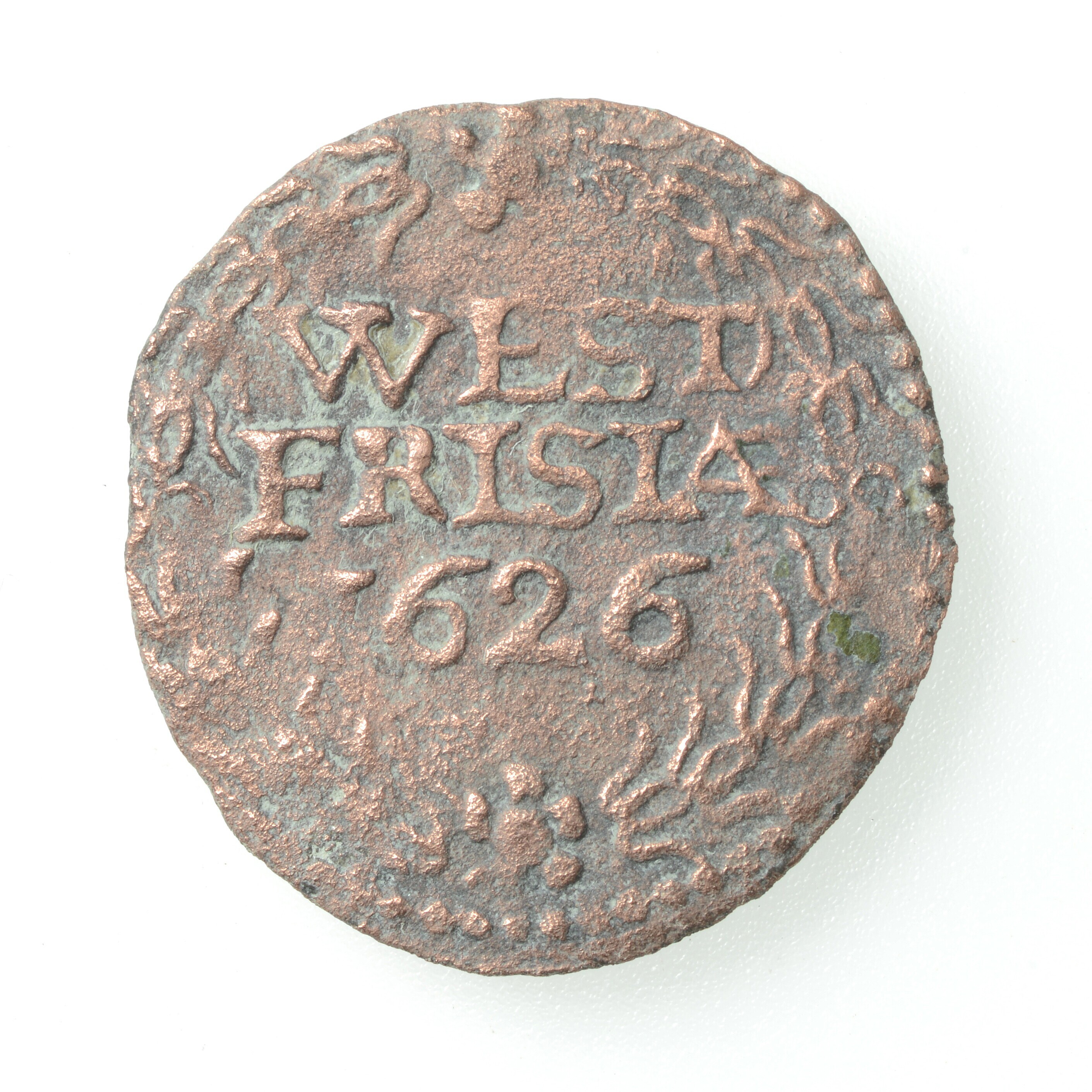 Duit West-Friesland; vz.: Een tulpkrans met daarin de tekst WEST FRISIAE in twee regels, daaronder het jaartal 1626; kz.: Gekroond wapenschild met het wapen van West-Friesland. De leeuwen hebben hun kop 'en face' gericht en de randtekst DEVS. FORTI. ET. SP. NOS; gewicht: 1.46 gram
