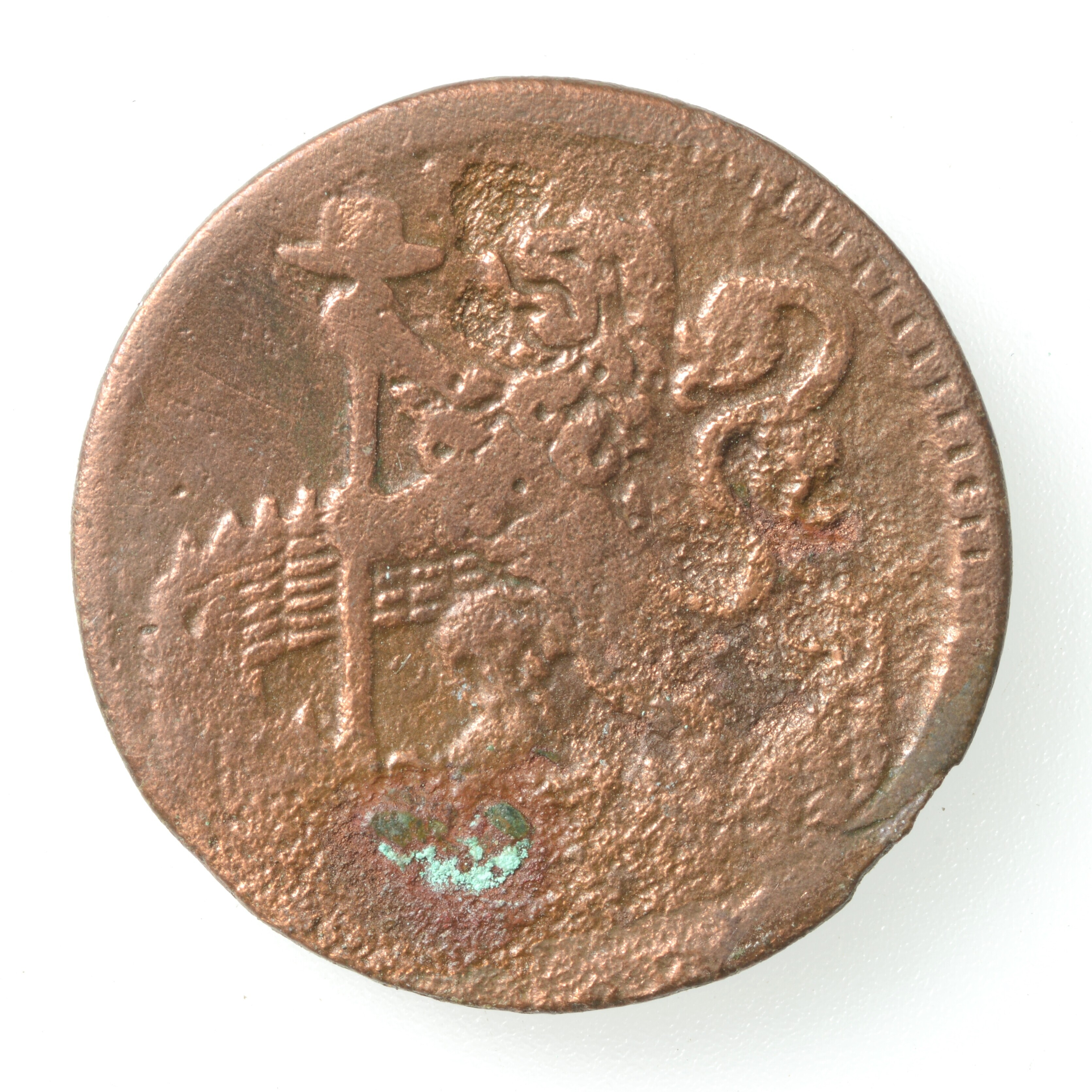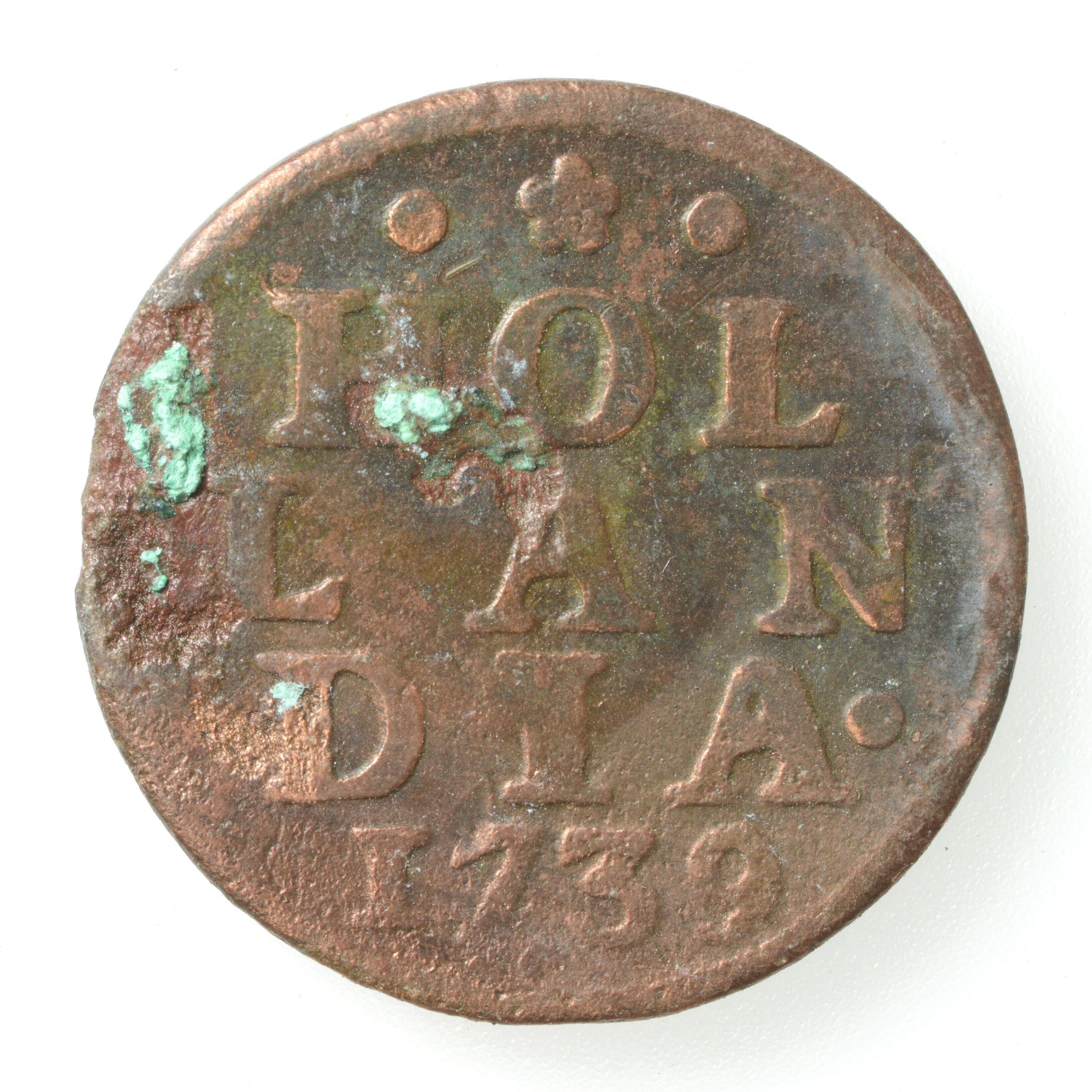 Duit; Holland Provincie (1581-1795); vz.: HOLLANDIA in drie regels met daaronder het jaartal 1739; kz.: Een leeuw naar links in een gesloten Hollandse tuin. De leeuw heeft met zijn klauwen een speer vast met op de punt de zogenaamde vrijheidshoed; gewicht: 3.02 gram