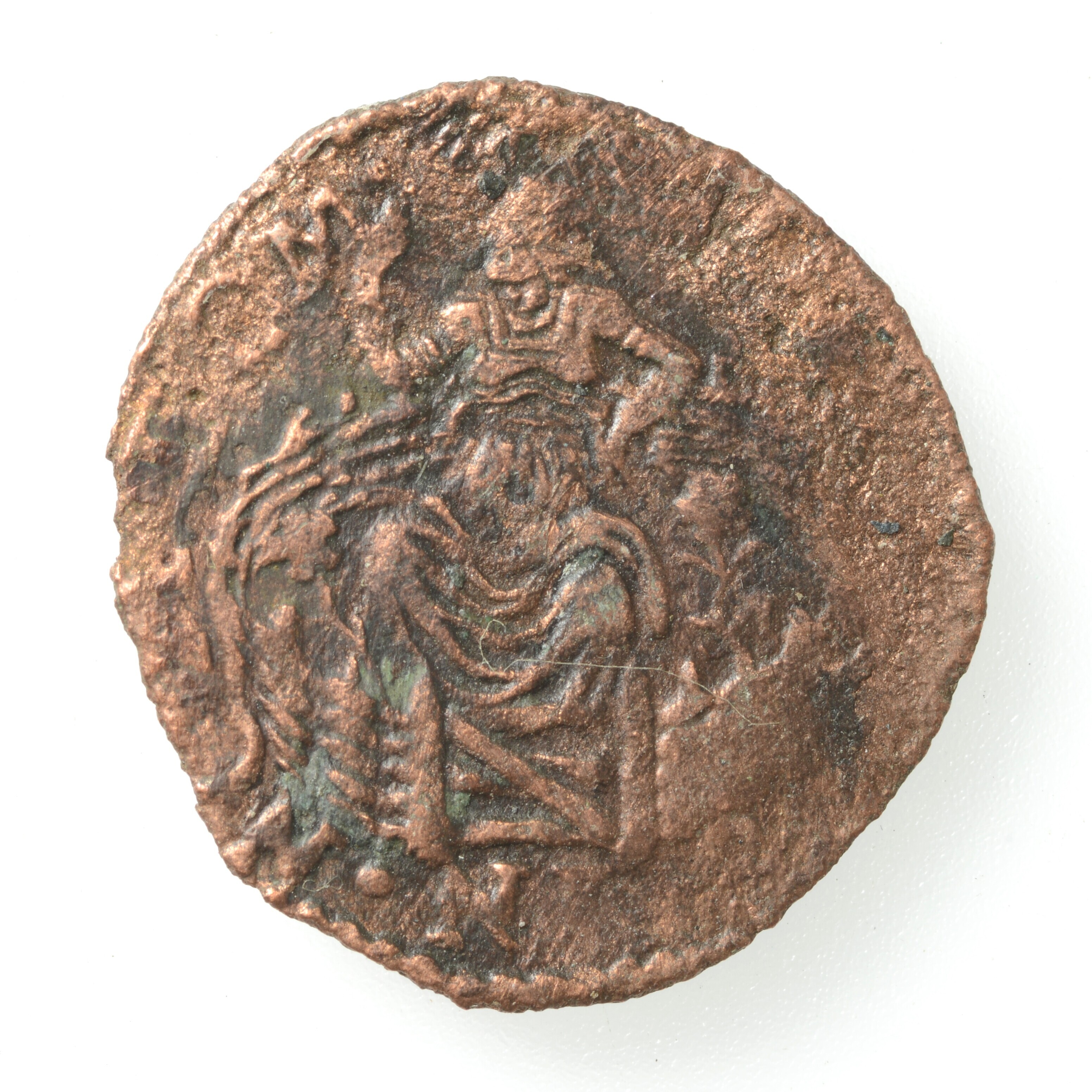 Duit; Holland Provincie (1581-1795); vz.: tulpkrans met daarin de tekst HOL LANDIA in twee regels en jaartal 1627; kz.: De Hollandse maagd zittende in een gesloten tuin. Zij wijst met haar rechterhand naar een zonnige hemel als teken van het vertrouwen op de Heer en randtekst .AVX. NOS. IN. NOM. DOM.; gewicht: 1.70 gram