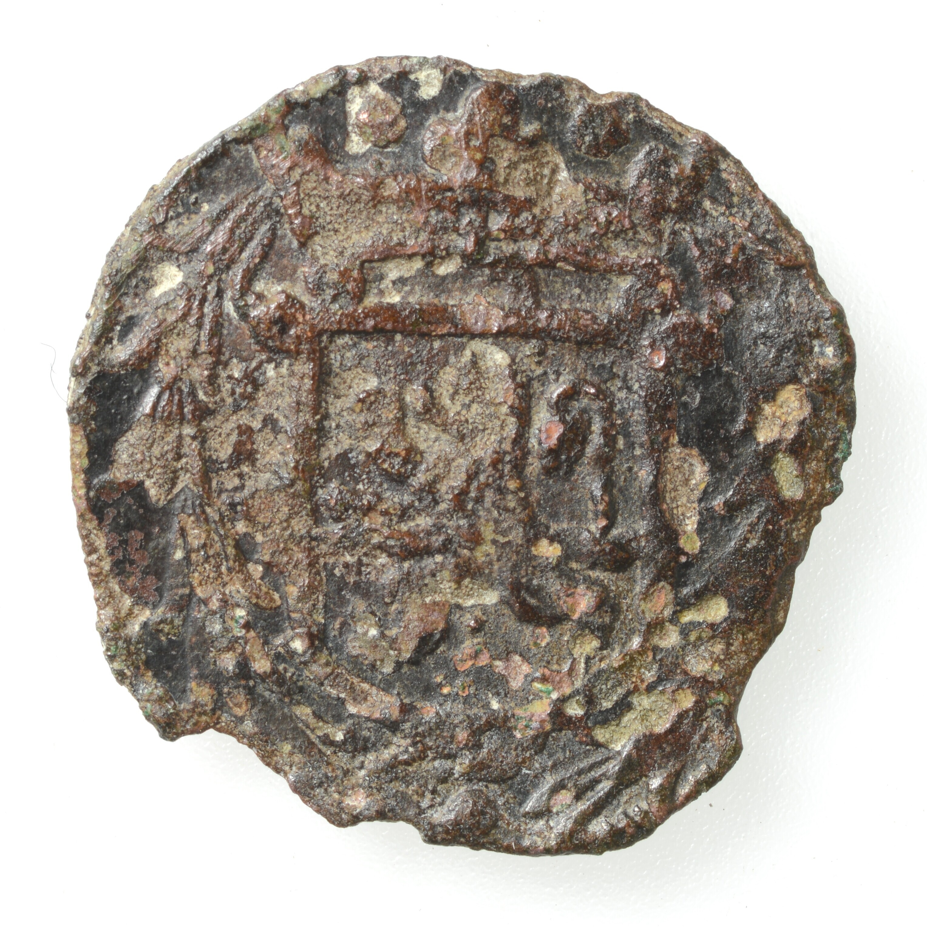 Duit; Overijssel Provincie (1581-1795); vz.: tulpkrans met tekst TRAS/ISVLA?NIA en jaartal 1628; kz.: gekroond wapen van Overijssel, hierin staat een klimmende leeuw met op de achtergrond een golvende lijn wat de rivier de IJssel moet voorstellen; gewicht: 1.32 gram