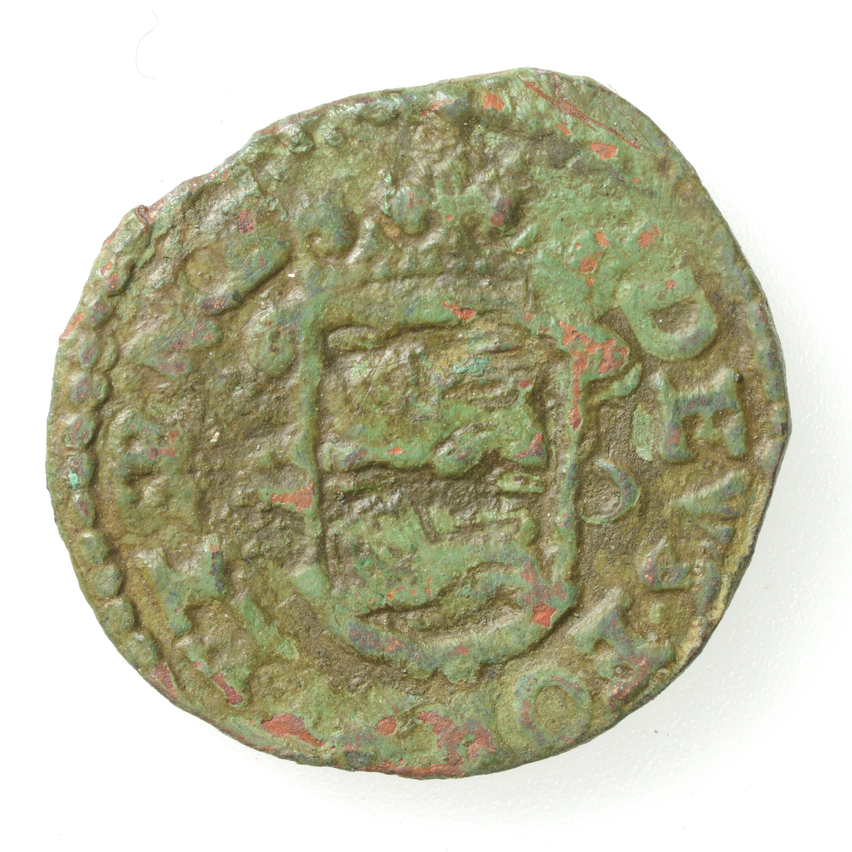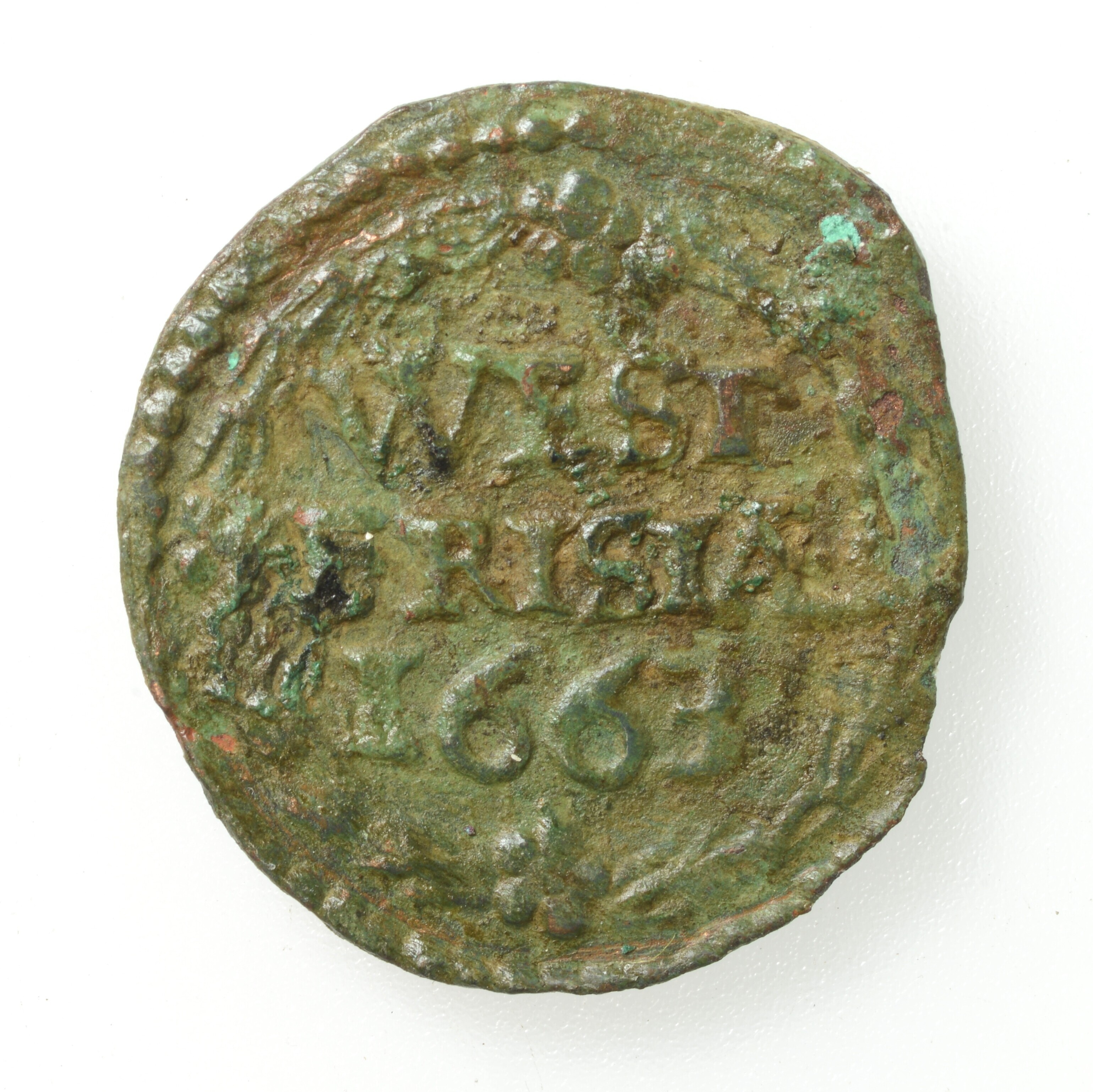Duit West-Friesland; vz.: een tulpkrans met daarin de tekst WEST FRISIAE in twee regels, daaronder het jaartal 1663; kz.: Gekroond wapenschild met het wapen van West-Friesland. De leeuwen hebben hun kop 'en face' gericht en randtekst DEVS. FORTI. ET. SP. NOS; gewicht: 1.47 gram