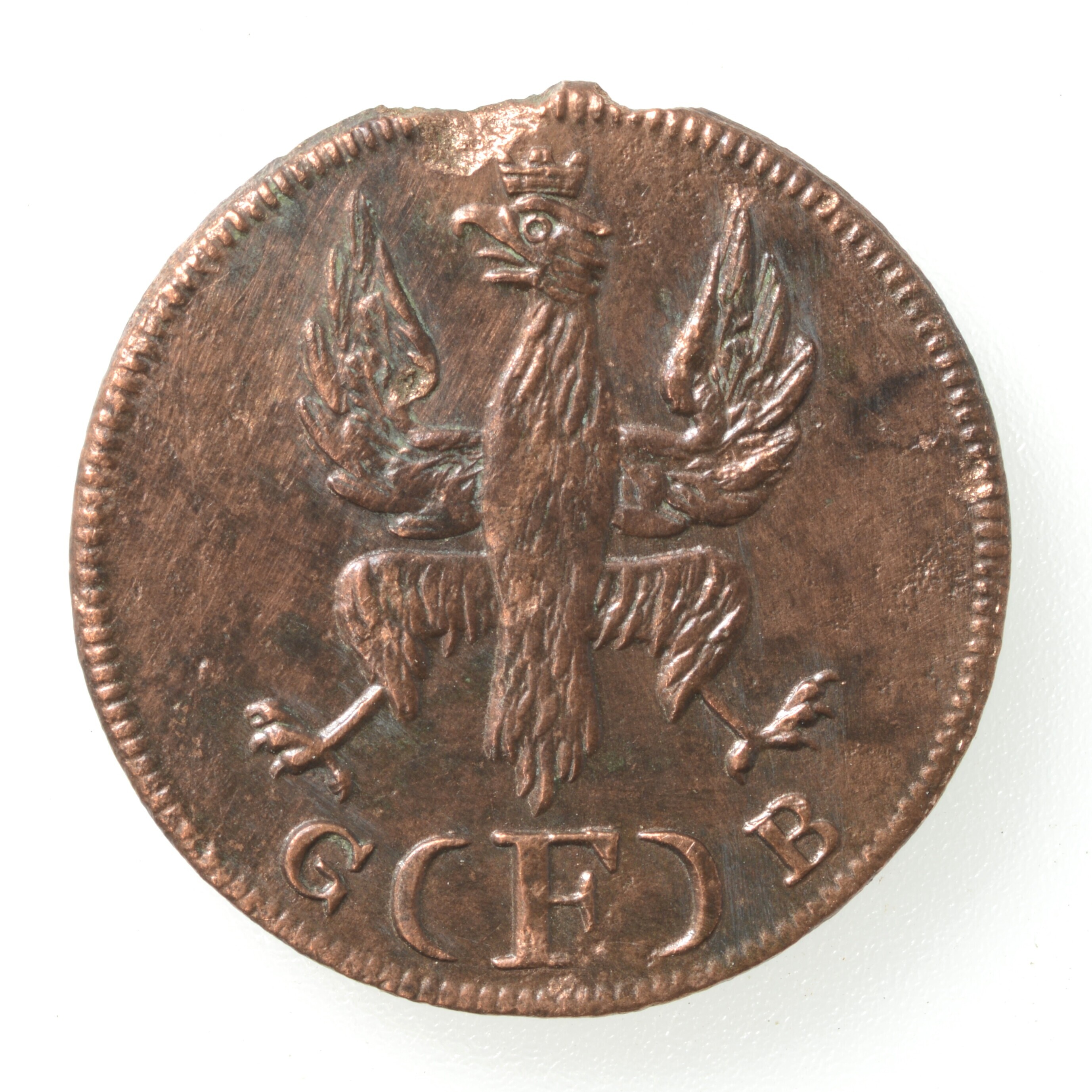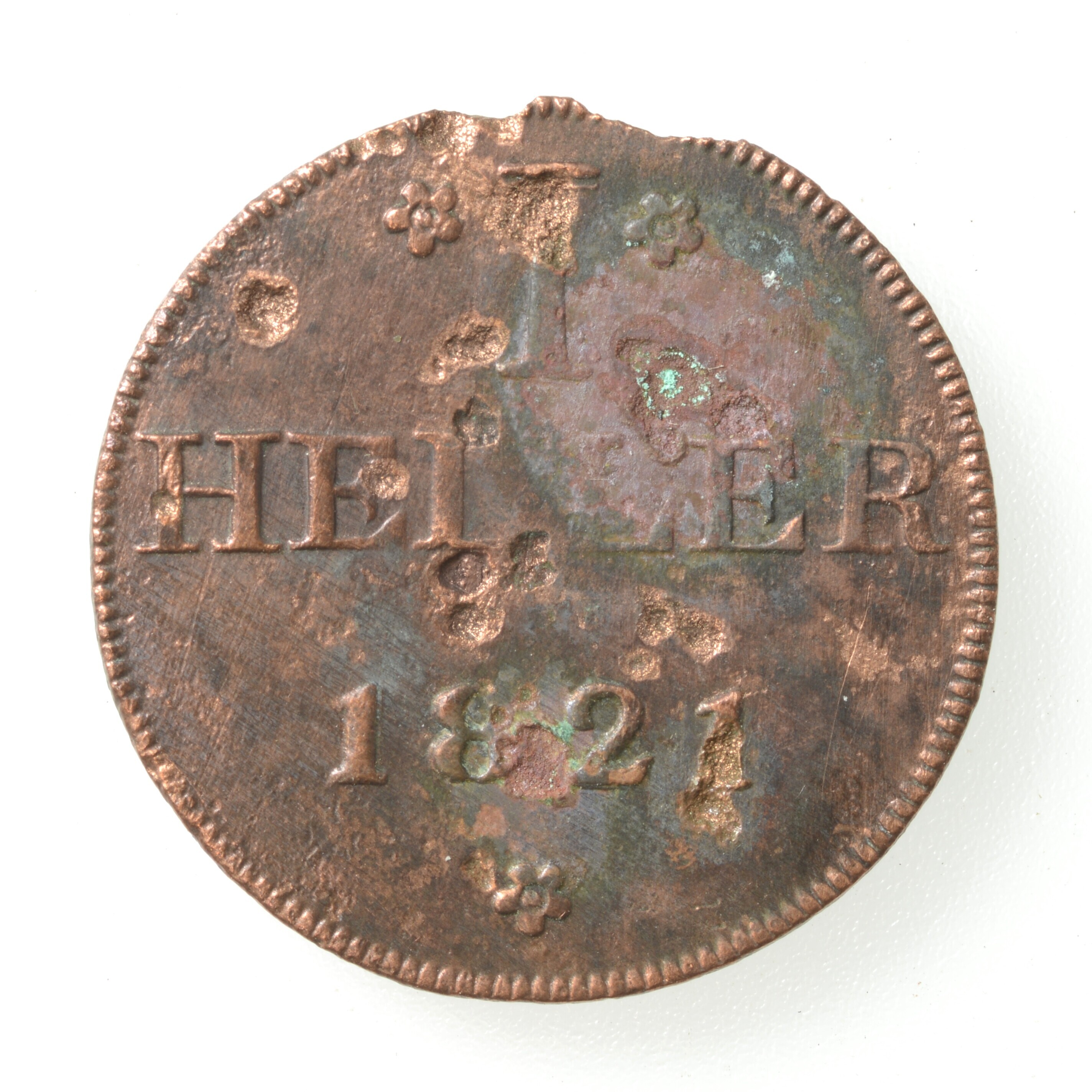 1 Heller; Duitsland; De Duitse Bond, Frankfurt (stad); vrije rijksstad (Frankfurt); particulier geld; vz.: naar links kijkende adelaar met eronder G ( F ) B; kz.: in vier regels: rozet 1 rozet / HELLE[R] / 1821. / rozet; muntplaats: Frankfurt; referentie: Krause / Mishler 301; gewicht: 1.34 gram