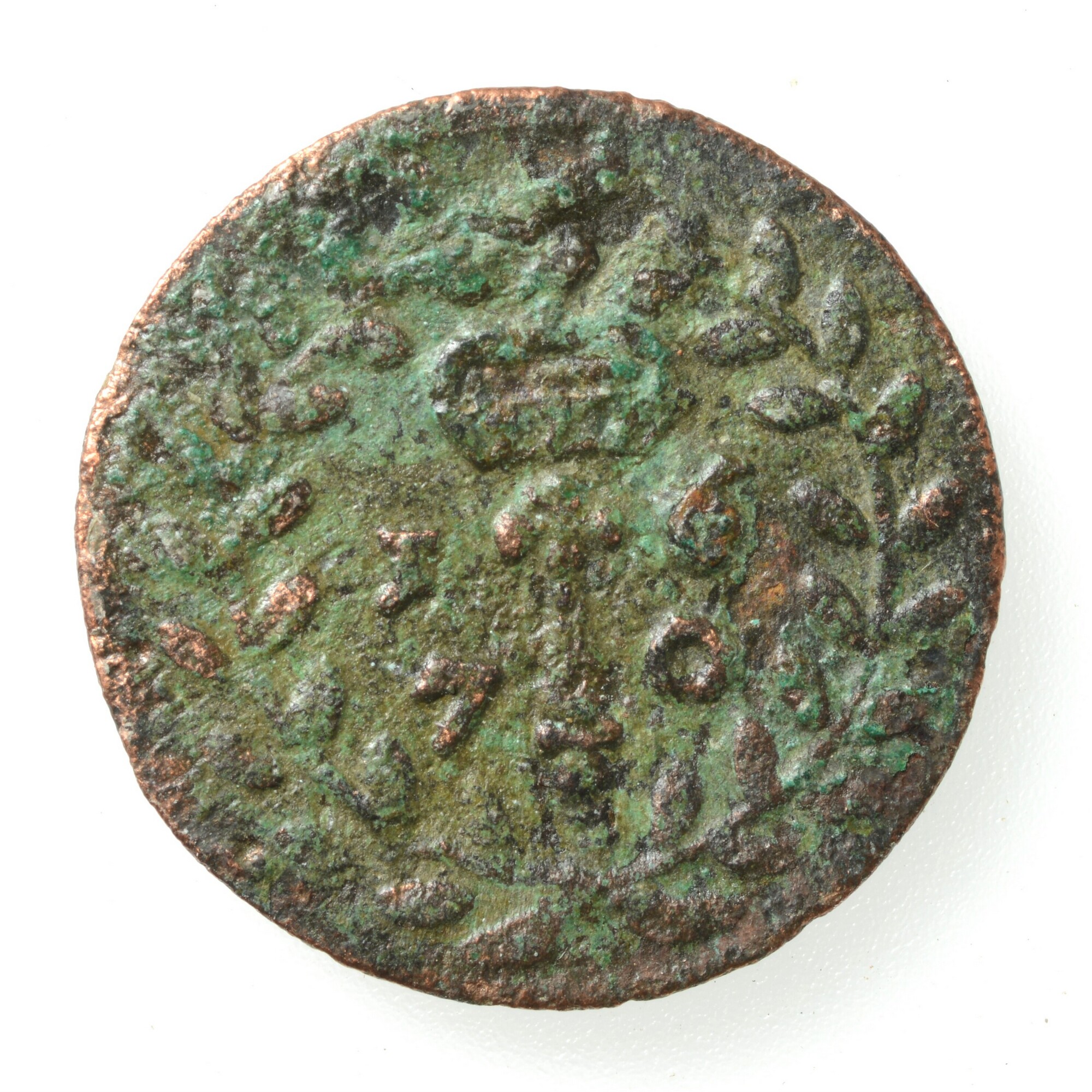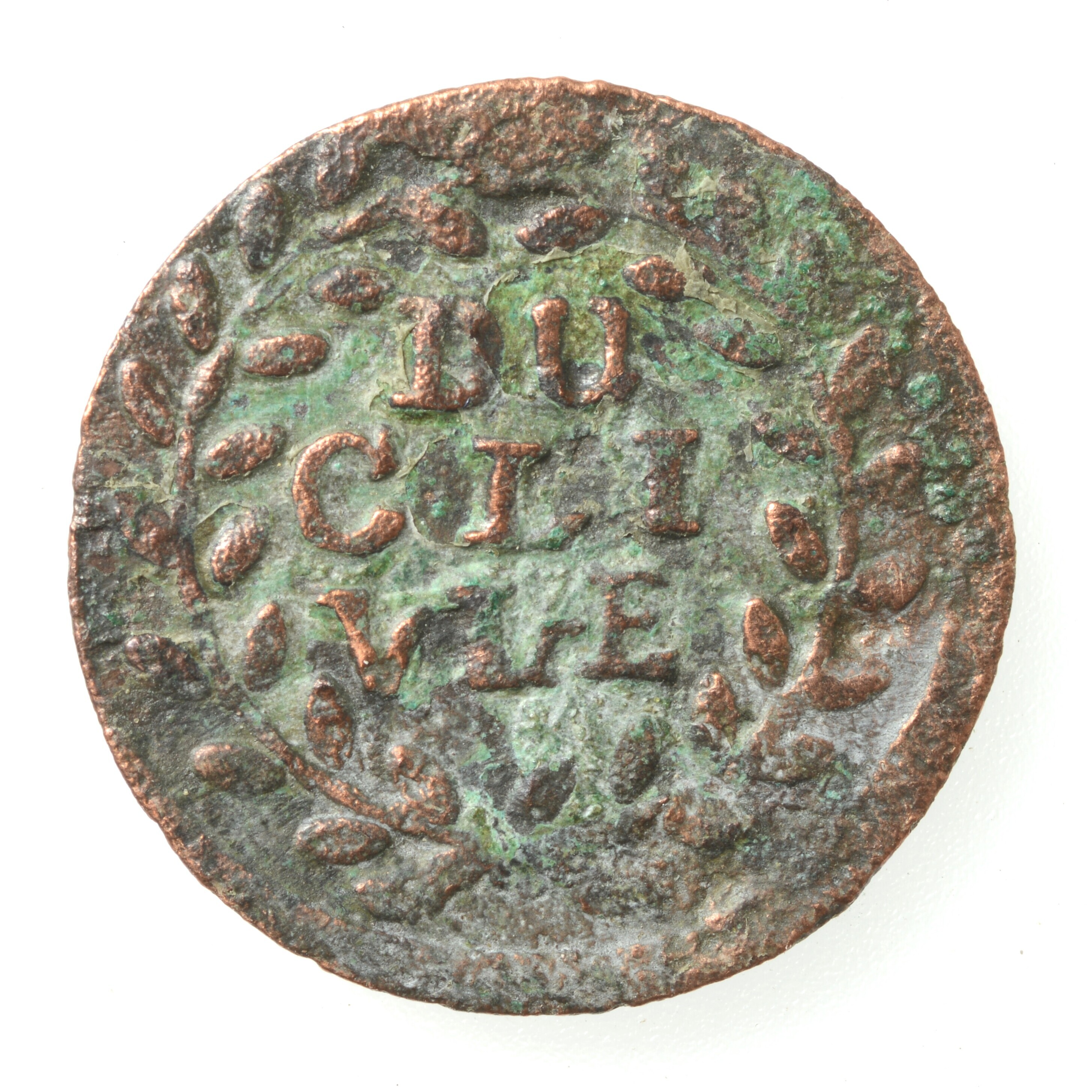 Duit Kleef; vz.: opschrift DU/CLI/VIAE in een lauwerkrans; kz.: gekroonde scepter, geflankeerd door her jaartal 70, in een lauwerkrans; gewicht: 1.19 gram