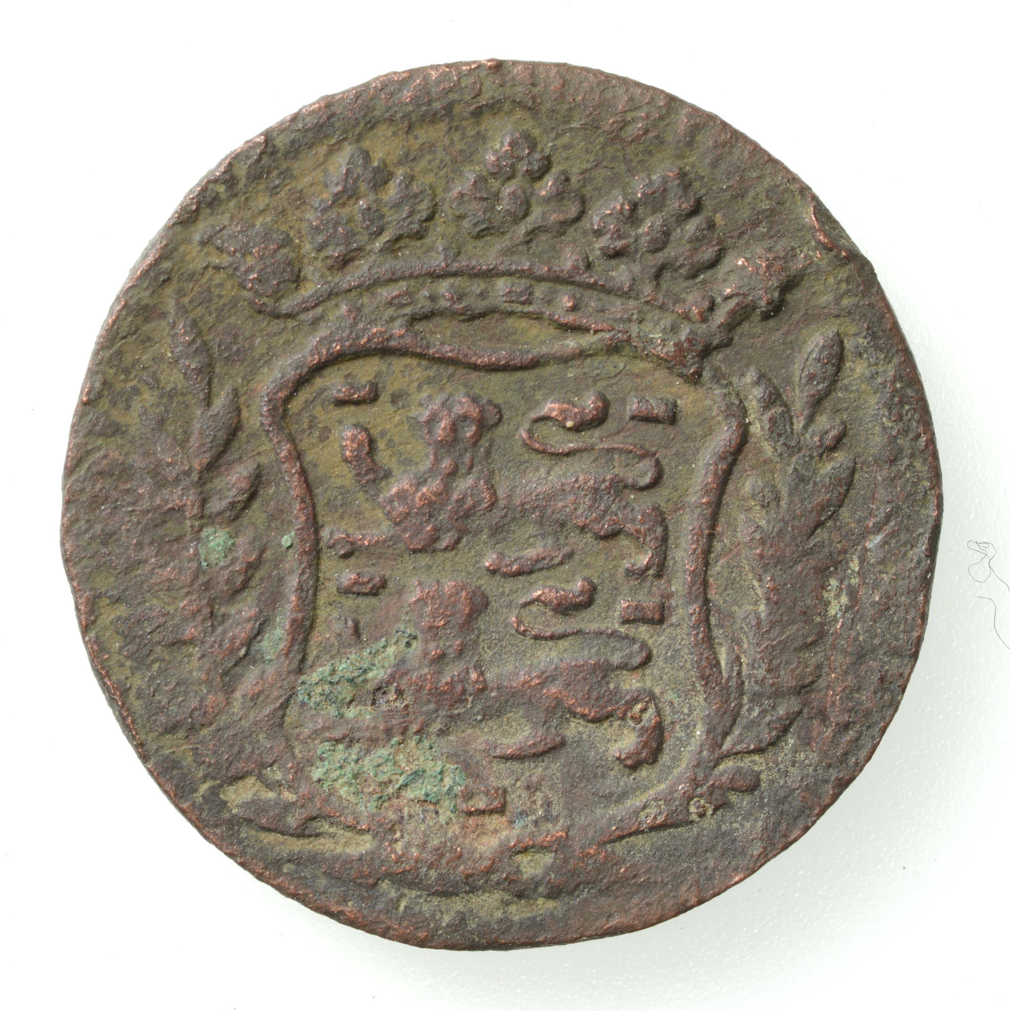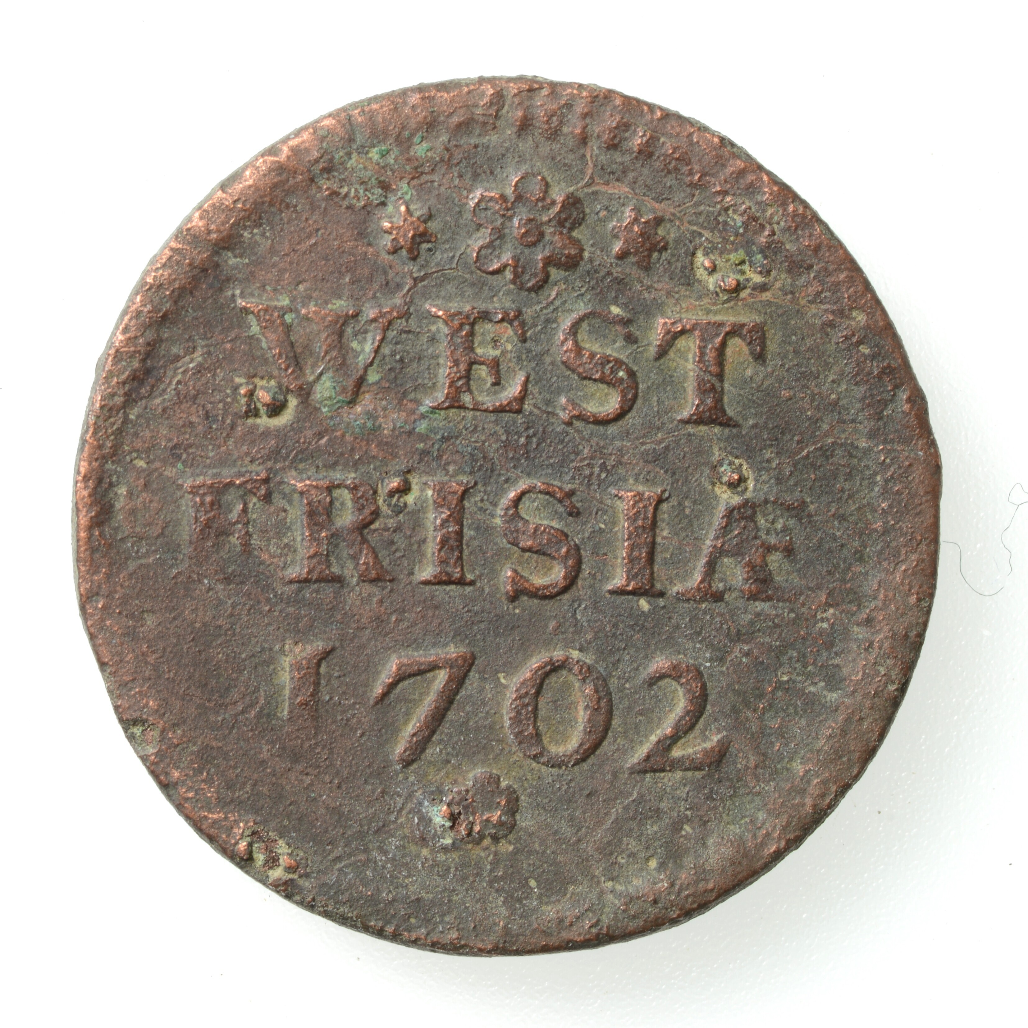 Duit West-Friesland; vz.: WEST FRISIAE in twee regels met hieronder het jaartal 1702; kz.: Gekroond ingebogen wapenschild met twee gaande leeuwen boven elkaar. De leeuwen hebben hun kop 'en face' gericht en wapen aan weerszijden versierd met bladertakken; gewicht: 3.89 gram