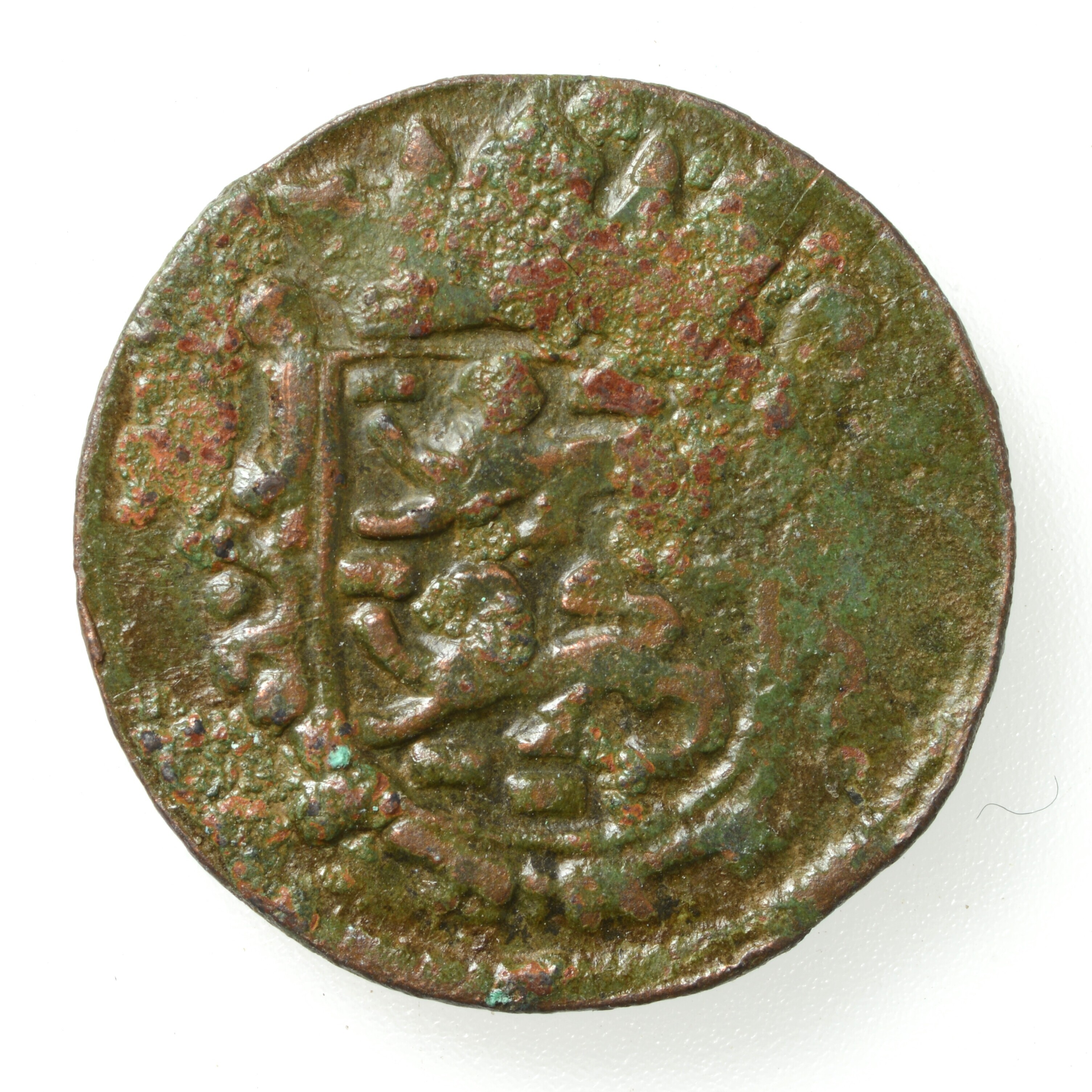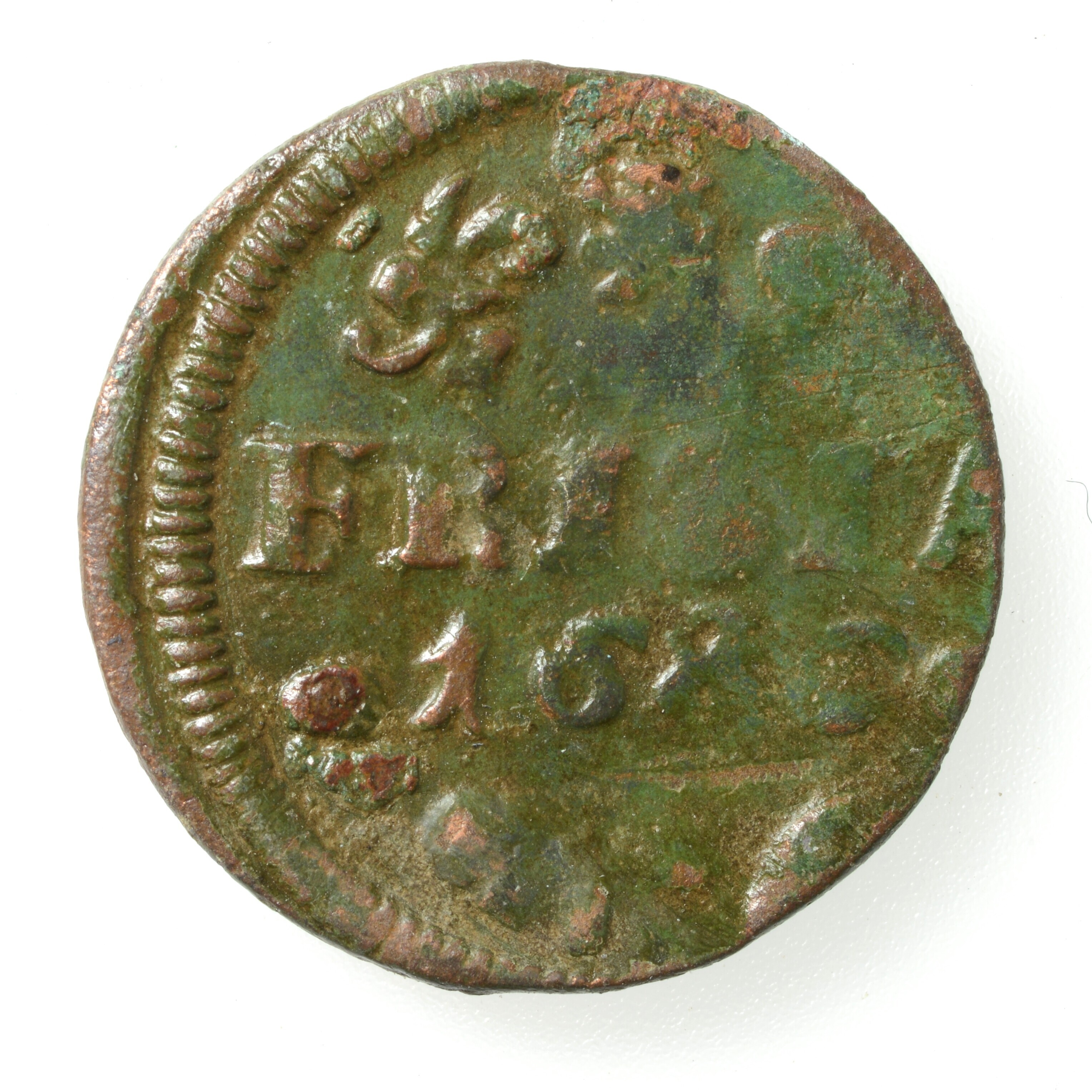 Duit; Friesland Provincie (1581-1795); vz.: Een leeuwtje tussen twee versieringen, daaronder FRISIA in één regel en het jaartal 1685 tussen twee rozetten/bollen. Onder het jaartal een rozet tussen versieringen; kz.: Gekroond wapen van Friesland met twee gaande leeuwen boven elkaar; gewicht: 1.95 gram