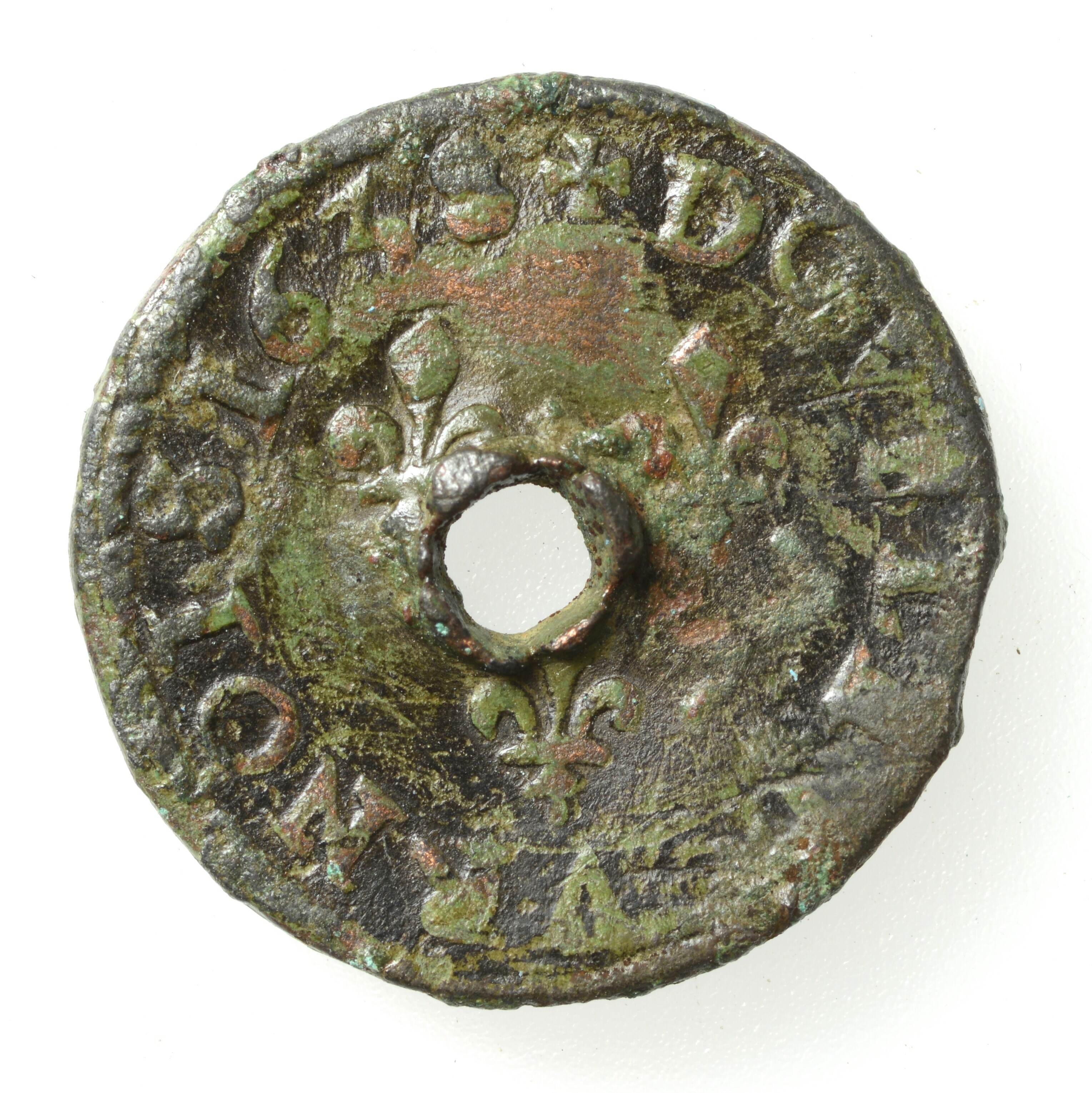 Double Tournois; Koninkrijk Frankrijk (987-1792); Lodewijk XIII (1610-1643); vz.: drie Franse lelies en randtekst DOVBLE TOURNOIS en jaartal 1638?; kz.: buste en randtekst LOYS XIII R DE FRAN ET NAVV; secundaire doorboring; gewicht: 3.18 gram