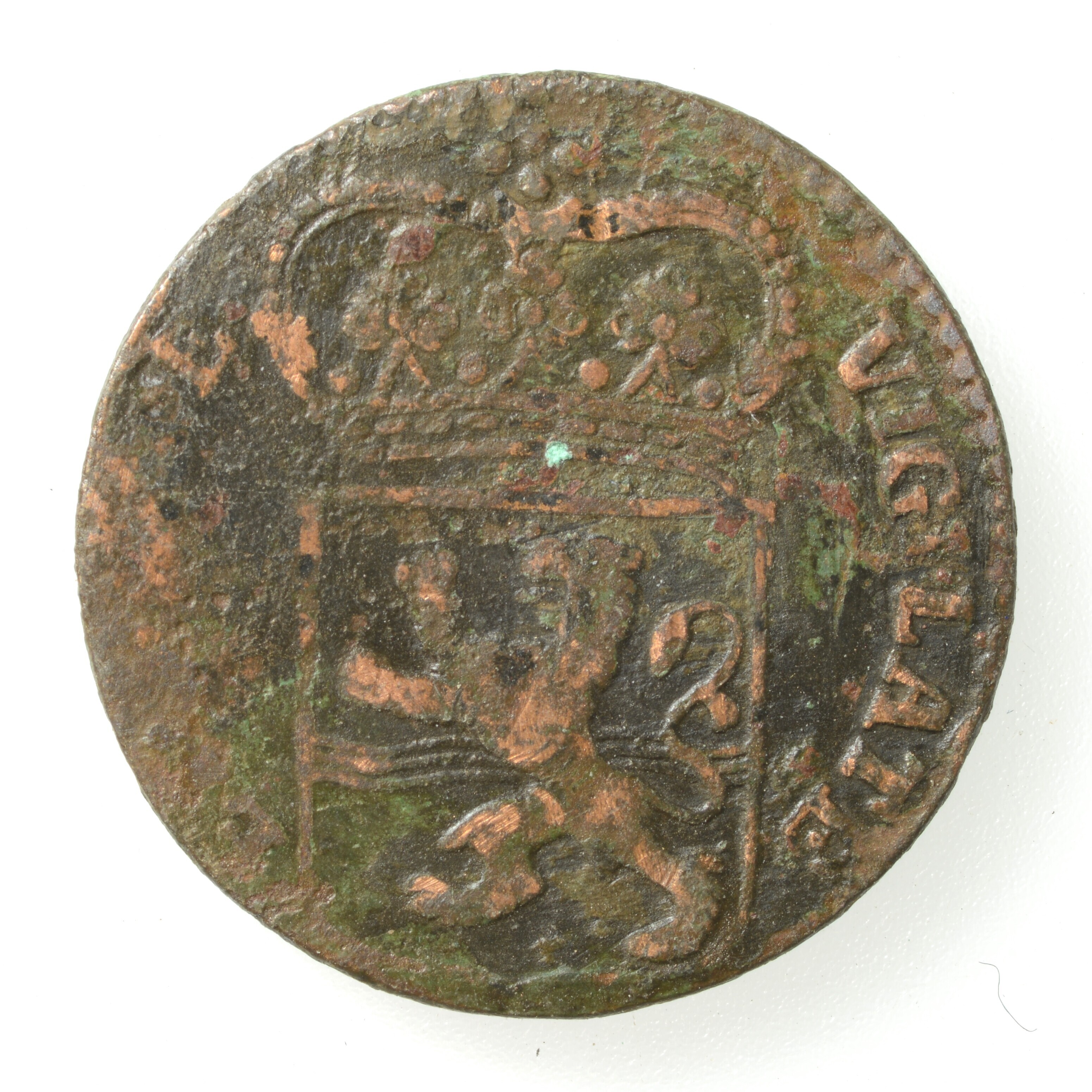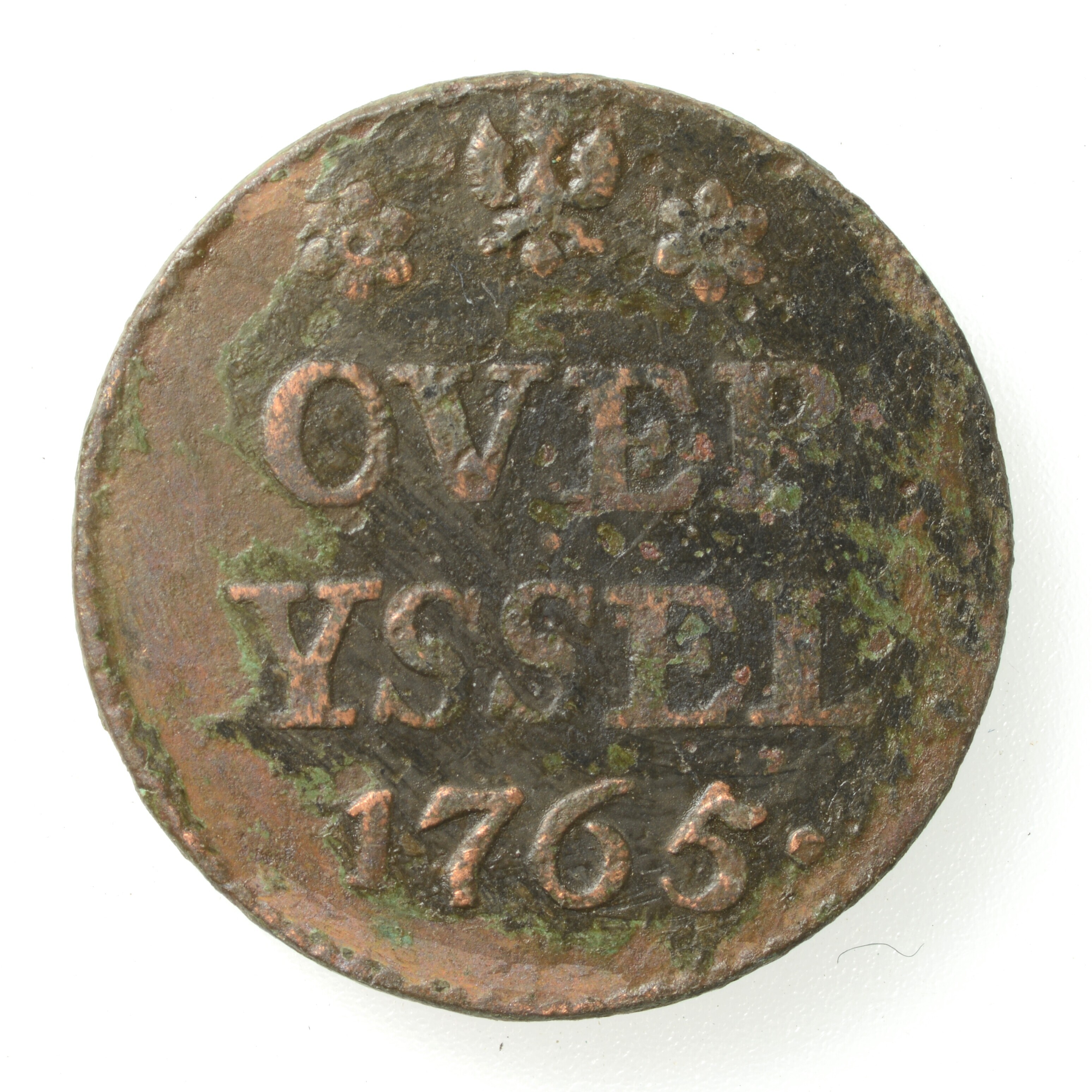 Duit; Overijssel Provincie (1581-1795); vz.: muntmeesterteken adelaar tussen twee rozetten. Daaronder OVER YSSEL en jaartal 1765; kz.: gekroond wapen van Overijssel, hierin staat een klauwende leeuw met op de achtergrond een golvende lijn wat de rivier de IJssel moet voorstellen en de randtekst VIGILATE ET ORATE; gewicht: 2.65 gram