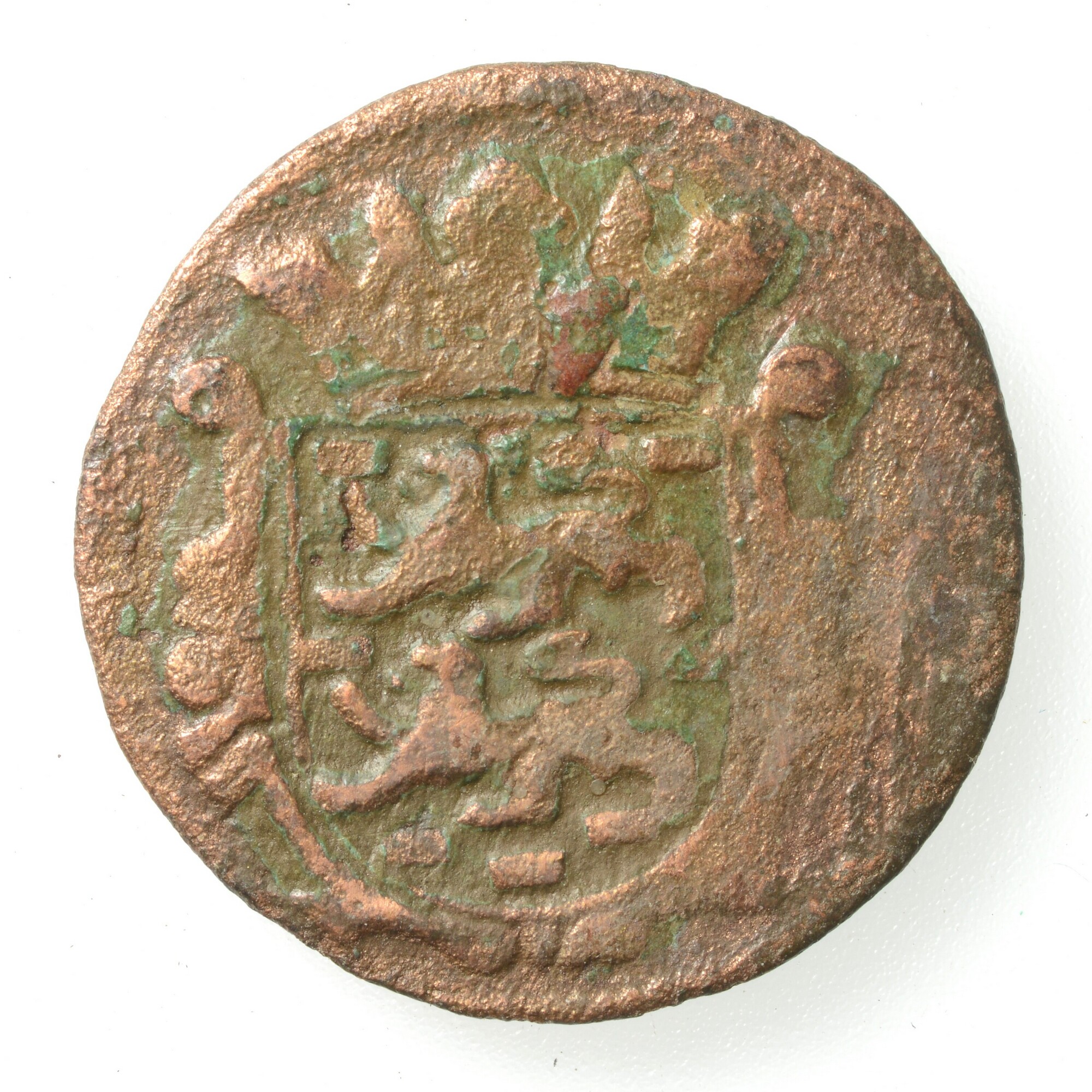 Duit; Friesland Provincie (1581-1795); vz.: Leeuwtje met daaronder FRISIA in één regel?; kz.: Gekroond wapen van Friesland met de twee gaande leeuwen boven elkaar; gewicht: 1.76 gram