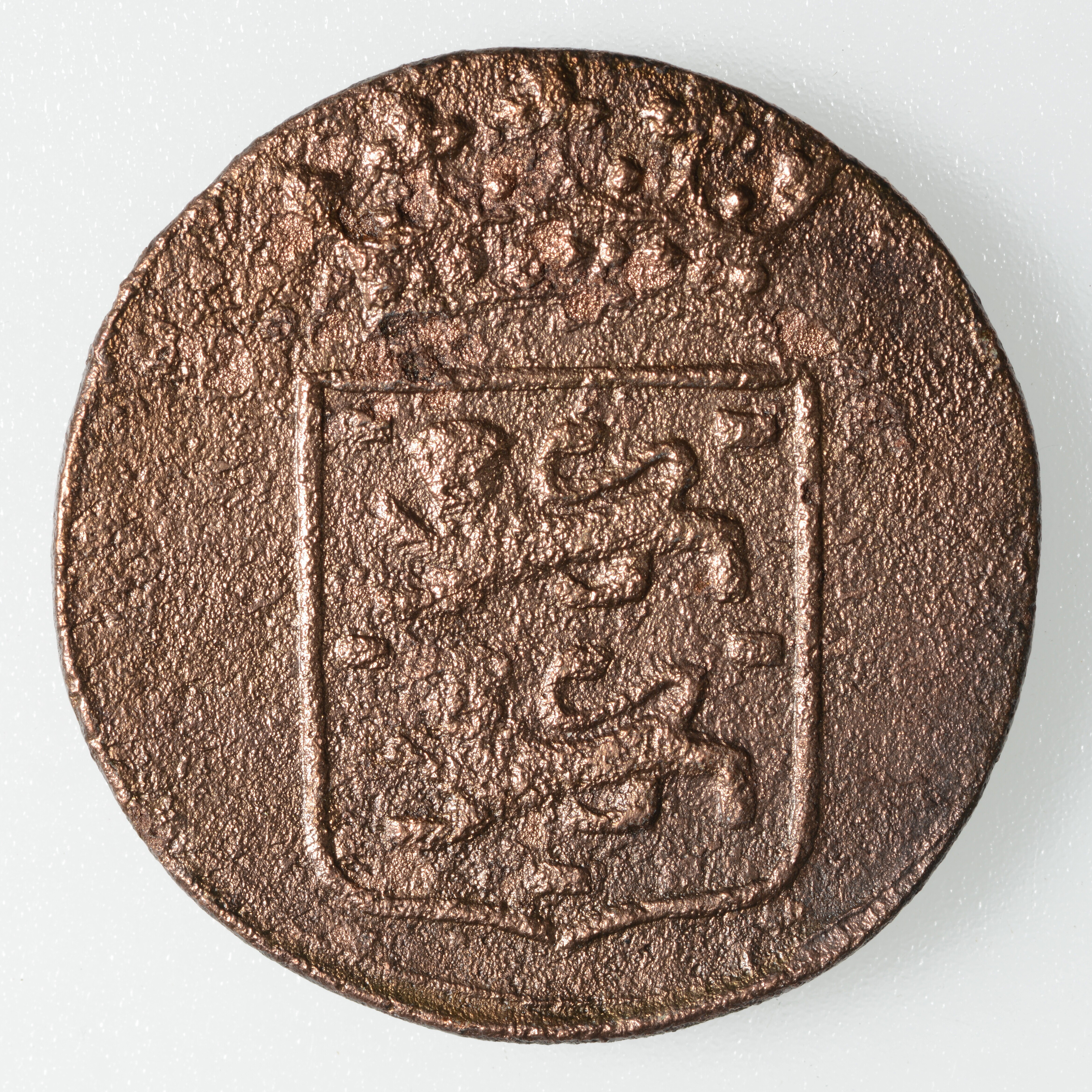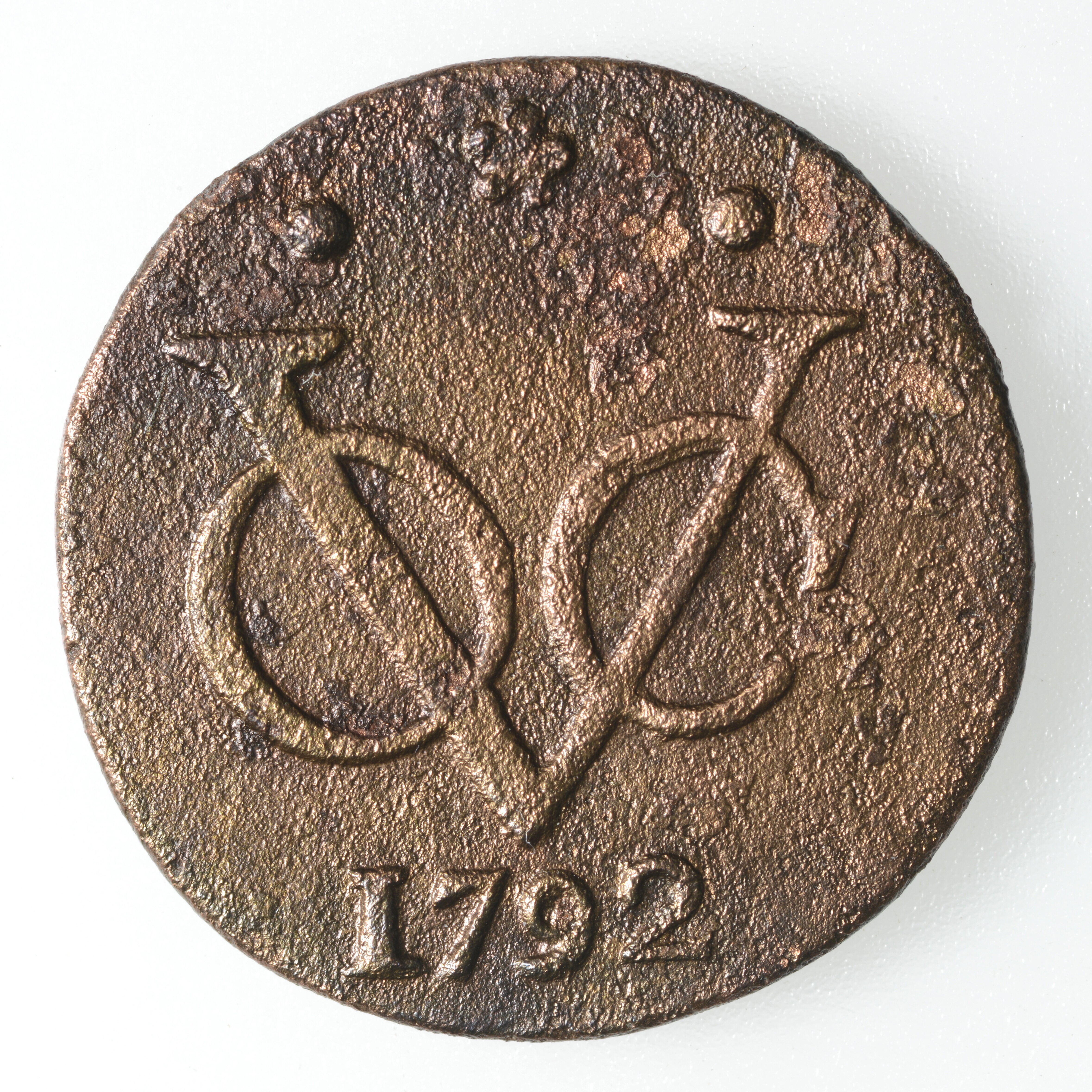 Duit VOC; vz.: V.O.C. monogram met daarboven een vijfbladige rozet tussen punten, onder het monogram het jaartal 1792; kz.: Gekroond wapen van West- Friesland; gewicht: 2.67 gram