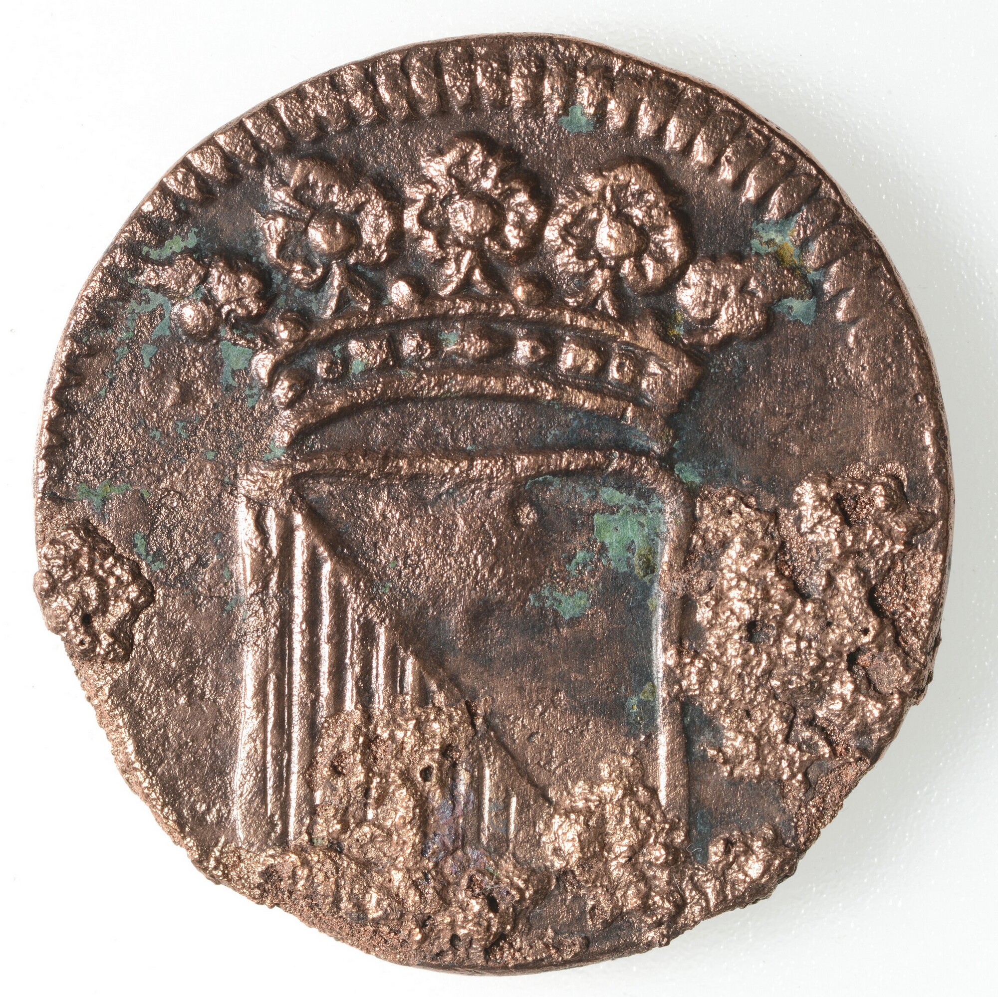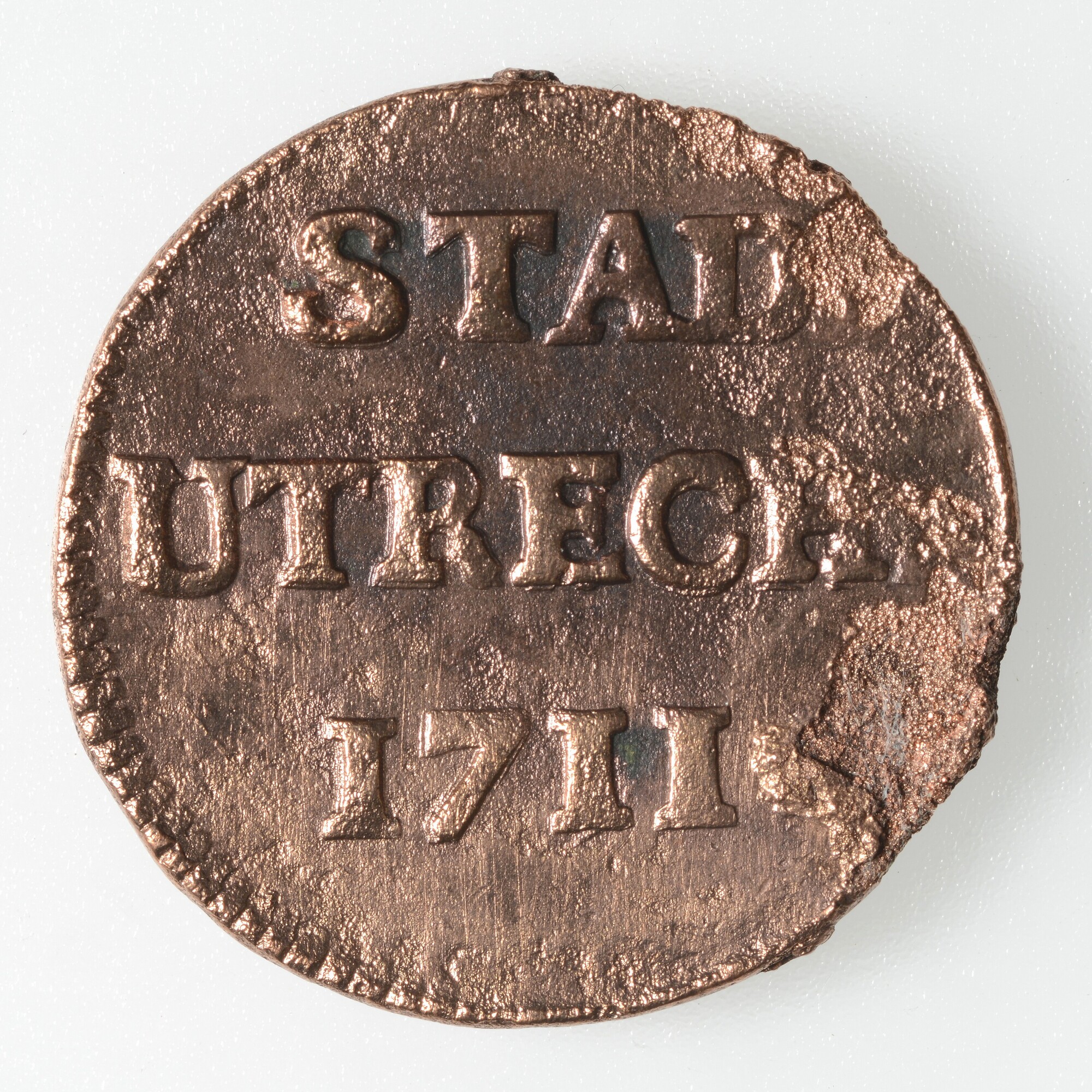 Duit; Stad Utrecht (1581-1795); vz.: STAD UTRECHT in twee regels en daaronder het jaartal 1711; kz.: Licht ingebogen wapenschild van de Stad Utrecht met kroon, in het kwartier linksonder verticale streepjes; gewicht: 3.32 gram