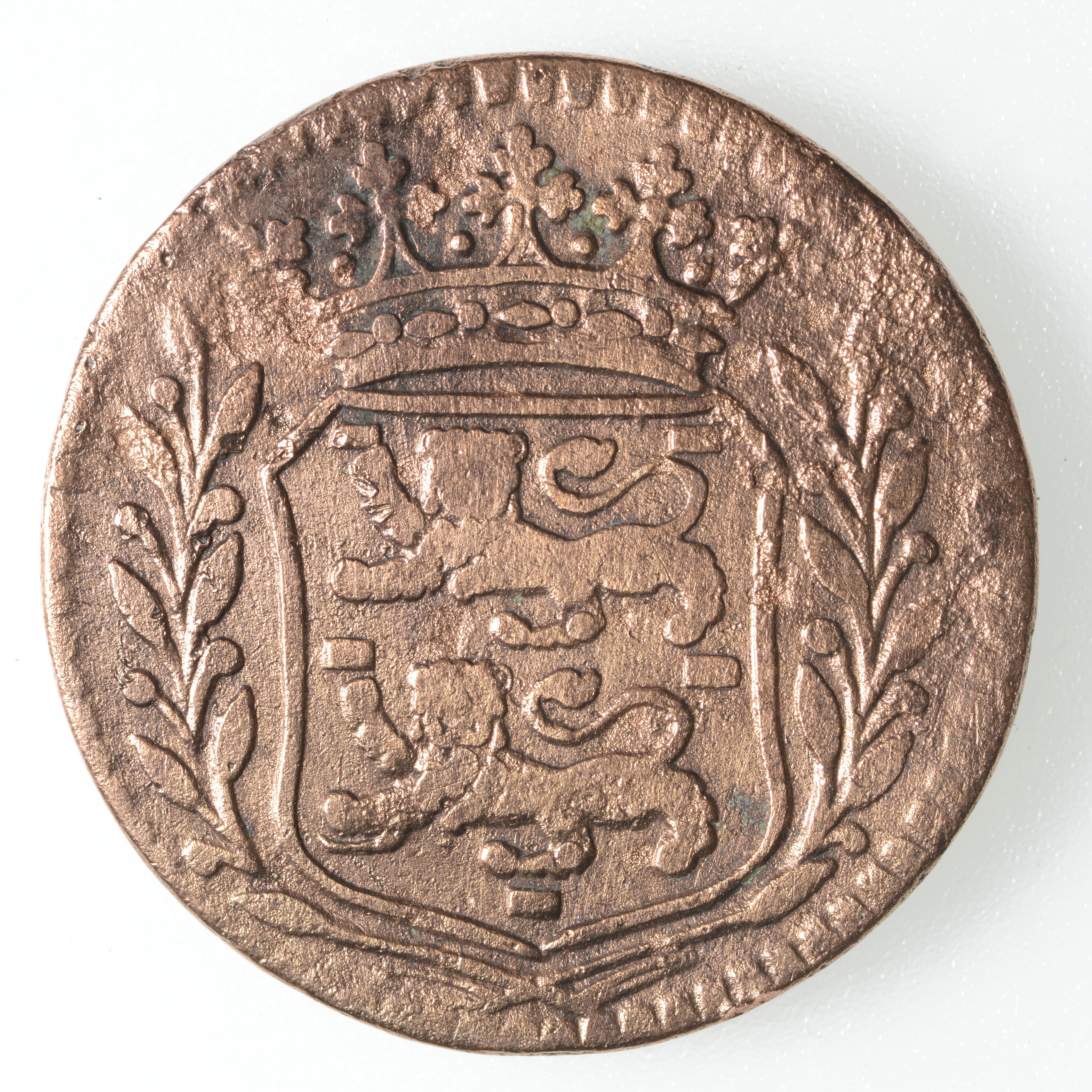 Duit West-Friesland; vz.: Haan, daaronder WEST FRI SIA in drie regels en het jaartal 1754; kz.: Gekroond wapenschild met twee gaande leeuwen boven elkaar. De leeuwen hebben hun kop 'en face' gericht; gewicht: 3.46 gram