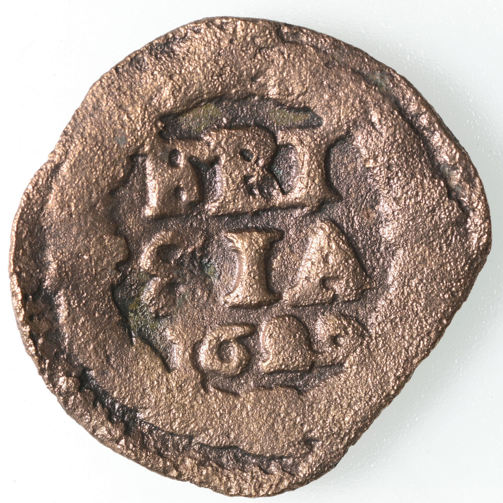 Duit; Friesland Provincie (1581-1792); vz.: een tulpkrans met daarin de tekst FRI SIA in twee regels, daaronder het jaartal 1629; kz.: gekroond wapen van Friesland met twee gaande leeuwen boven elkaar; gewicht: 2.05 gram