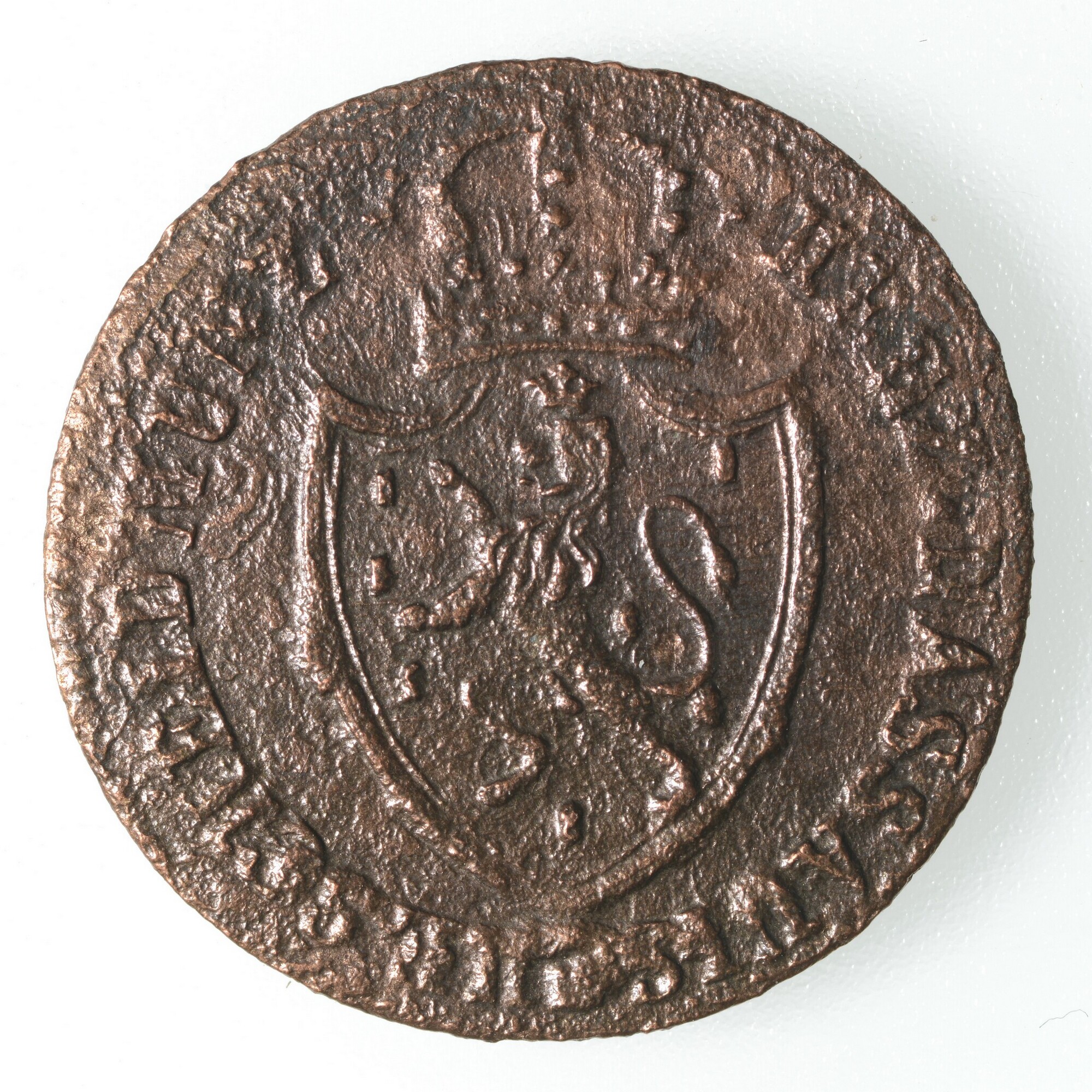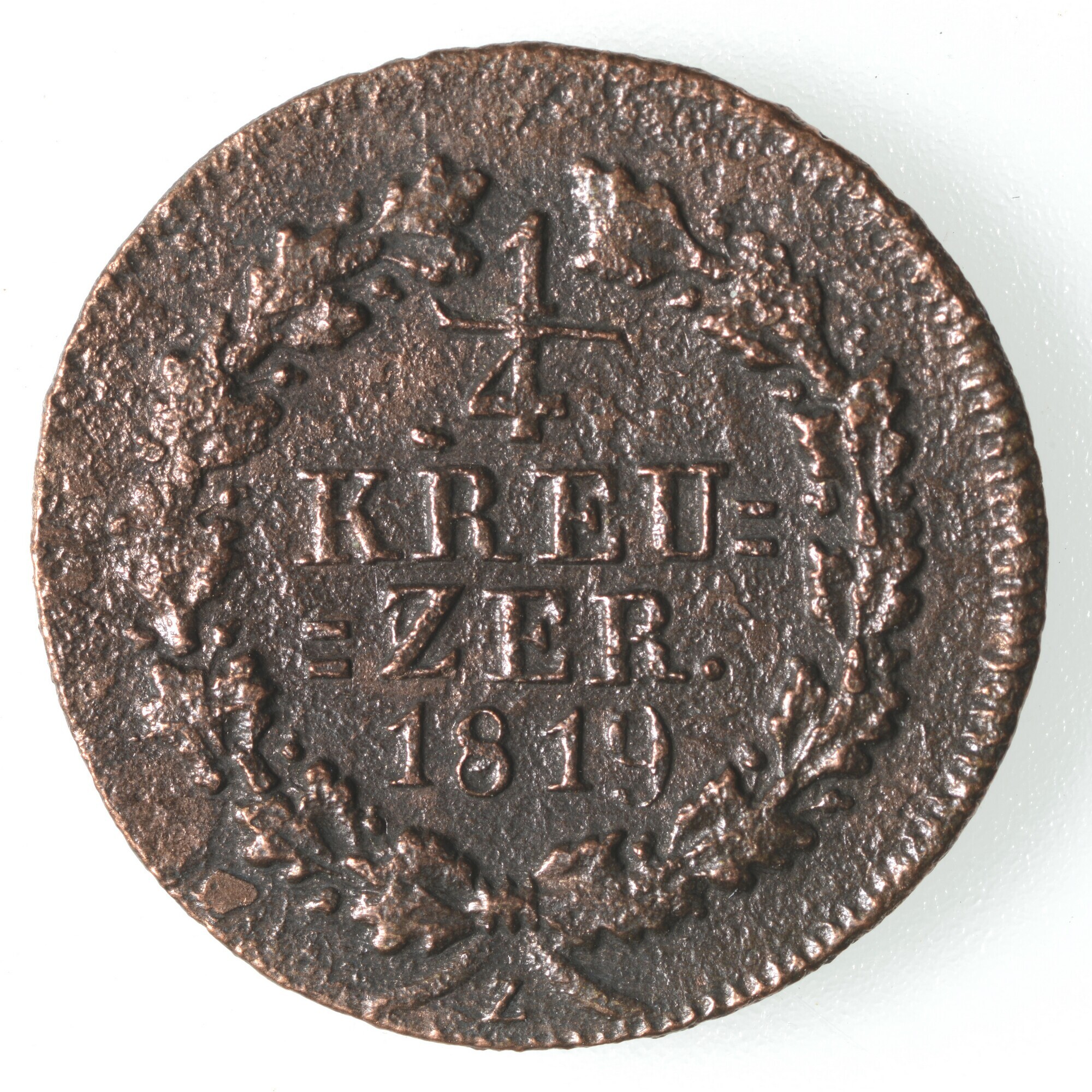 1/4 Kreuzer; Hertogdom Nassau (1806-1866); Wilhelm I (1816-1839); vz.: gekroond wapen van gekroonde klimmende leeuw op horizontaal gearceerd veld bezaaid met blokken en randtekst HERZOGTUM:NASSAU:SCHEIDE:MÜNZE; kz.: 1/4 KREU ZER en jaartal 1819 in krans van twee met strik samengebonden eikentakken. Onder de strik Z (onbekende muntmeester?); gewicht: 1.10 gram
