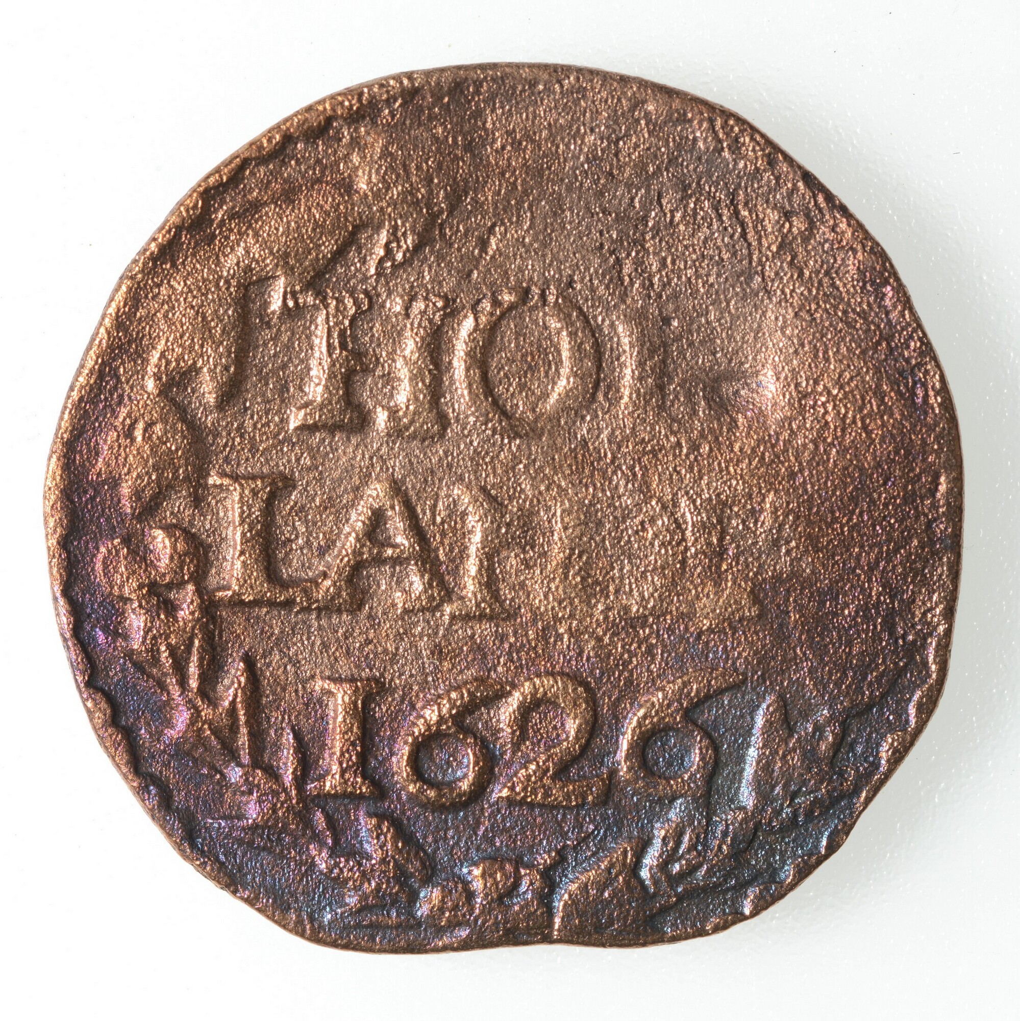 Duit; Holland Provincie (1581-1792); vz.: een tulpkrans met daarin de tekst HOL LANDIA in twee regels (met N & D aan elkaar vast) en daaronder het jaartal 1626; kz.: de Hollandse maagd zittende in een gesloten tuin. Zij wijst met haar rechterhand naar een zonnige hemel als teken van het vertrouwen op de Heer en ...