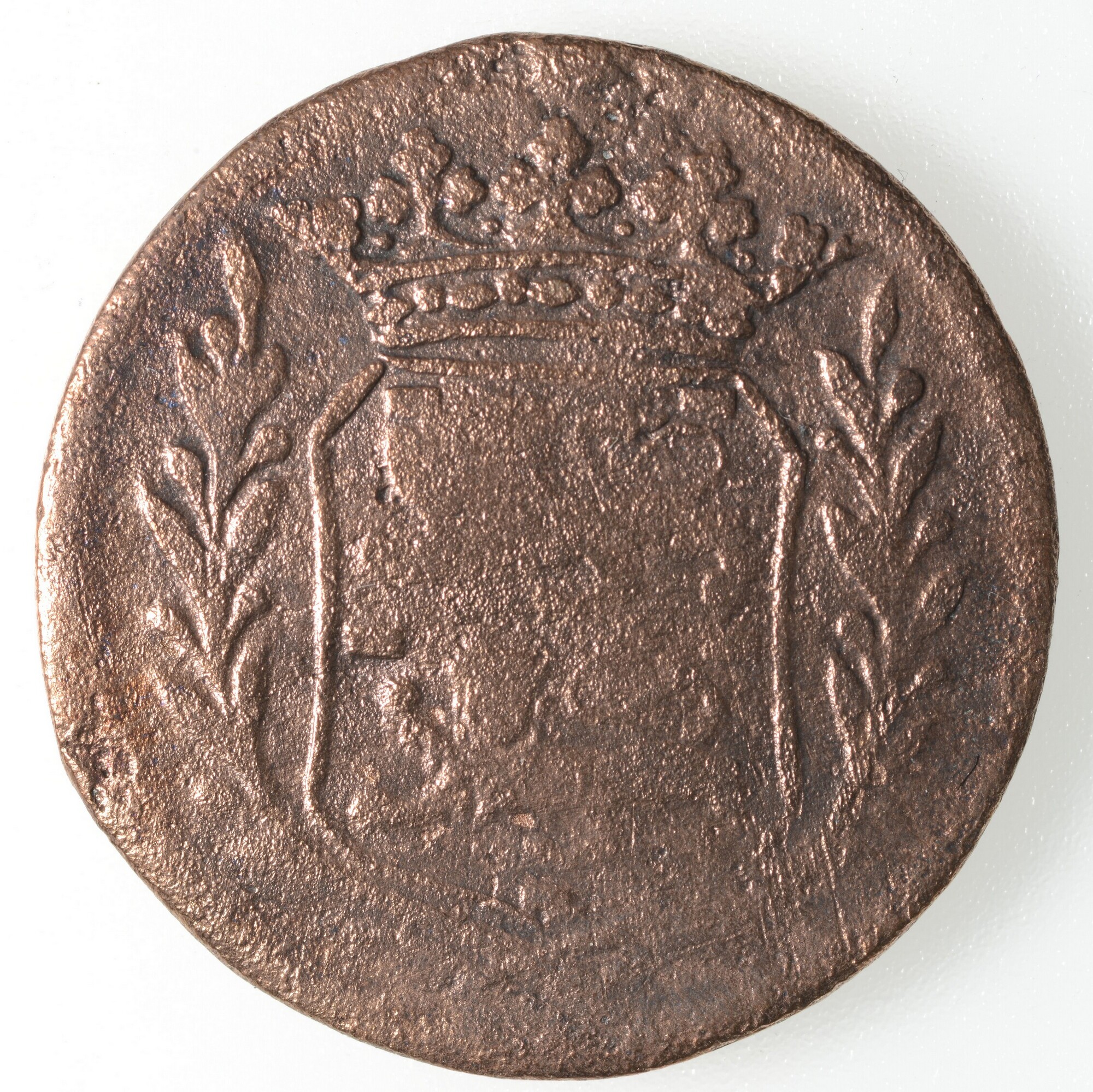 Duit West-Friesland; vz.: knol, daaronder WEST FRI SIAE in drie regels en het jaartal 1739; kz.: gekroond wapenschild met twee gaande leeuwen boven elkaar. De leeuwen hebben hun kop 'en face' gericht. Het wapen is aan beide zijden versierd met lauwertakken; gewicht: 3.38 gram