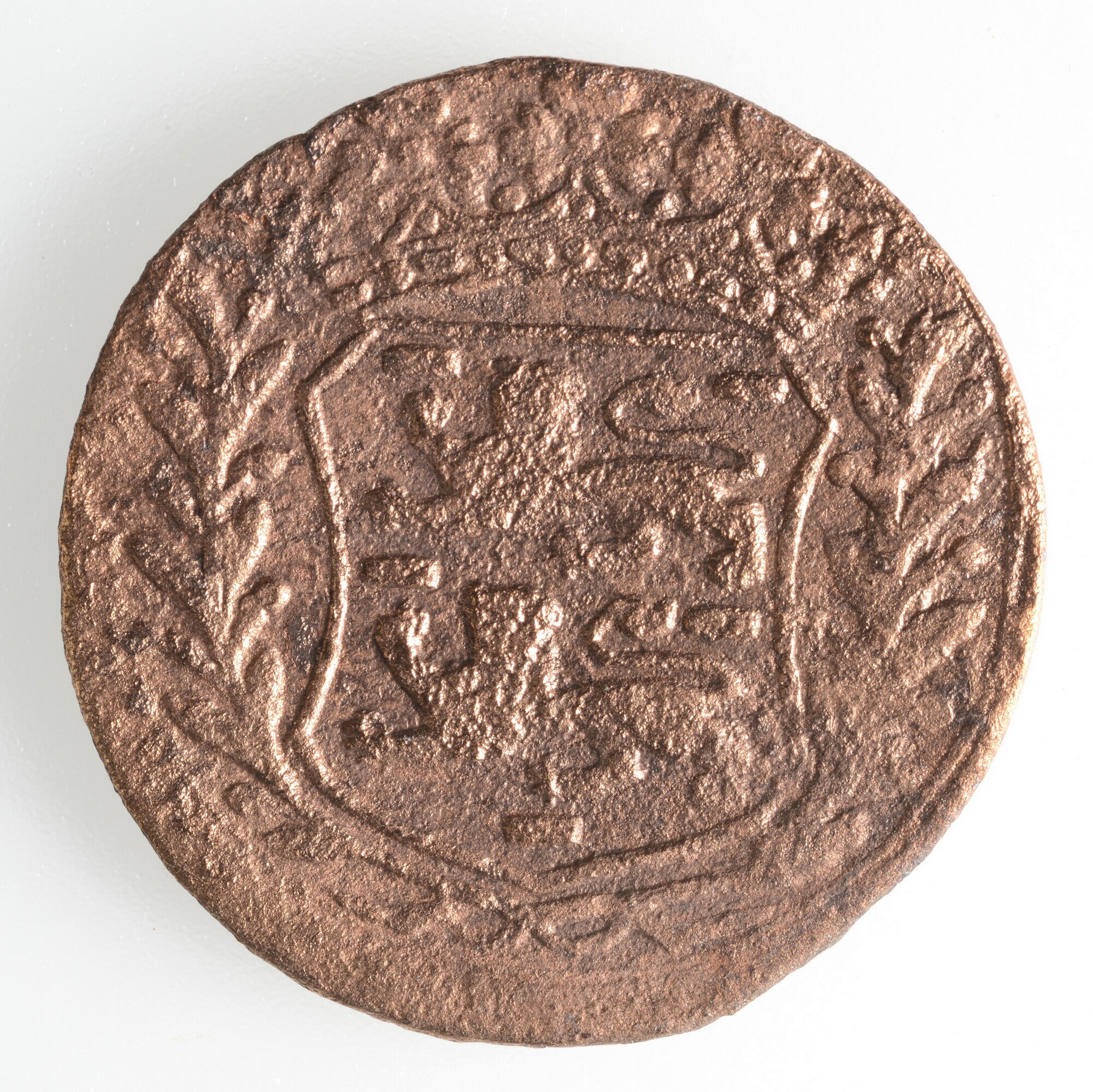 Duit West-Friesland; vz.: knolraap, de tekst WEST FRI SIAE in drie regels met hieronder het jaartal 1720; kz.: gekroond wapenschild met twee gaande leeuwen boven elkaar. De leeuwen hebben hun kop 'en face' gericht en het wapen is versierd met lauwertakken; gewicht: 2.65 gram