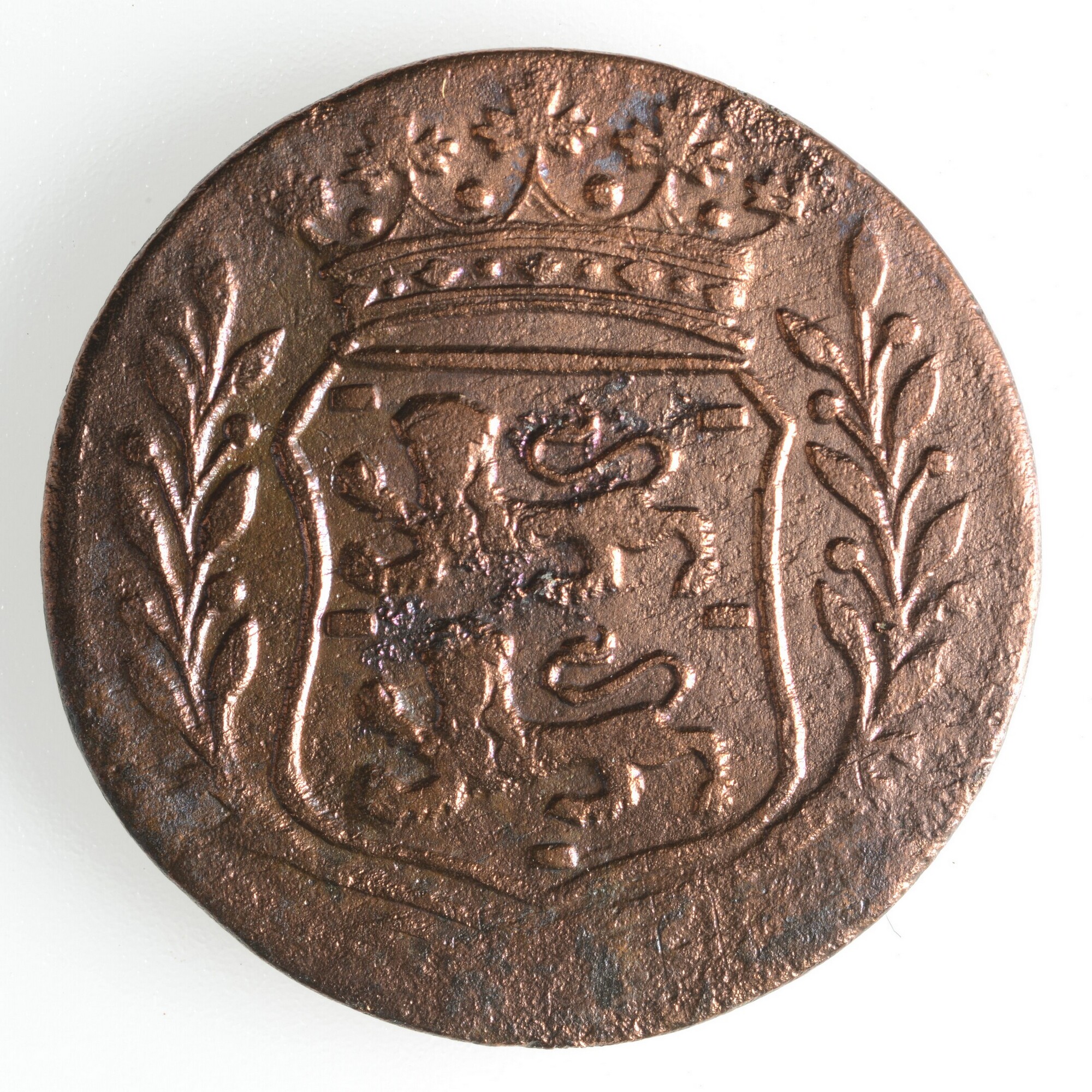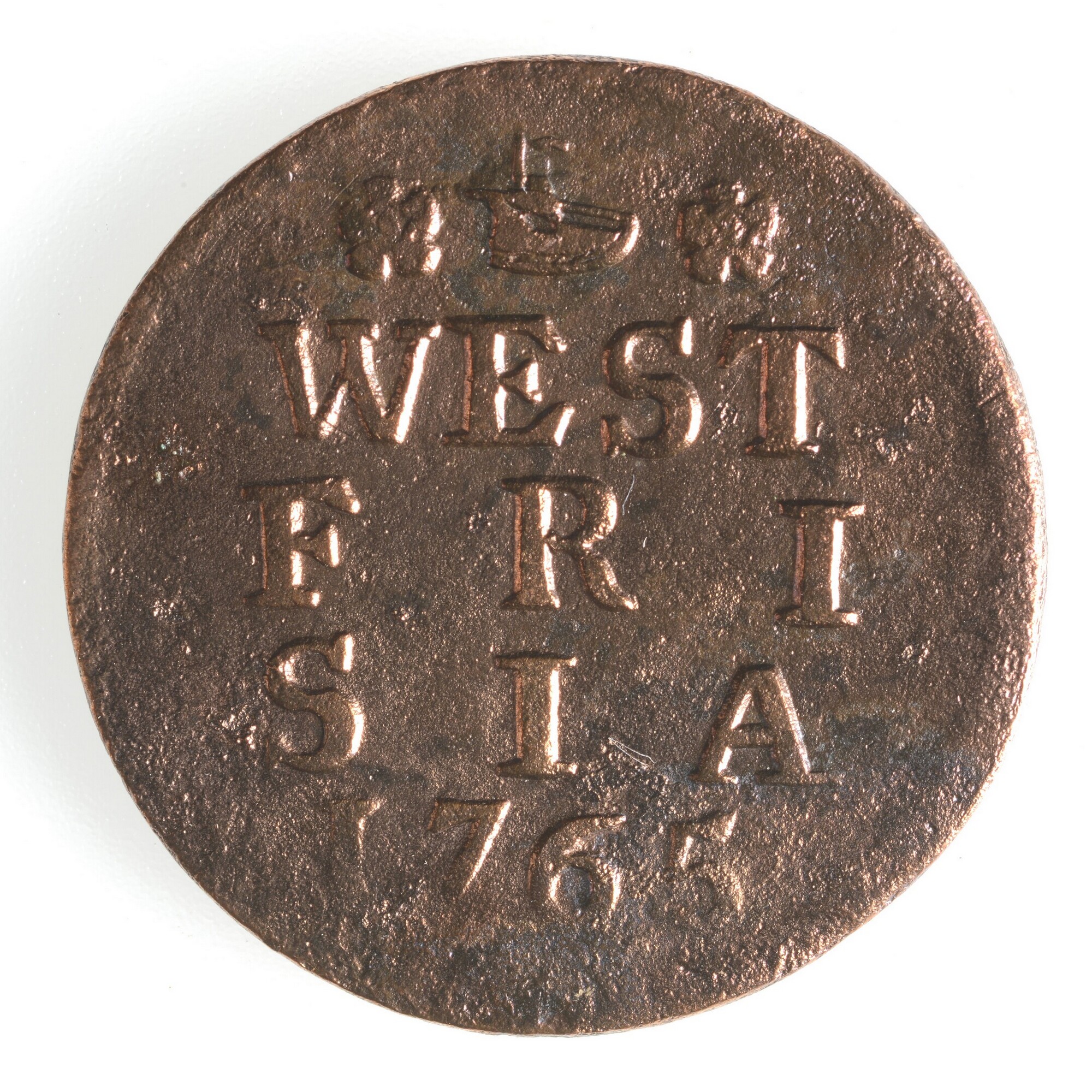 Duit West-Friesland; vz.: haringbuis, daaronder WEST FRI SIA in drie regels en jaartal 1765; kz.: gekroond wapenschild met twee gaande leeuwen boven elkaar. De leeuwen hebben hun kop 'en face' gericht en het wapen is versierd met lauwertakken; gewicht: 3.11 gram