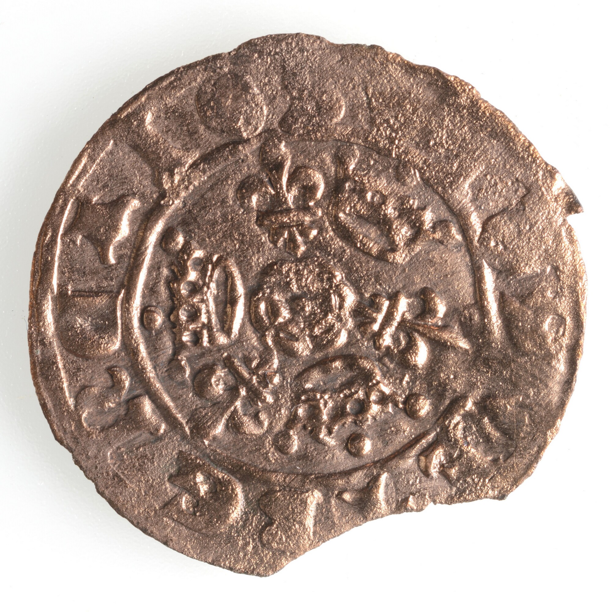 Rekenpenning Neurenberg; vz.: rijksappel met pseudorandtekst; kz.: 3 kronen en 3 lelies met pseudorandtekst; gewicht: 1.59 gram