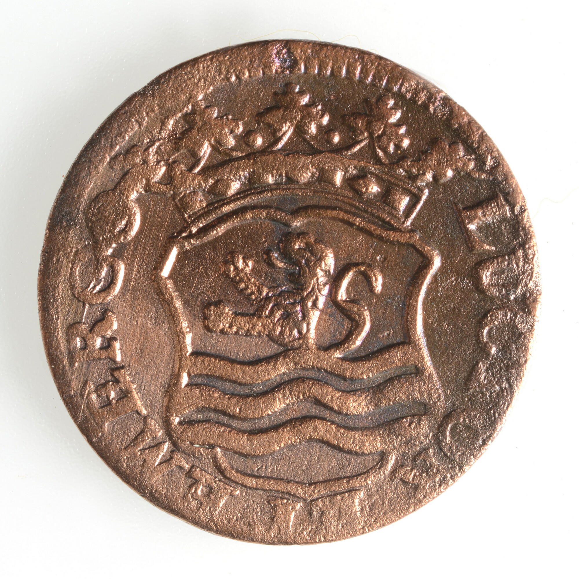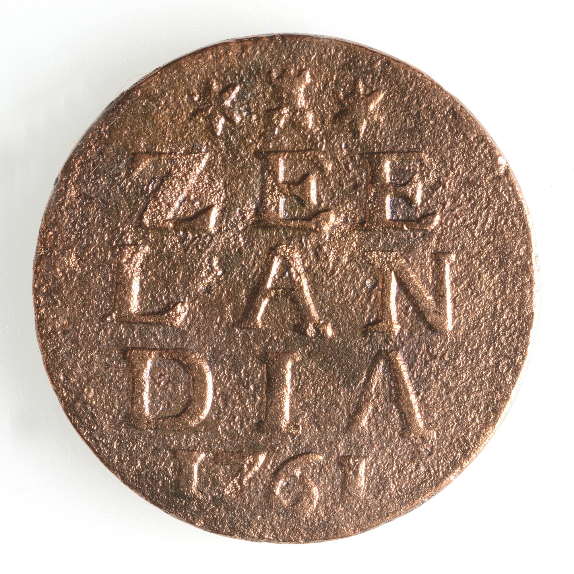 Duit; Zeeland Provincie (1581-1795); vz.: burchtje met daaronder ZEE LAN DIA in drie regels en het jaartal 1761; kz.: een gekroond ingebogen wapen met leeuw in de golven en randtekst LUCTOR ET EMERGO; gewicht: 2.89 gram