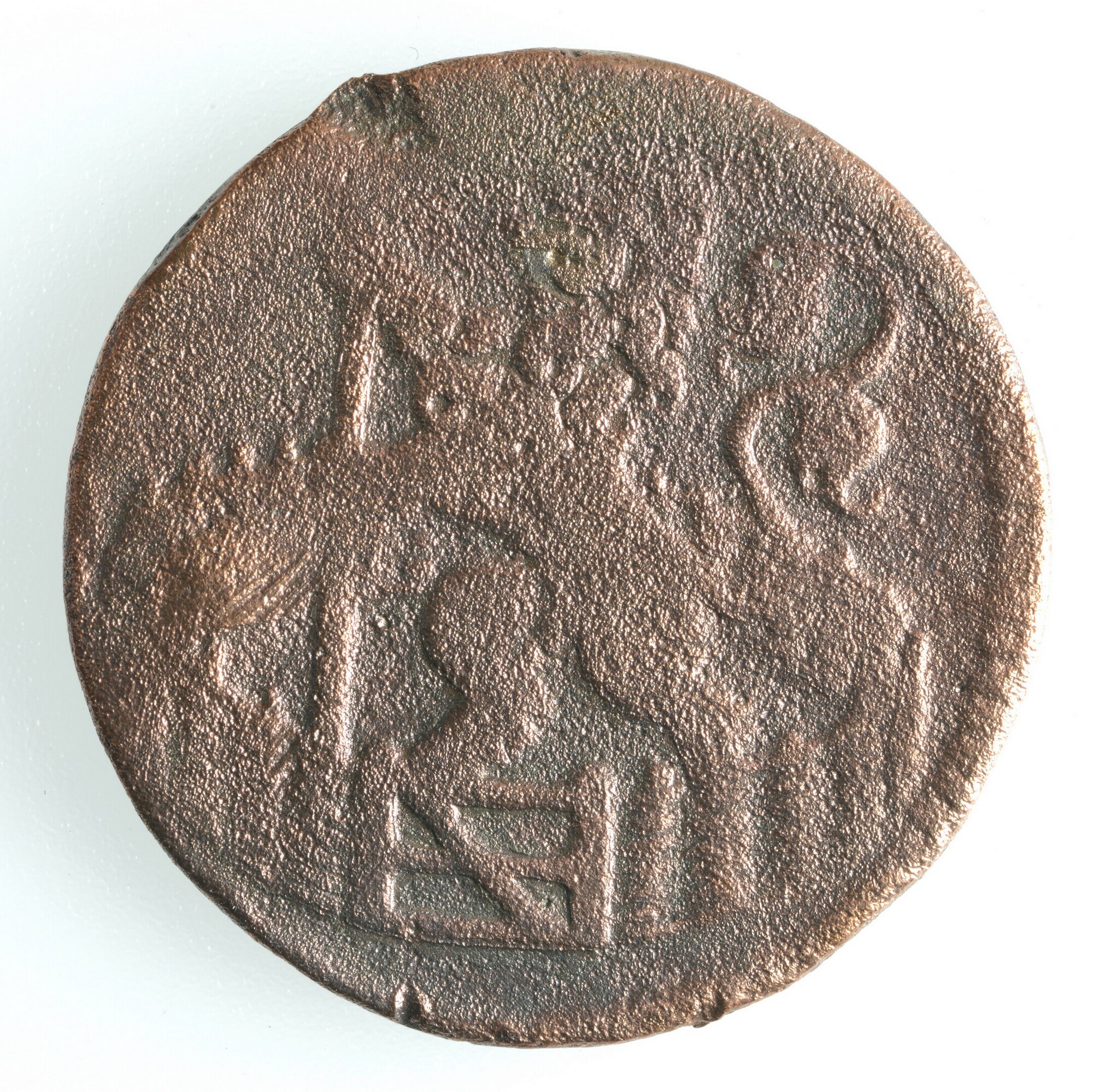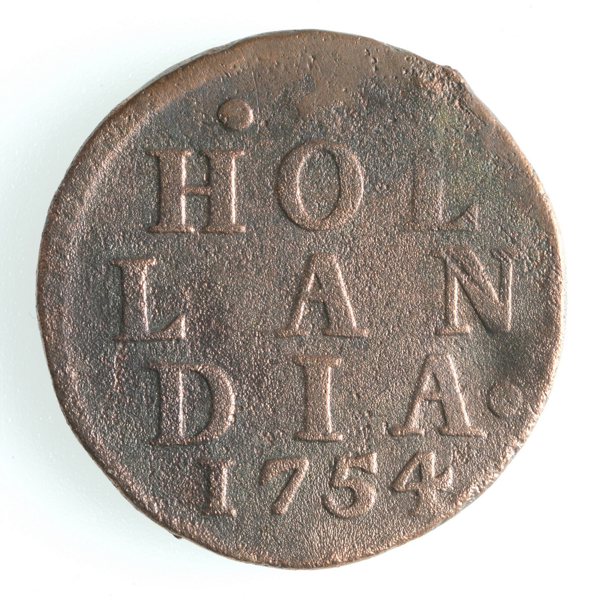 Duit; Holland Provincie (1581-1795); vz.: HOL LAN DIA. in drie regels en het jaartal 1754; kz.: een leeuw naar links in een gesloten Hollandse tuin. De leeuw heeft met zijn klauwen een speer vast met op de punt de zogenaamde vrijheidshoed; gewicht: 3.03 gram