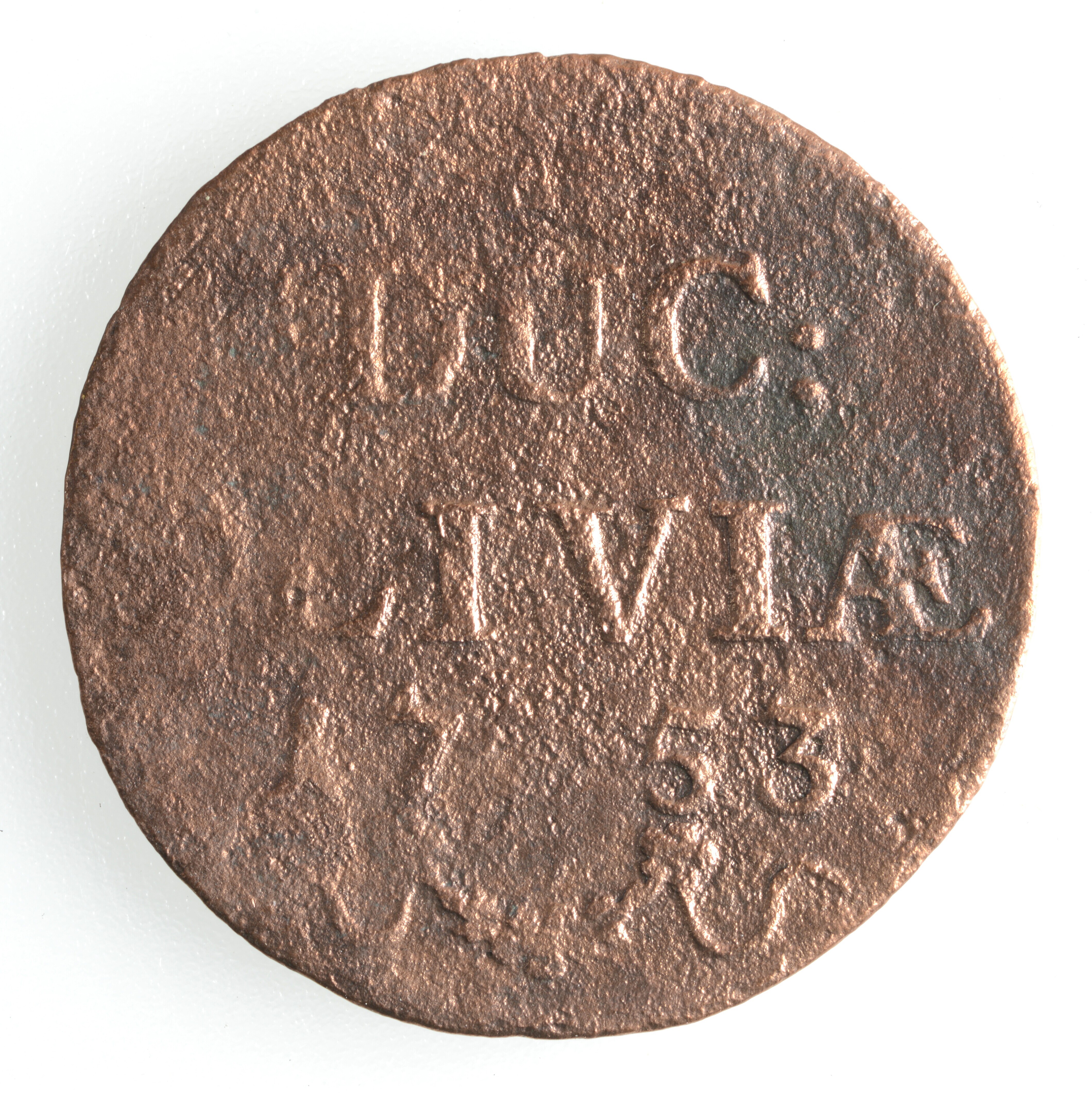 Duit; Kleef hertogdom (1417-1795); vz.: DUC: CLIVIÆ en jaartal 1753, boven de tekst een rozet en onder de tekst een versiering met rozetvormen; kz.: Gekroond wapen van Kleef, vastgehouden door 2 leeuwen. Onder het wapen zijn enkele versieringen aangebracht; gewicht: 1.10 gram