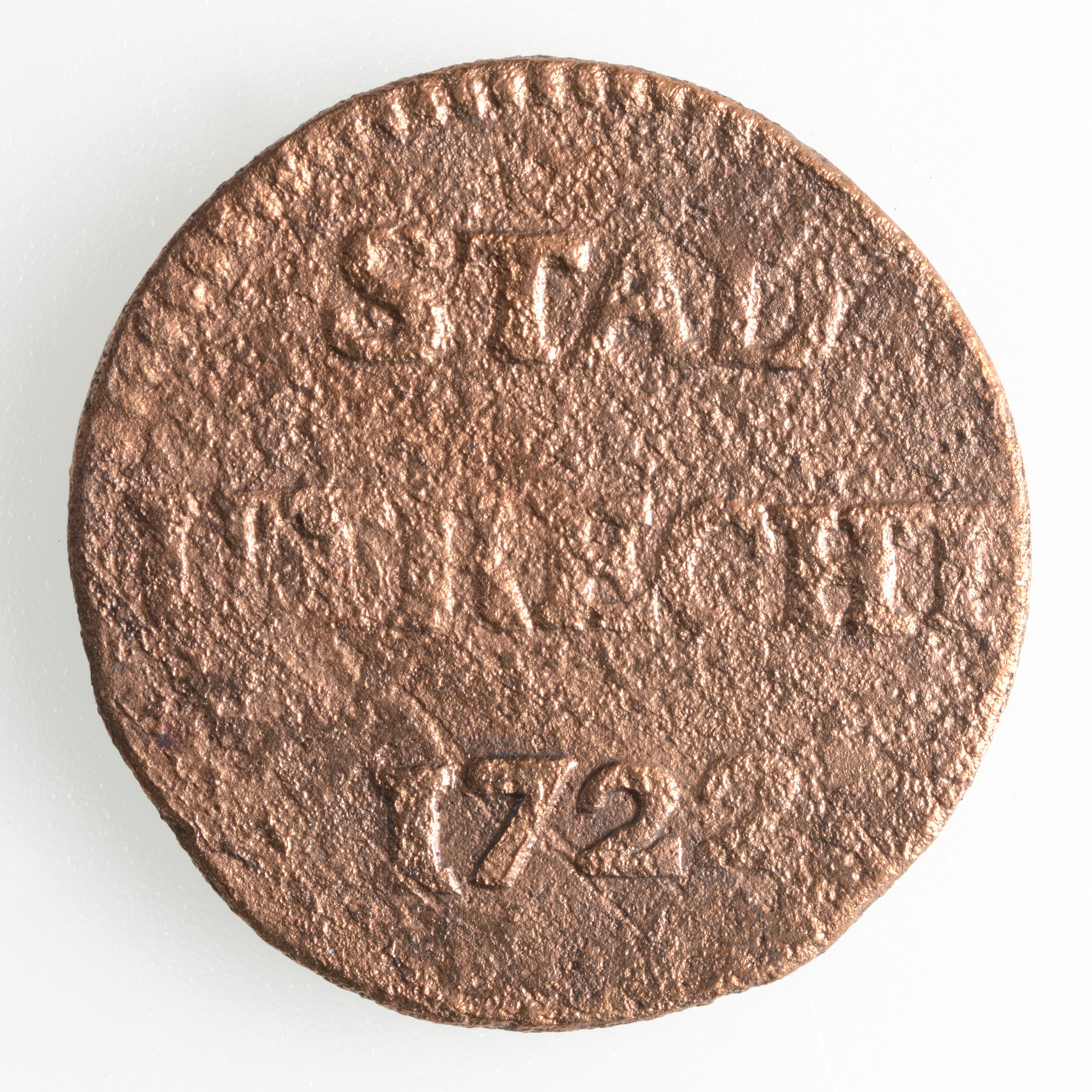 Duit; Stad Utrecht (1581-1795); vz.: STAD UTRECHT in twee regels en daaronder het jaartal 1722; kz.: licht ingebogen wapenschild van de Stad Utrecht met kroon, in het kwartier linksonder verticale streepjes; gewicht: 2.77 gram
