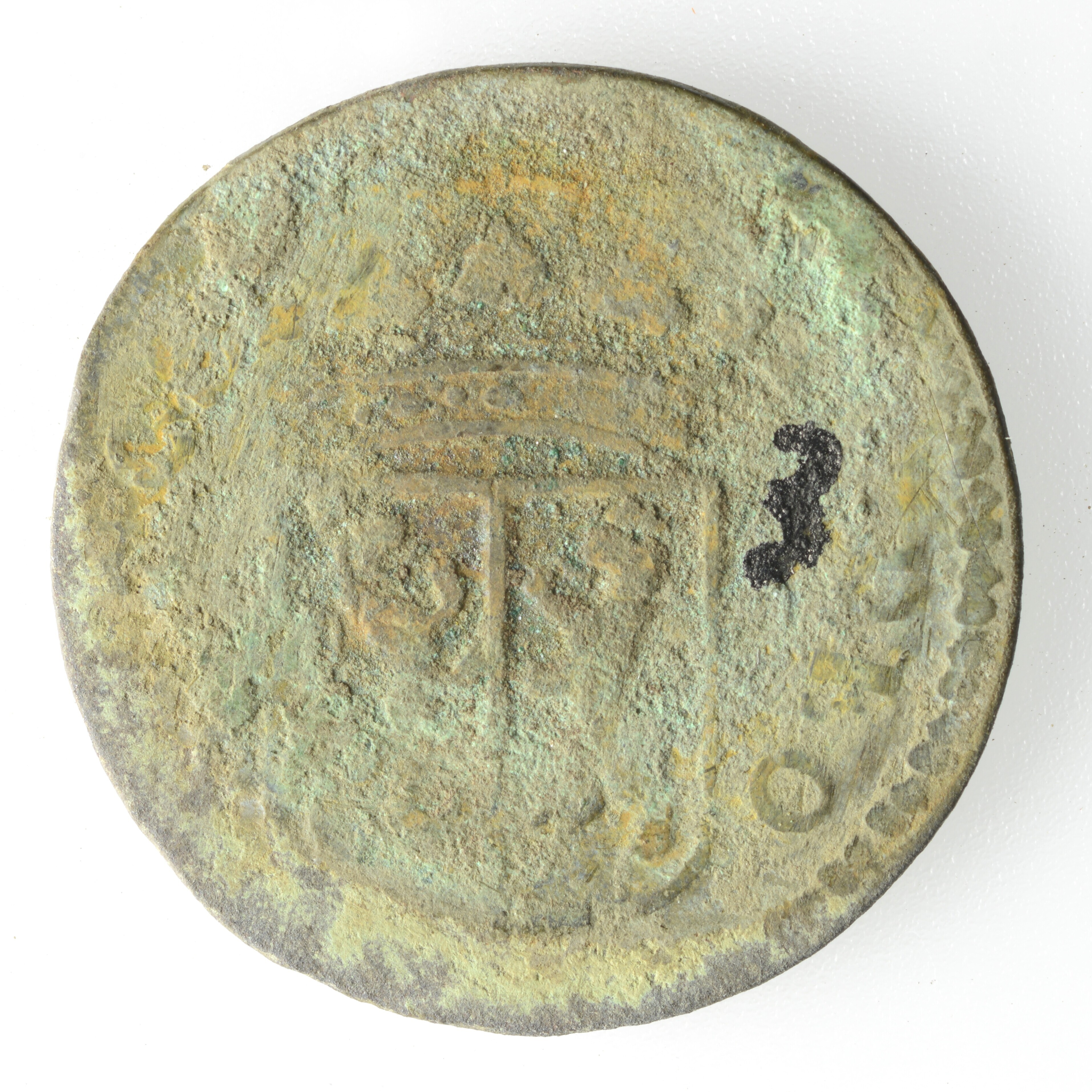 Duit; Gelderland Provincie (1581-1795); vz.: Een versiering van bladertakken met daartussen de tekst ‚ D ‚ GEL RIÆ in drie regels; kz.: Gekroond wapen van Gelderland. Tekst: IN DEO SP. NOS; gewicht: 2.59 gram