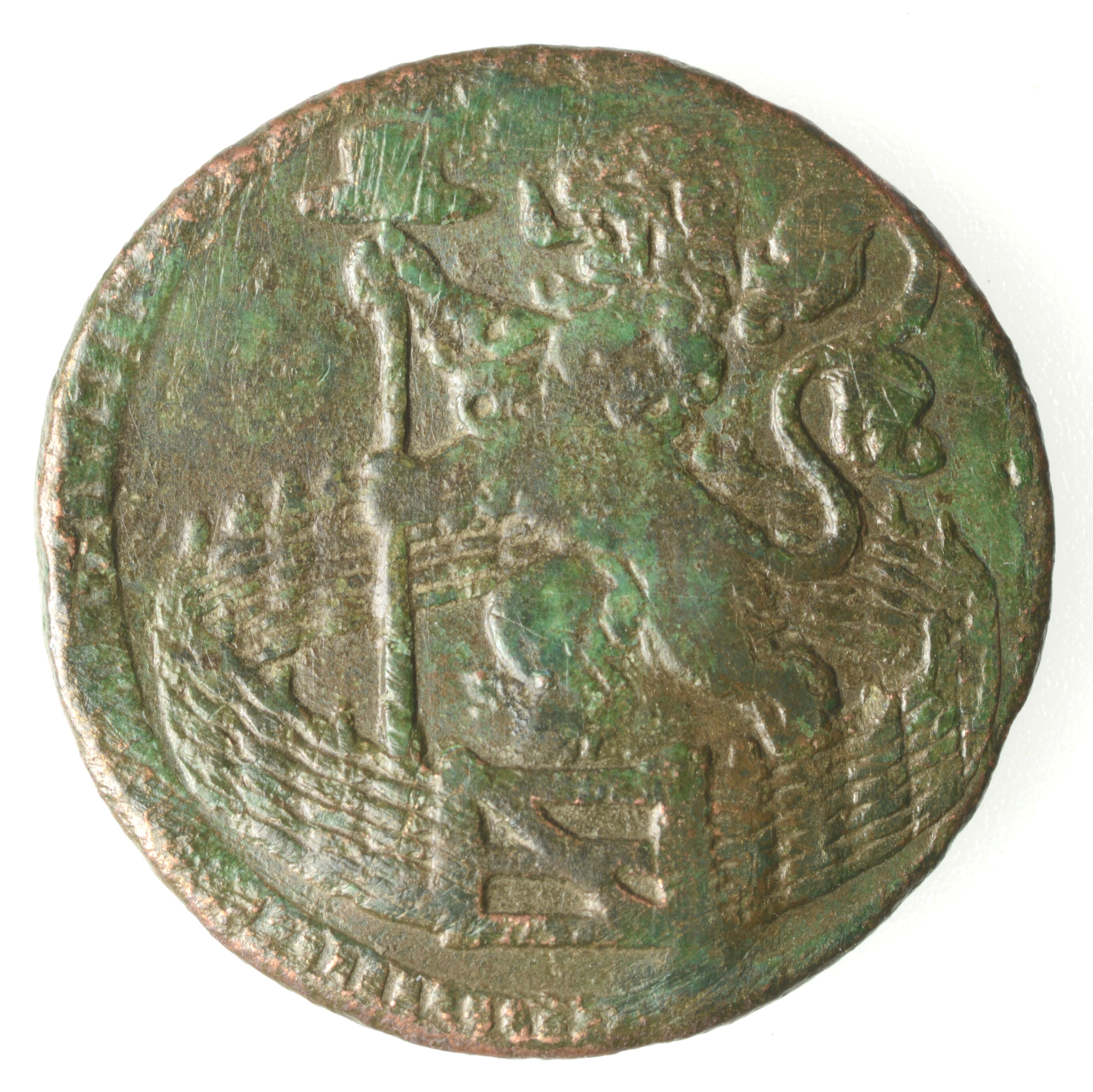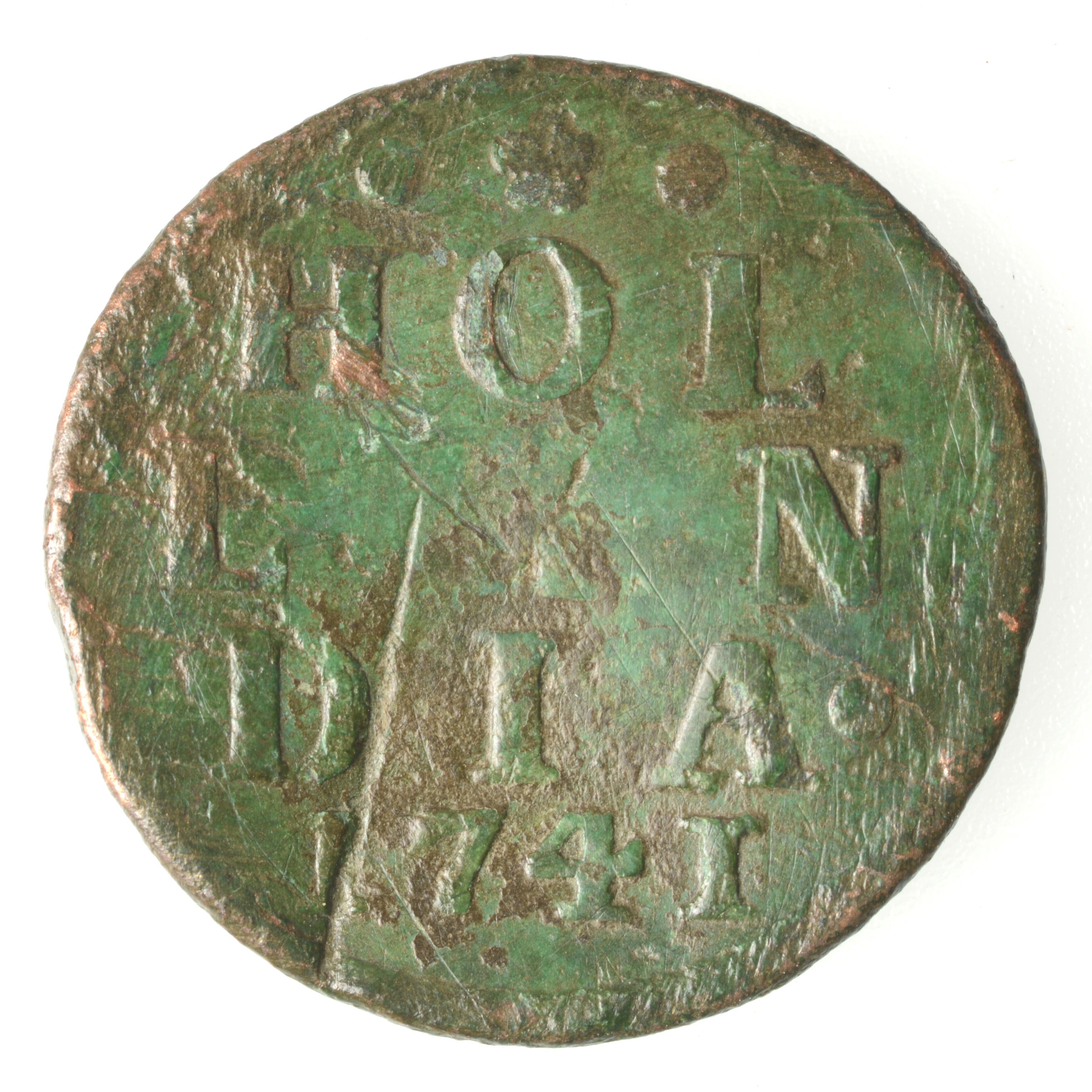 Duit; Holland Provincie (1581-1795); vz.: in vijf regels • (rozet) • / HOL / LAN / DIA• / 1741; kz.: een leeuw naar links in een gesloten Hollandse tuin. De leeuw heeft met zijn klauwen een speer vast met op de punt de zogenaamde vrijheidshoed; muntplaats: Dordrecht; gewicht: 2.85 gram