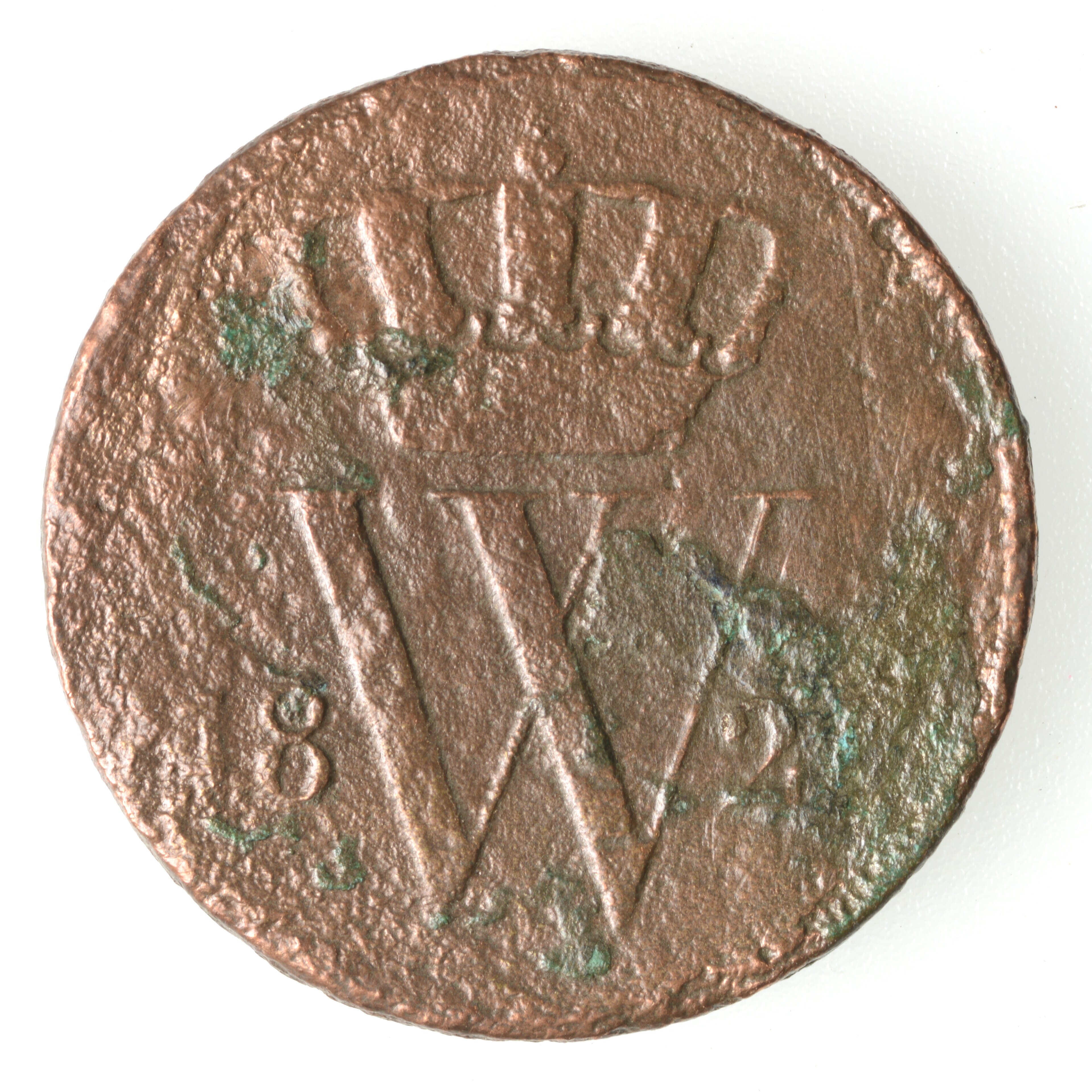 1 Cent; Nederland Koninkrijk (1813-heden); Willem I (1813-1840); vz.: Gekroonde W tussen jaartal 18 en 2(?); kz.: Gekroond Nederlands wapen tussen 1 en C; muntplaats: Utrecht; gewicht: 3.07 gram