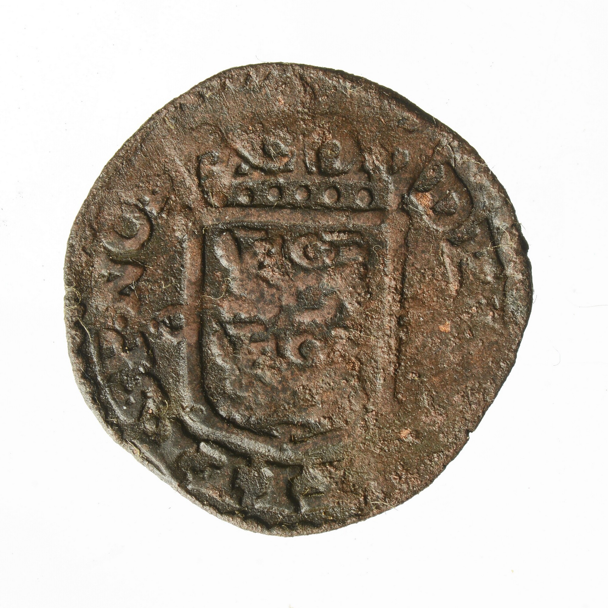 Duit; West-Friesland; vz.: bladerkrans met WEST / FRISIÆ / 1658 in drie regels; kz.: gekroond wapen van West-Friesland met omschrift DEVS • FORTI • ET • SP • NOS; gewicht: 1.29 gram