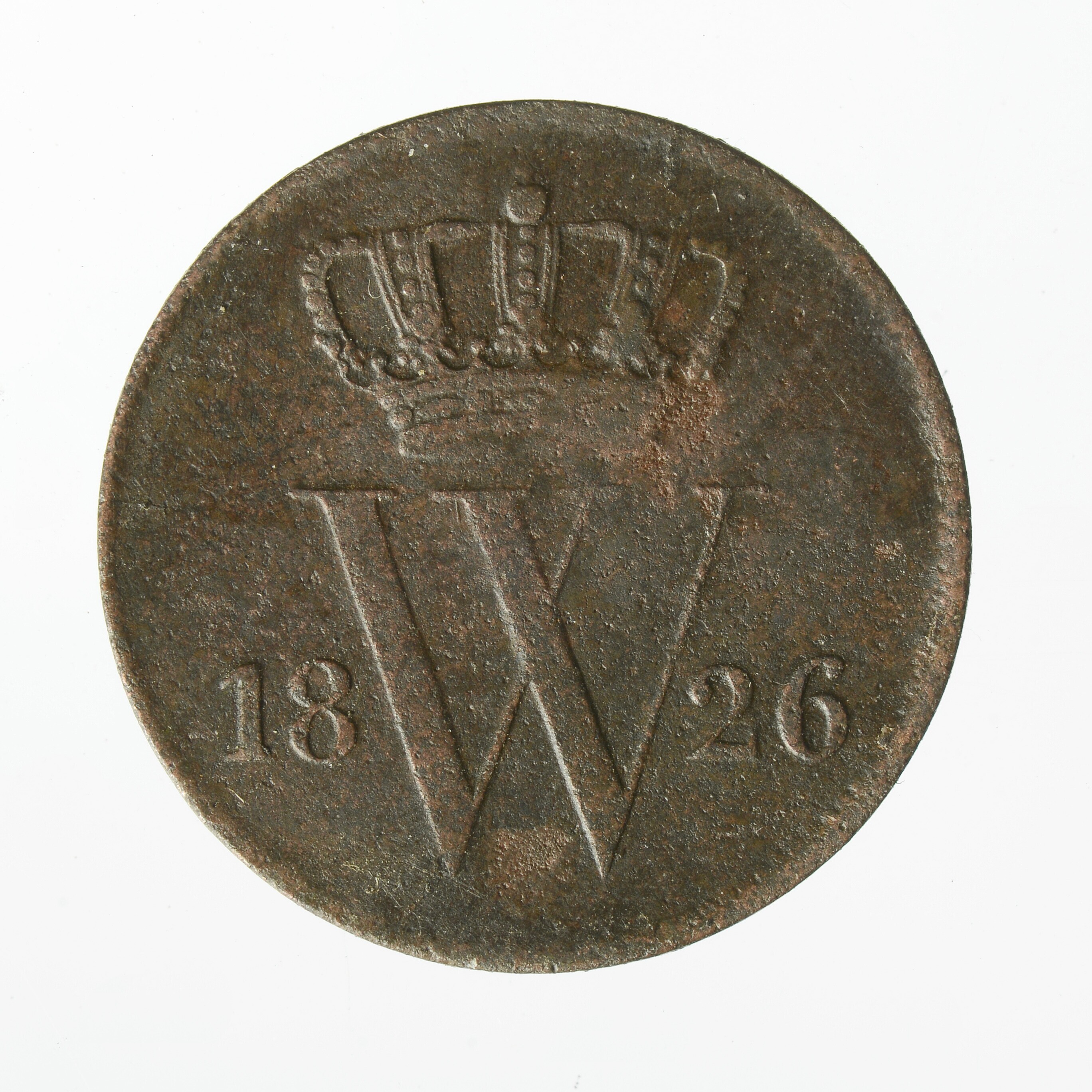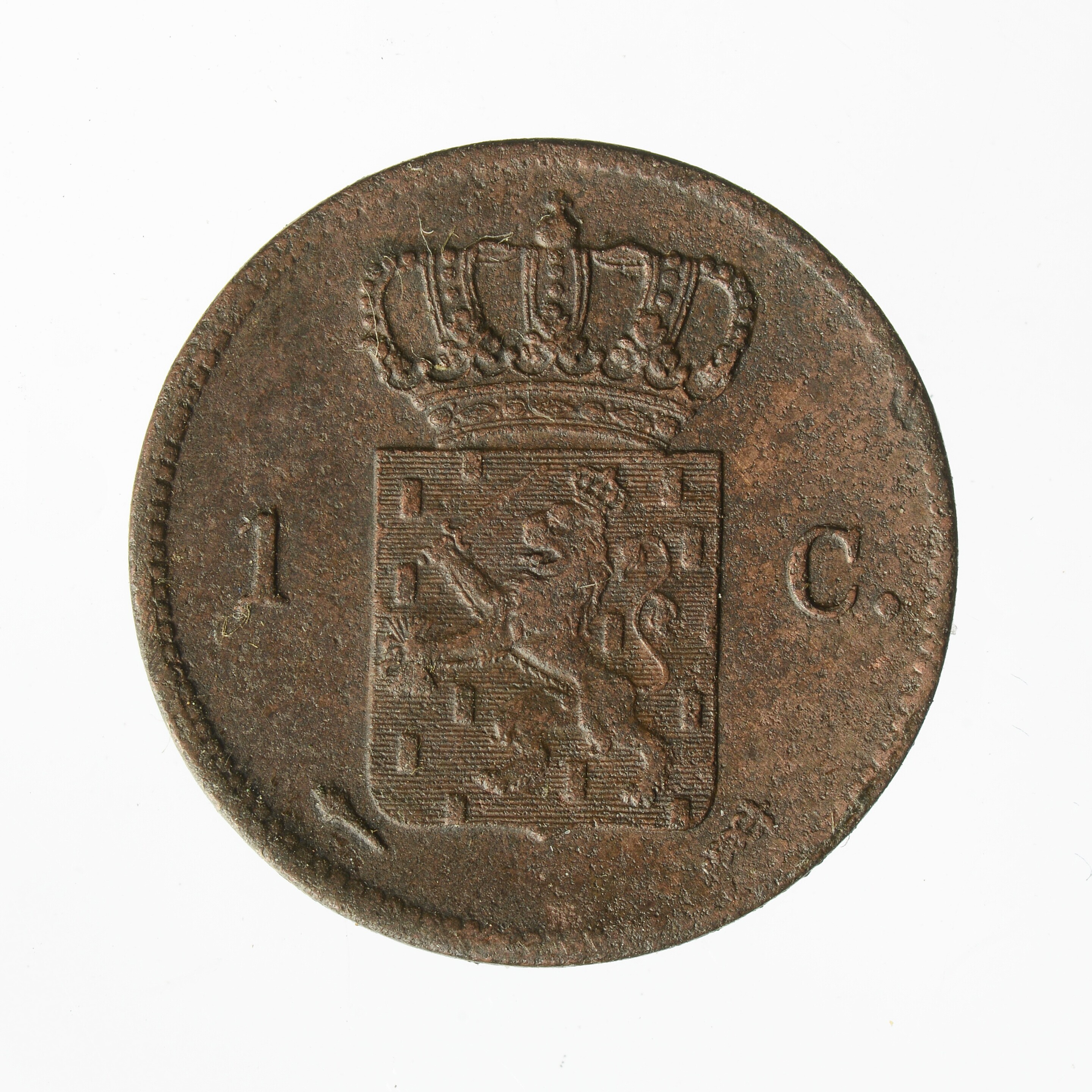 1 Cent; Nederland Koninkrijk (1813-heden); Willem I (1813-1840); vz.: gekroonde W met ter weerszijden 18 – 26; kz.: gekroond Nederlands wapen met ter weerszijden 1 - C., met onder het wapen fakkel en mercuriusstaf; muntplaats: Utrecht; gewicht: 3.73 gram