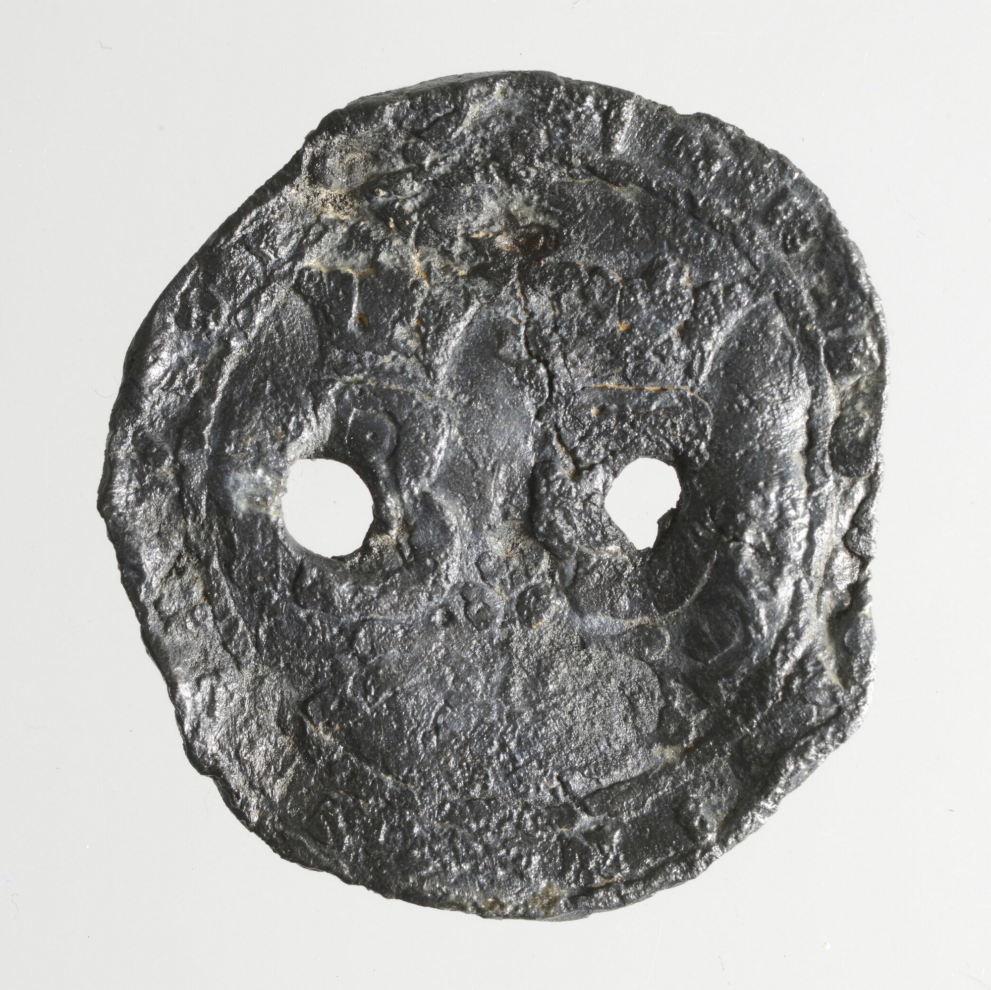 Textiellood; pb-tex; vz.: stempel slecht zichtbaar; kz.: ontbreekt; twee doorboringen; secundair gebruikt als snorrebot?