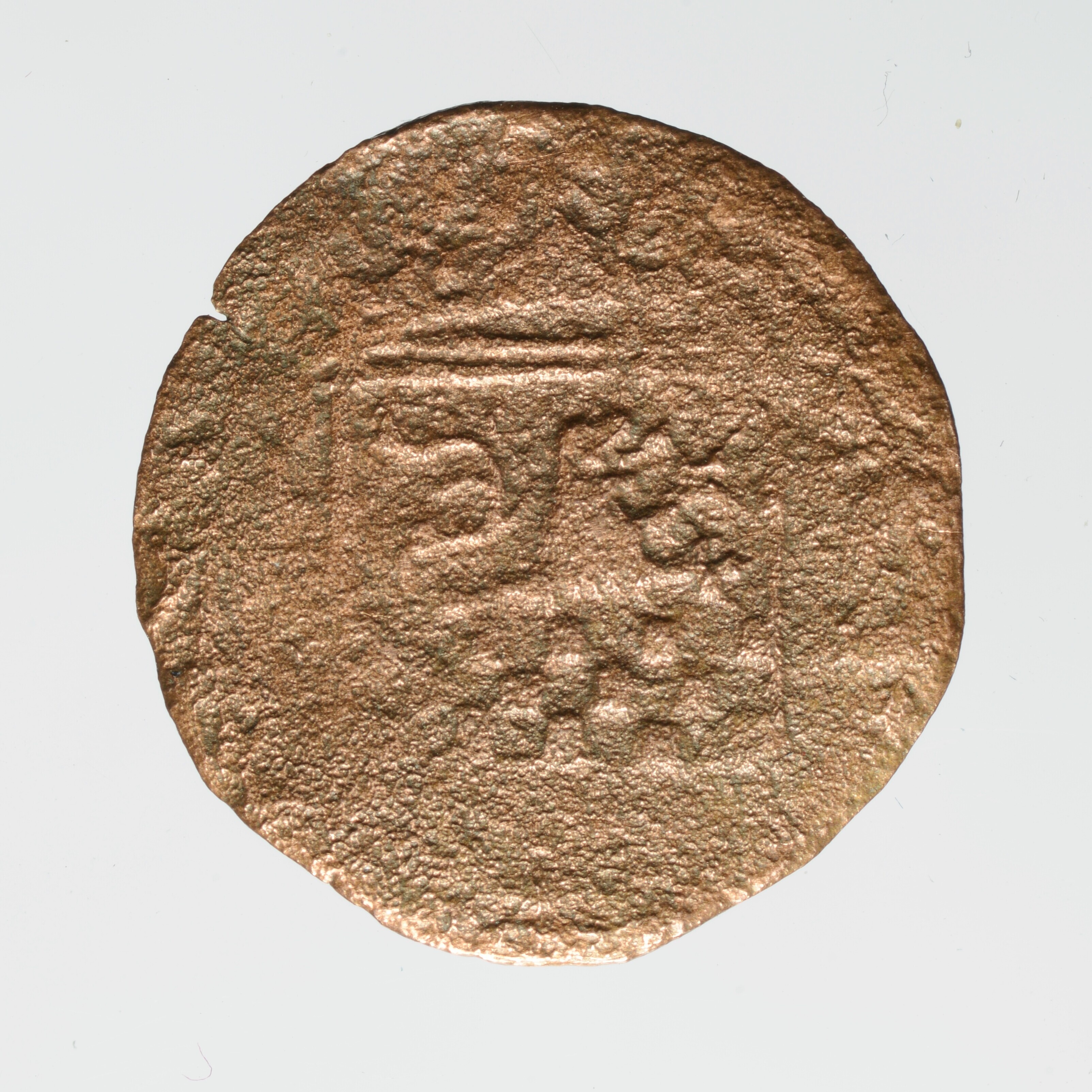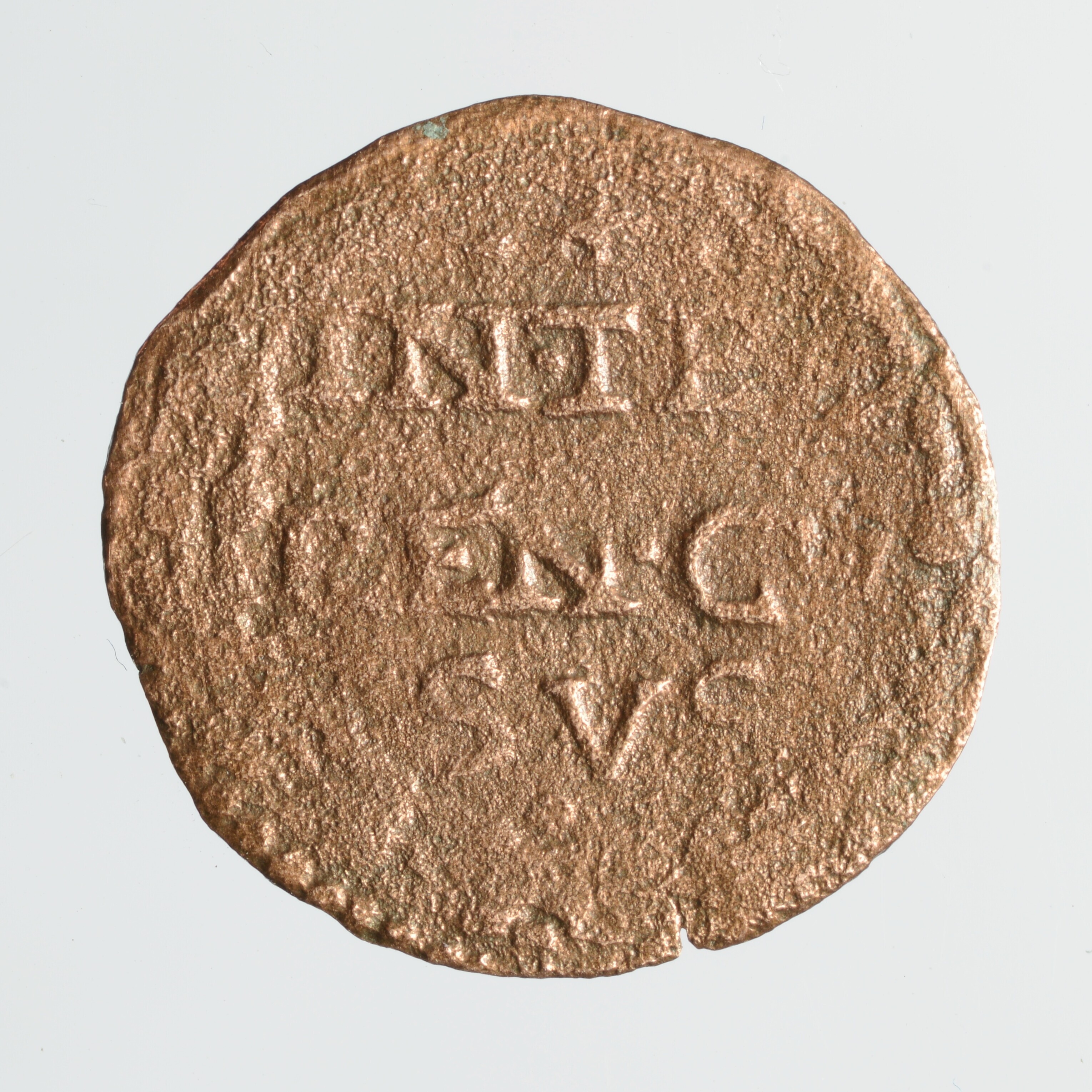 Duit; Abdijvorstendom Thorn (1150-1794); Anna van der Marck (1604-1631); vz.: Een tulpkrans met daarin .. / .IN THO / REN. CV / SVS; kz.: Gedeeltelijke tulpkrans om een gekroond wapenschild met hierin een klauwende leeuw achter kantelen; gewicht: 1.39 gram