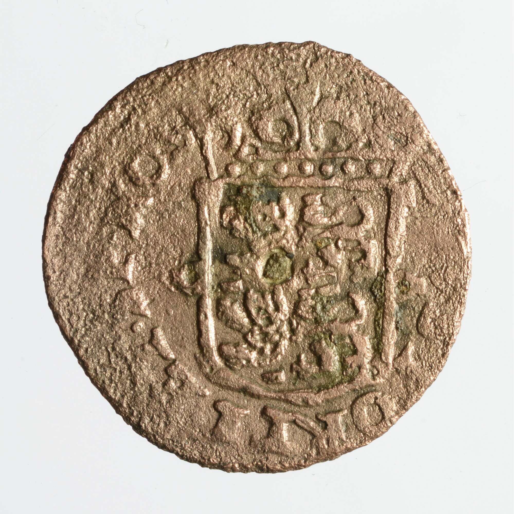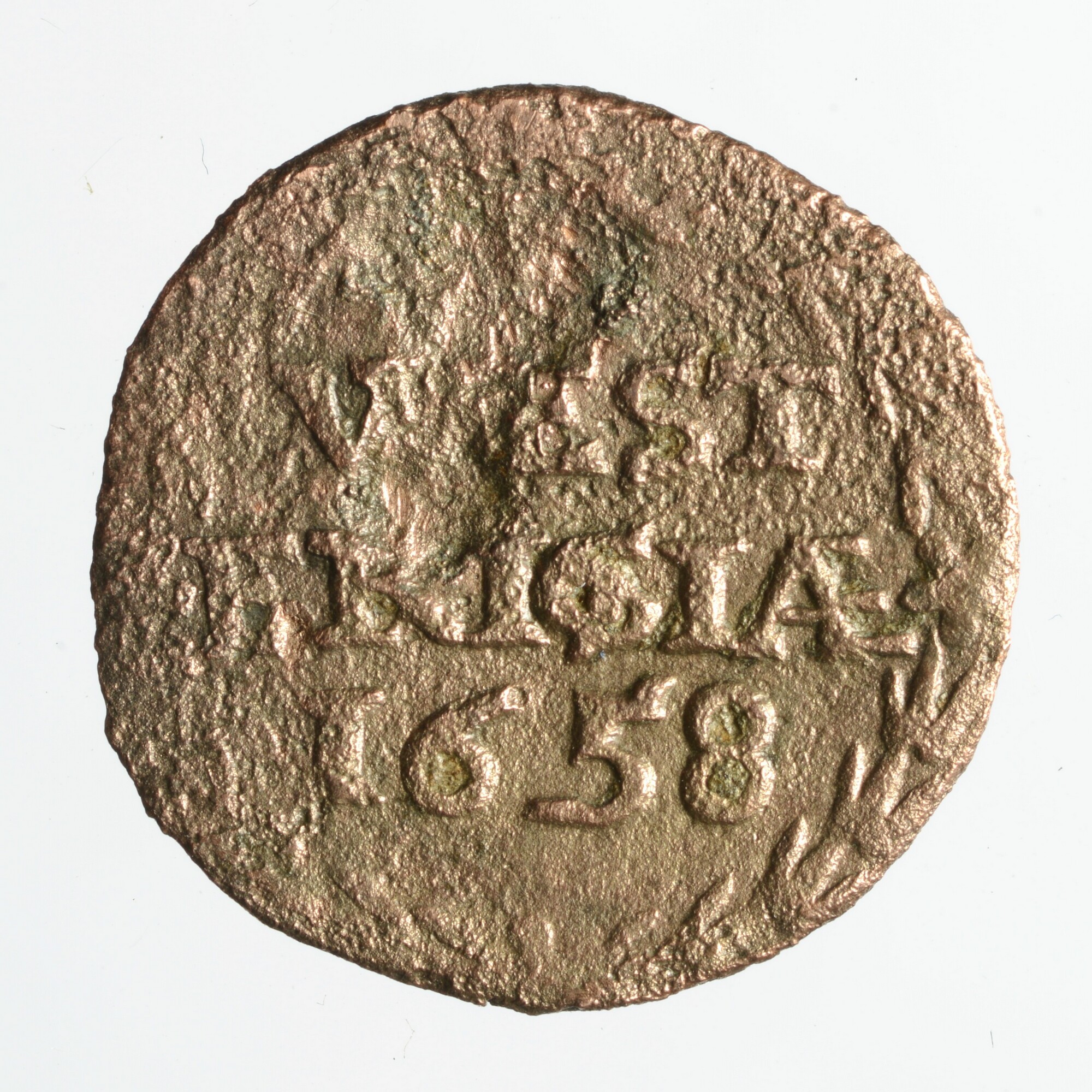 Duit West-Friesland; vz.: tulpkrans met daarin de tekst WEST FRISIAE in twee regels met daaronder het jaartal 1658; kz.: Gekroond wapenschild met het wapen van West-Friesland. De leeuwen hebben hun kop 'en face' gericht en de randtekst DEVS. FORTI. ET. SP. NOS; gewicht: 1.62 gram