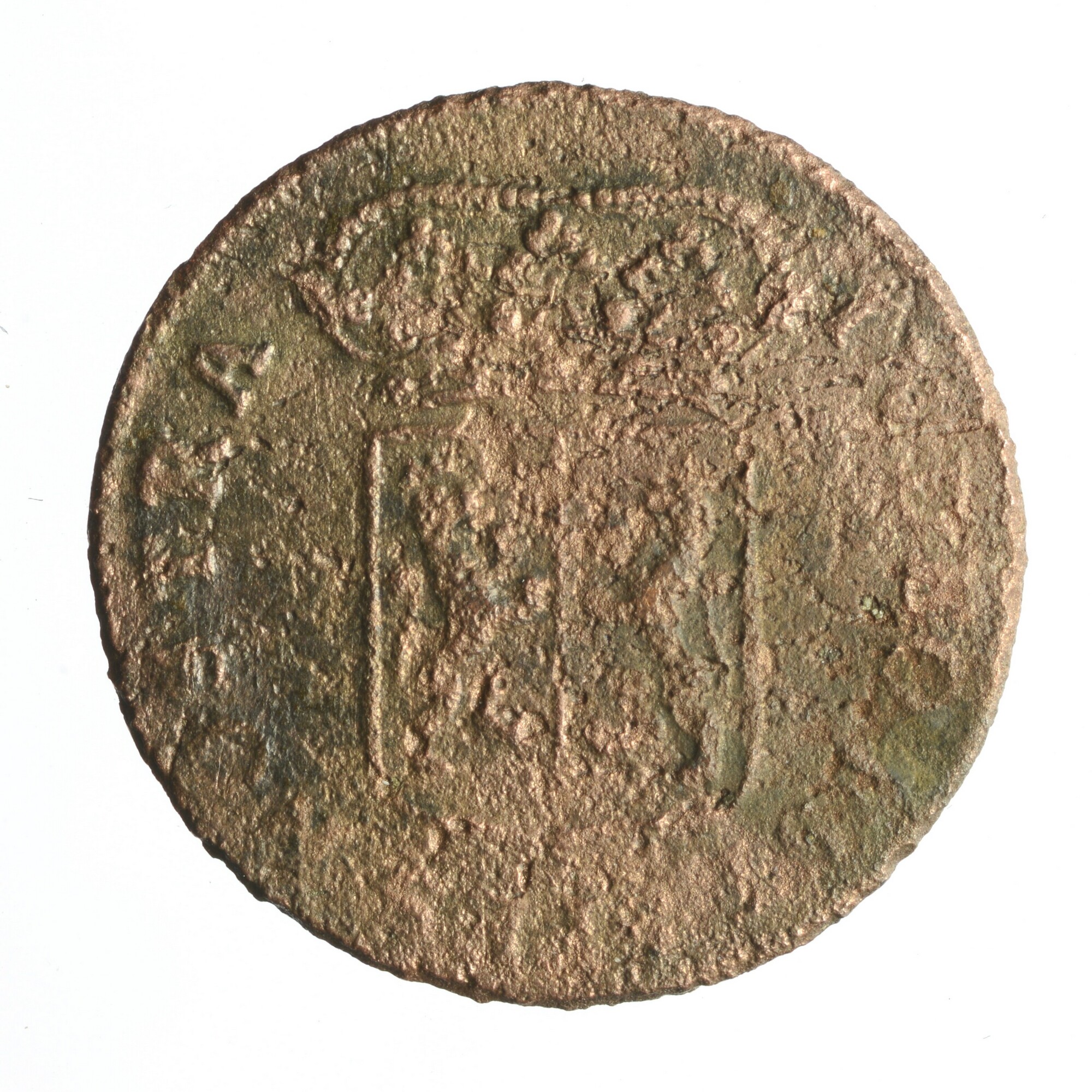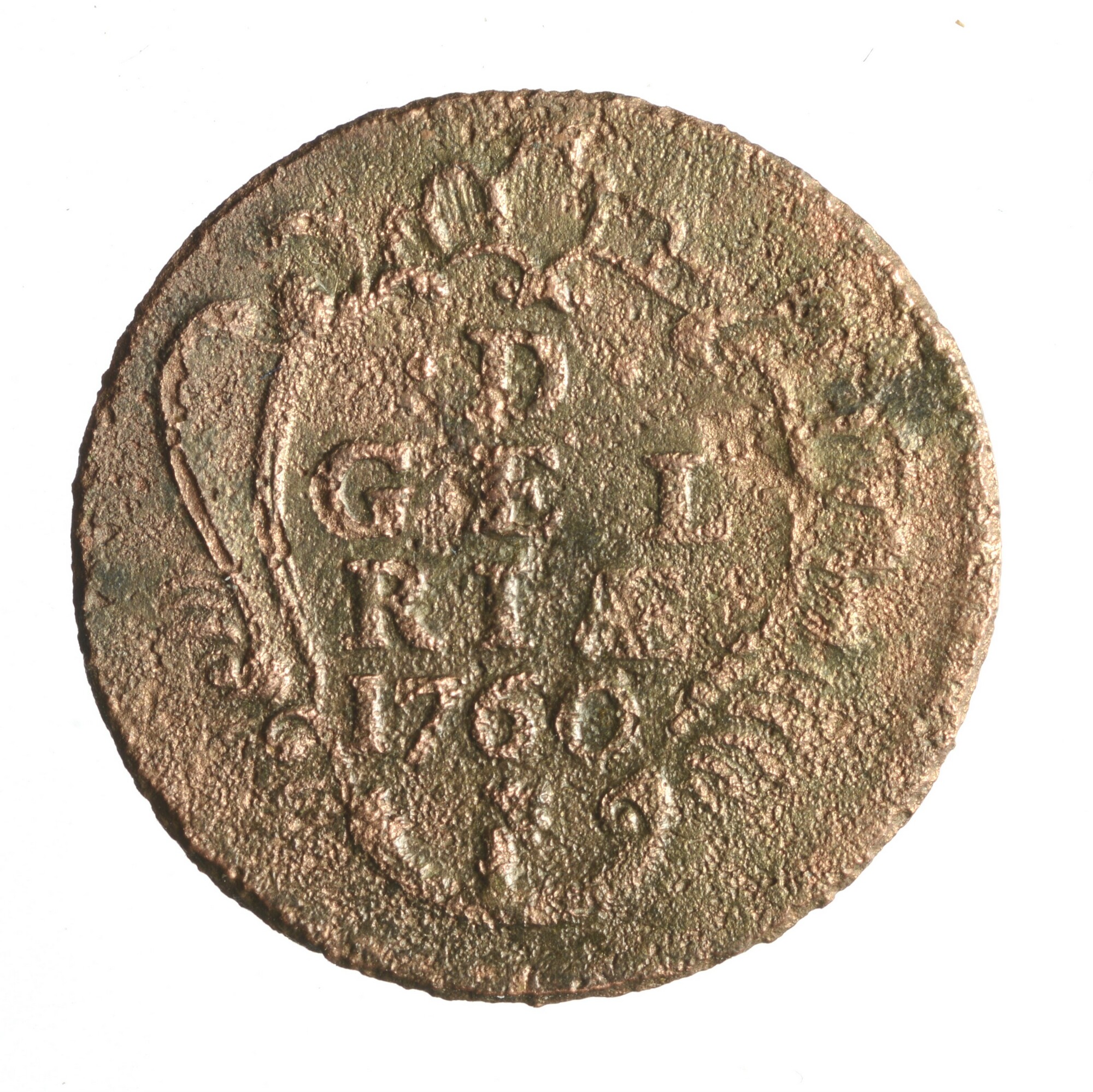 Duit; Gelderland Provincie (1581-1795); vz.: rococostijl versiering met daarin de tekst .D. GEL RIÆ in drie regels. Daaronder het jaartal 1760 en het muntmeesterteken afgeknotte boom; kz.: gekroond wapen van Gelderland en IN DEO. EST. SPES NOSTRA; gewicht: 2.59 gram