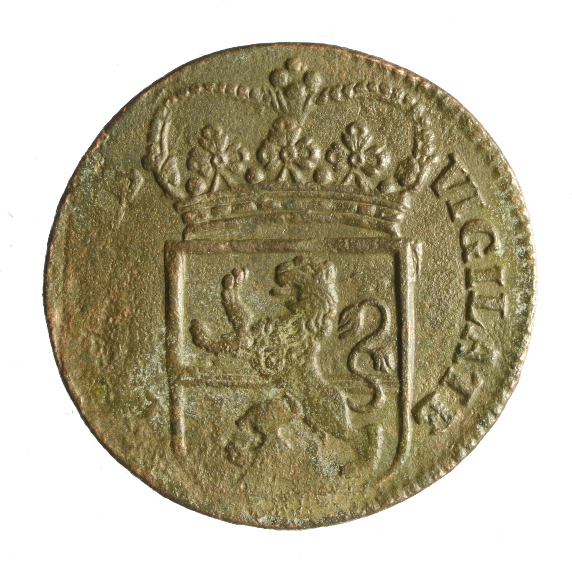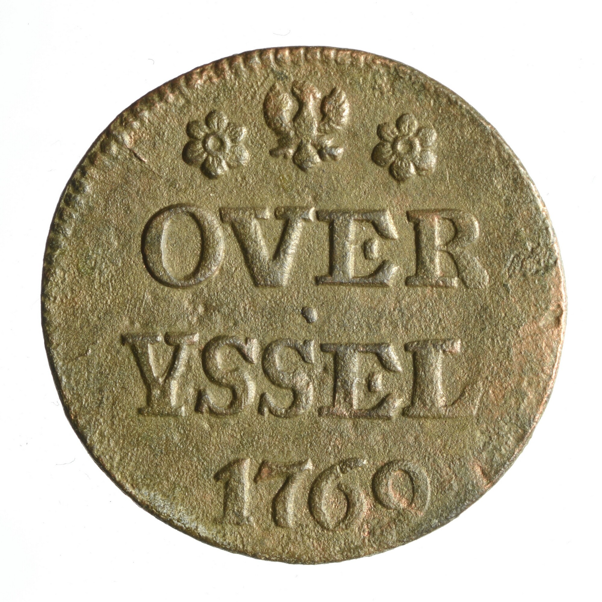 Duit; Overijssel Provincie (1581-1795); vz.: in vier regels: rozet (adelaar) rozet / OVER/ • / YSSEL / 1769•; kz.: gekroond wapenschild van Overijssel, met omschrift VIG[ILATE] ET O[RATE]; muntplaats: Kampen; gewicht: 2.59 gram