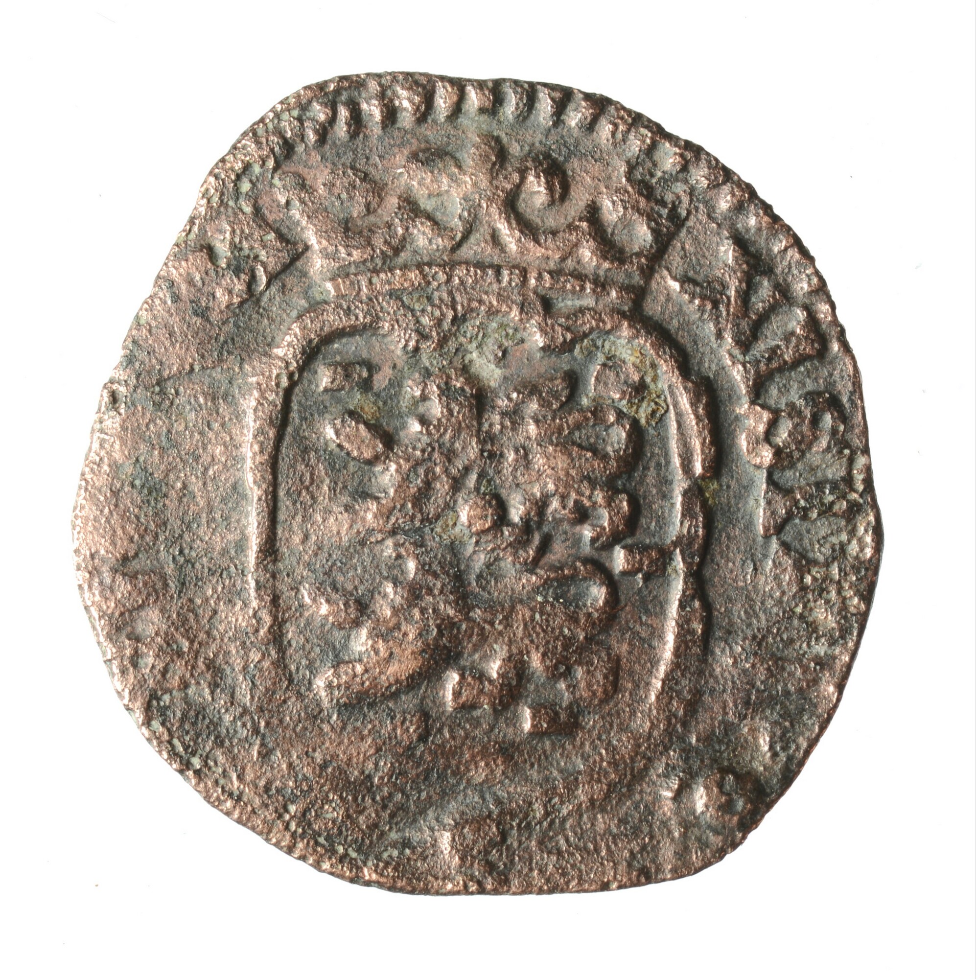 Duit; Friesland Provincie (1581-1795); vz.: in een bladerkrans in drie regels FRI / SIA / 1653; kz.: met open kroon gekroond en versierd wapenschild van Friesland, met omschrift NISI•DNS• •[NOBISCVM]; muntplaats: Leeuwarden; gewicht: 1.76 gram